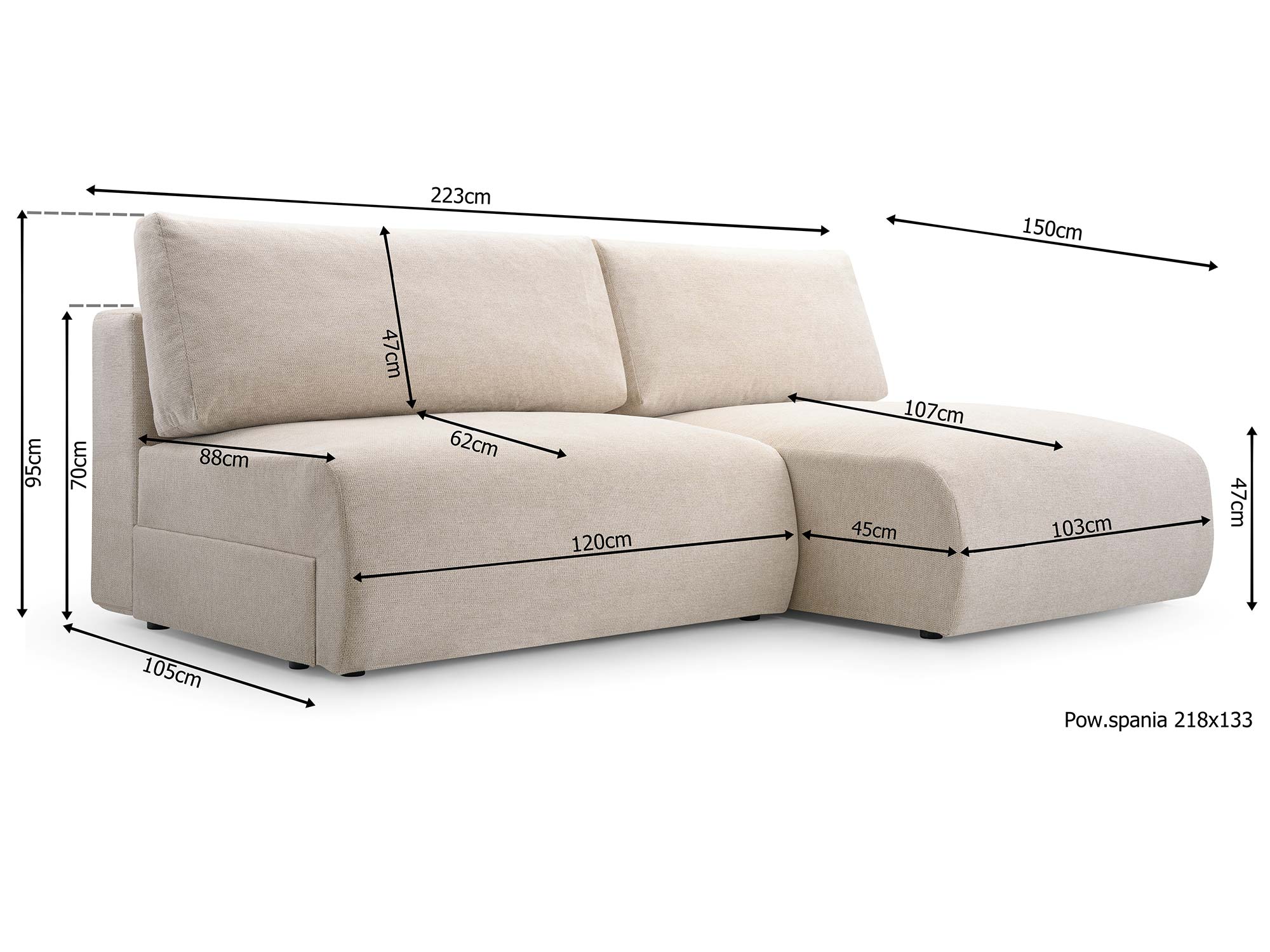 Jednak wygląd to nie wszystko – w Bisko znajdziesz funkcję spania z prostym w obsłudze systemem DL. Wystarczy kilka ruchów, aby przekształcić wygodną kanapę w pełnowymiarowe łóżko. Powierzchnia spania 218×133 cm zapewni komfort zarówno Tobie, jak i Twoim gościom. To idealna opcja, gdy potrzebujesz dodatkowego miejsca do spania, ale nie chcesz rezygnować z elegancji salonu.