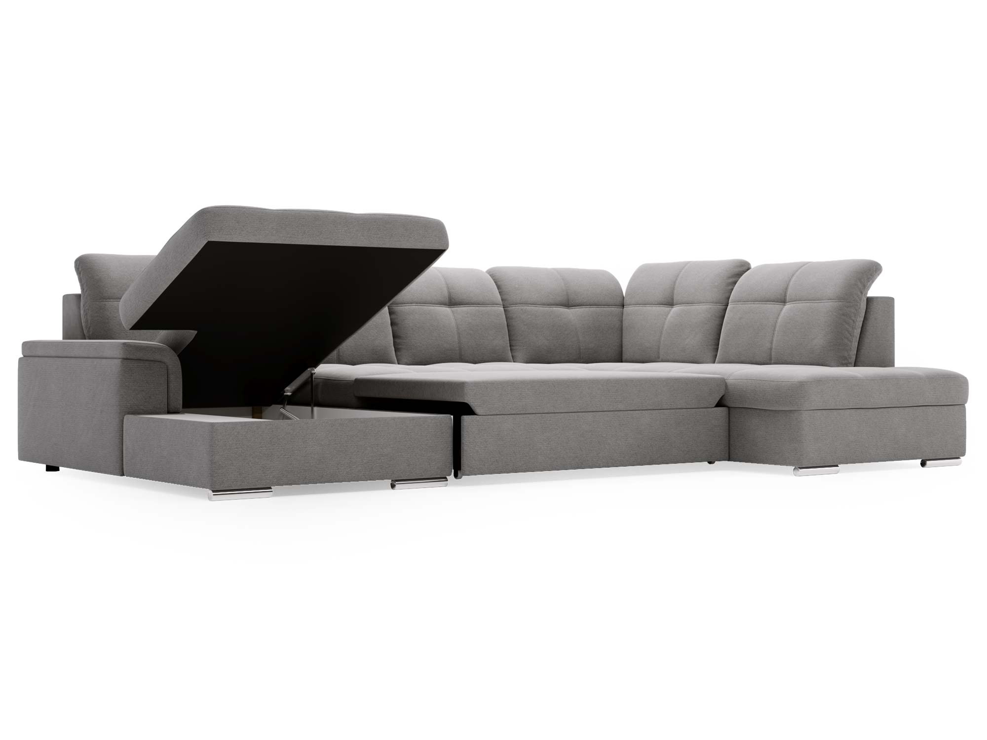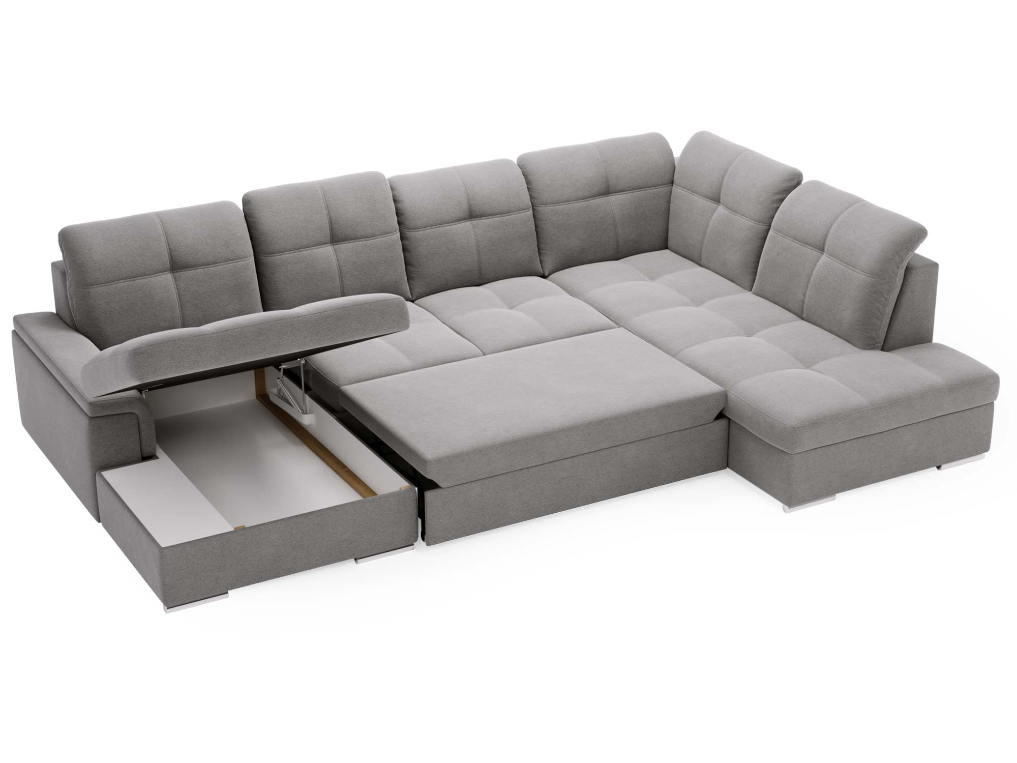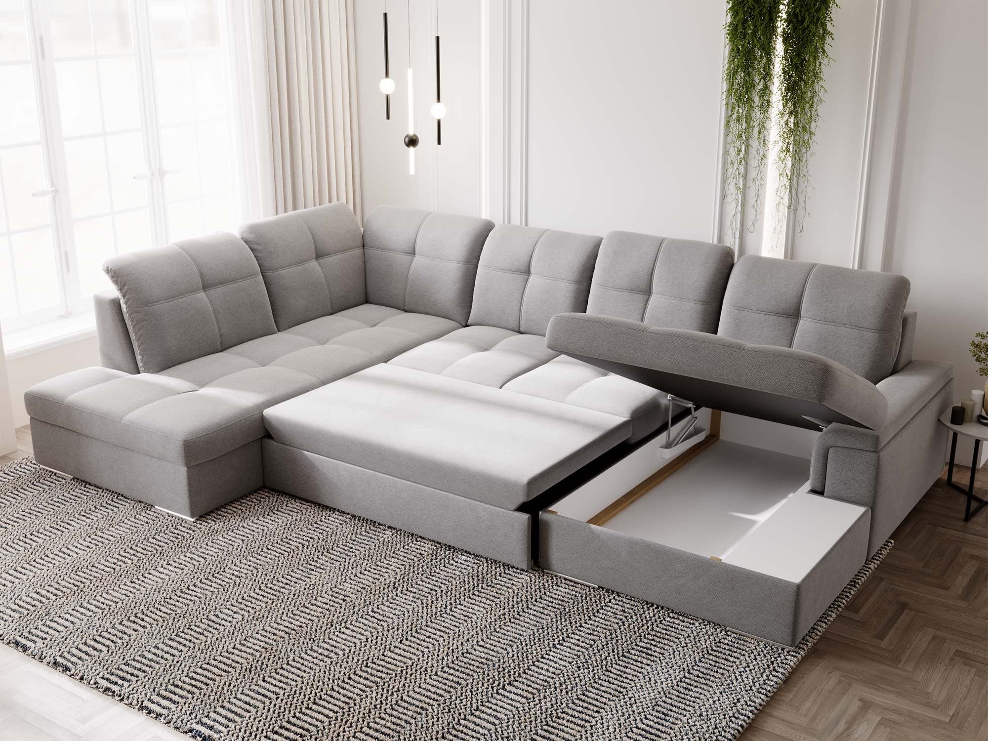Szary narożnik z funkcją spania i dwoma pojemnikami na pościel