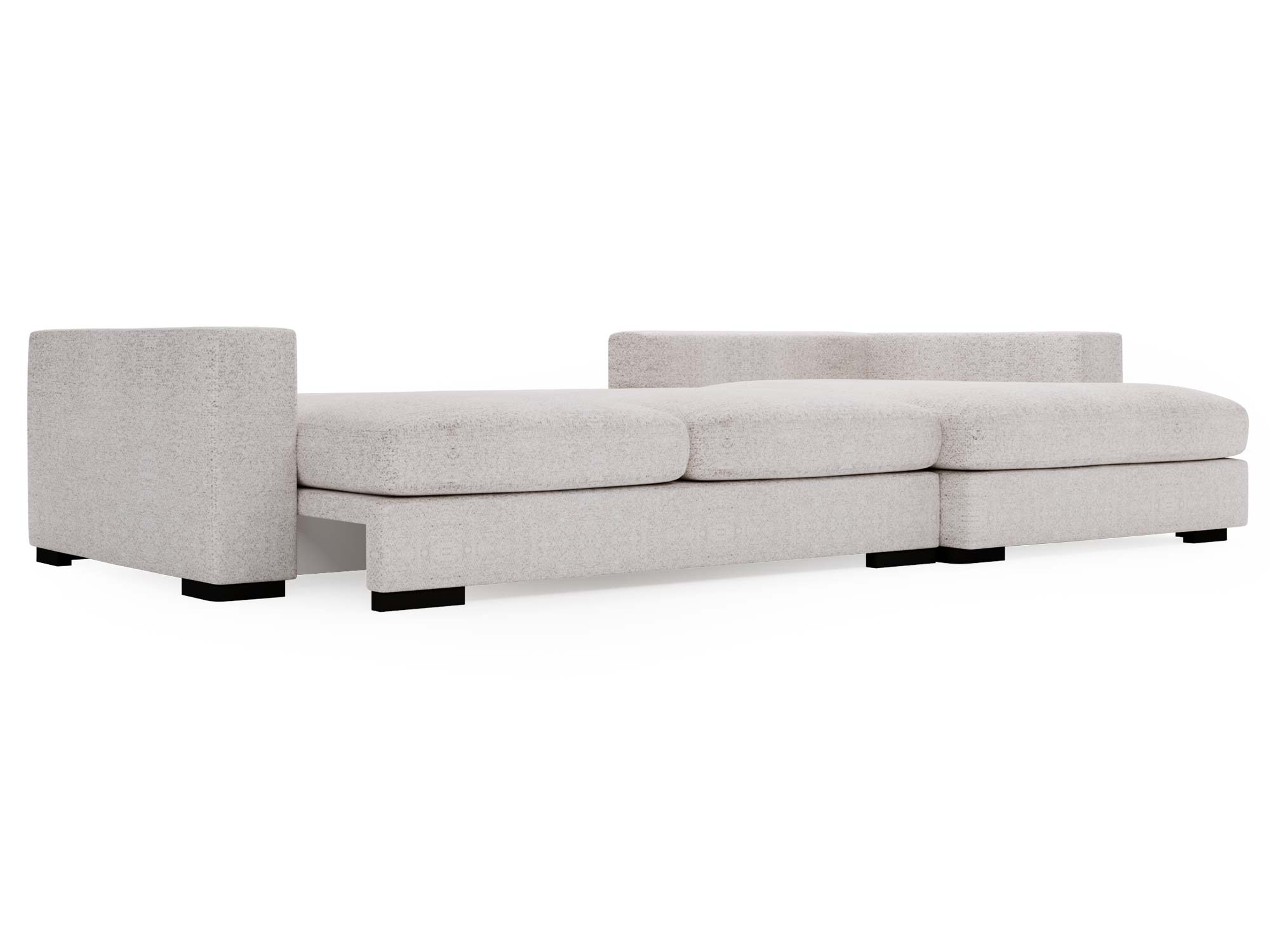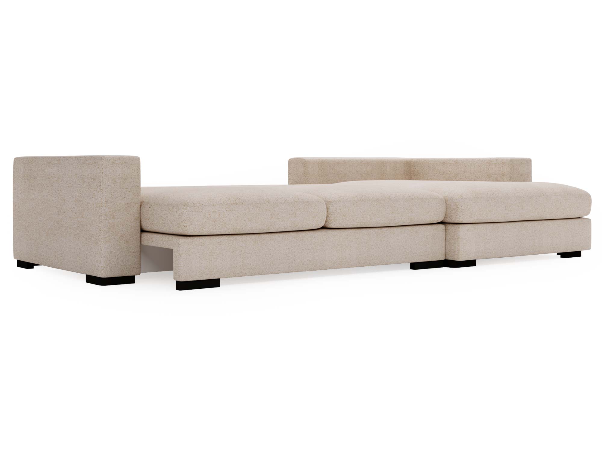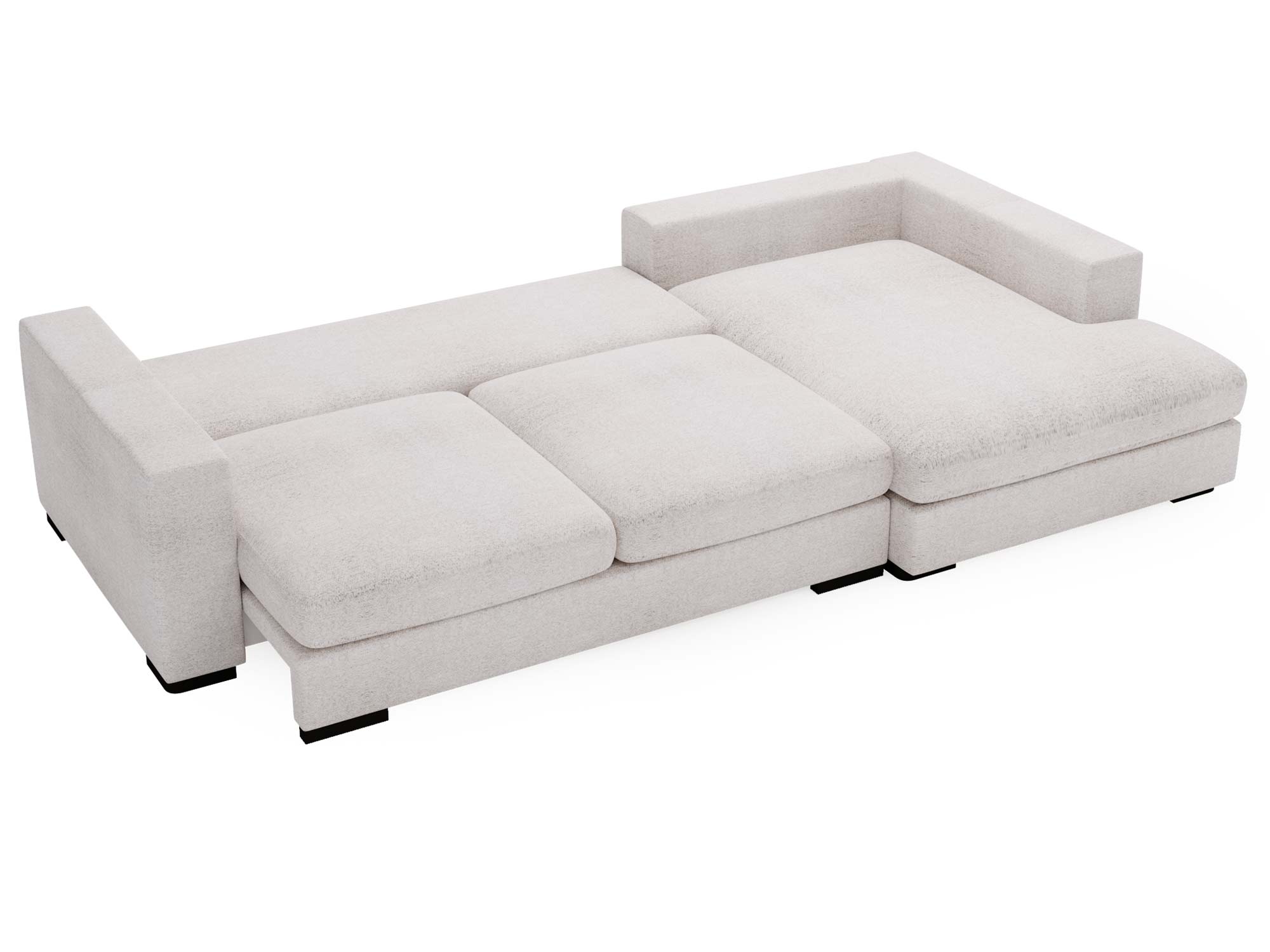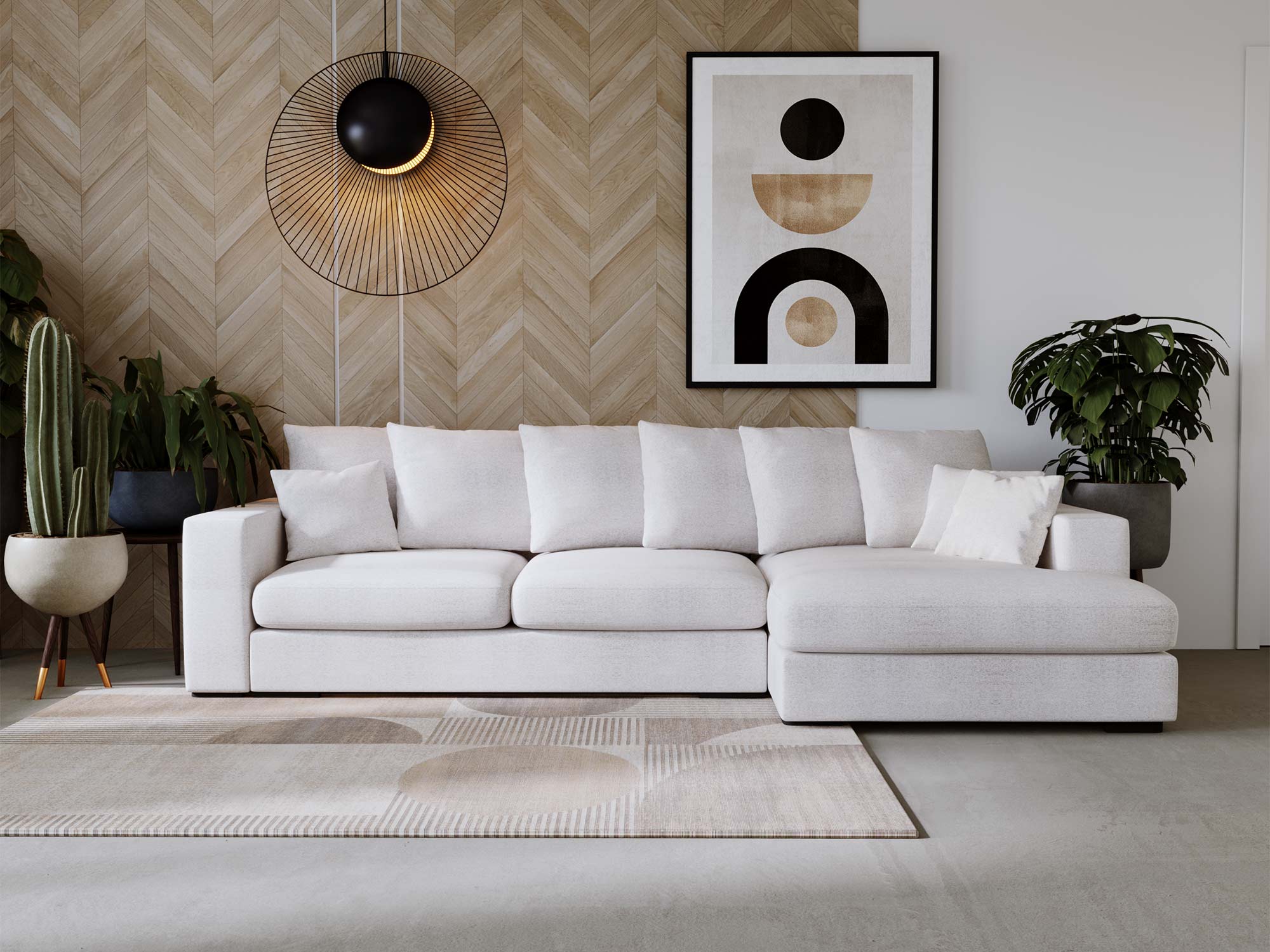Sofa jasnobeżowa z dużym szezlongiem i tapicerką typu boucle