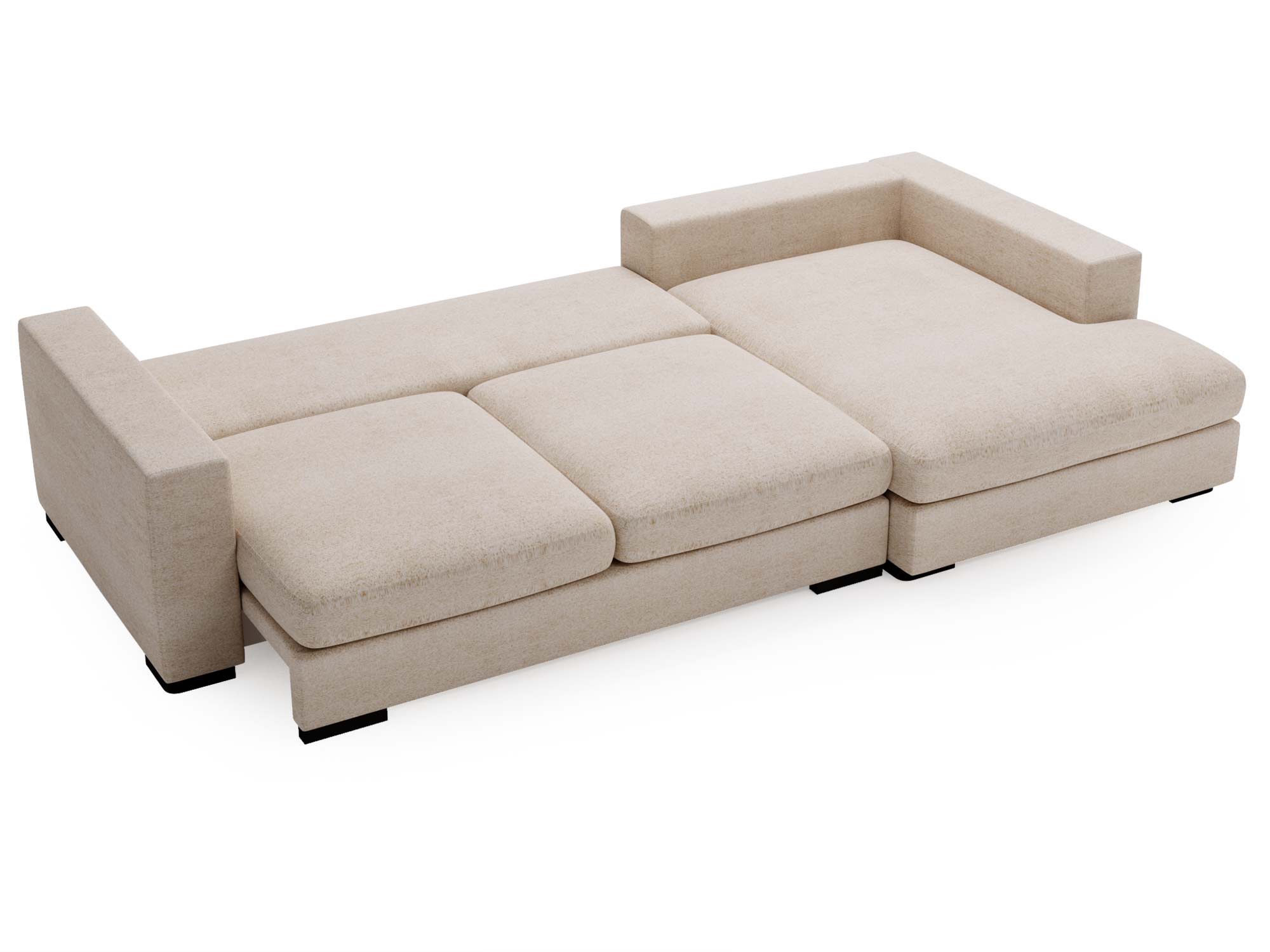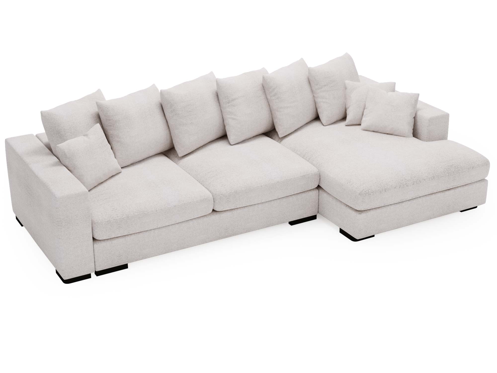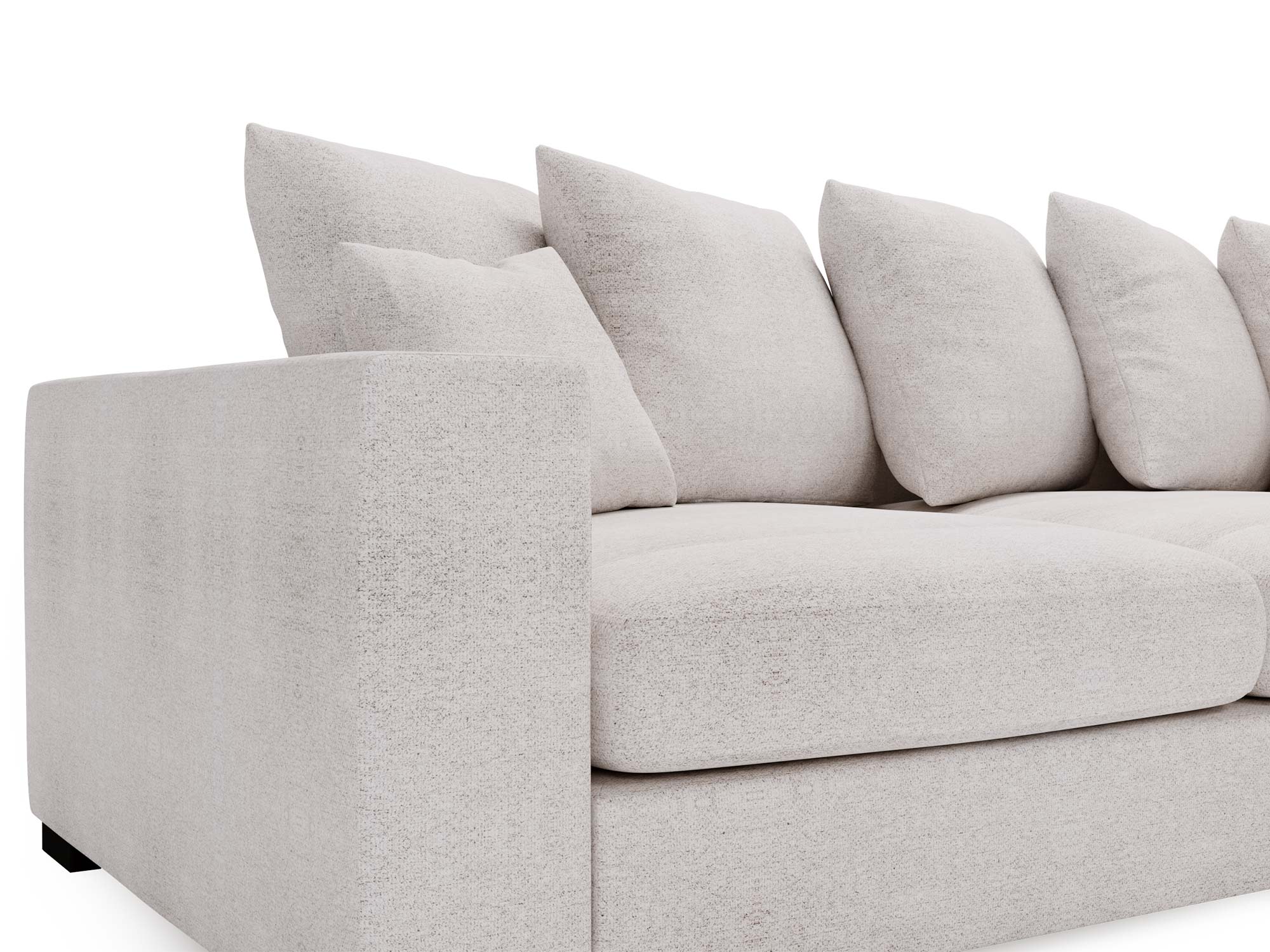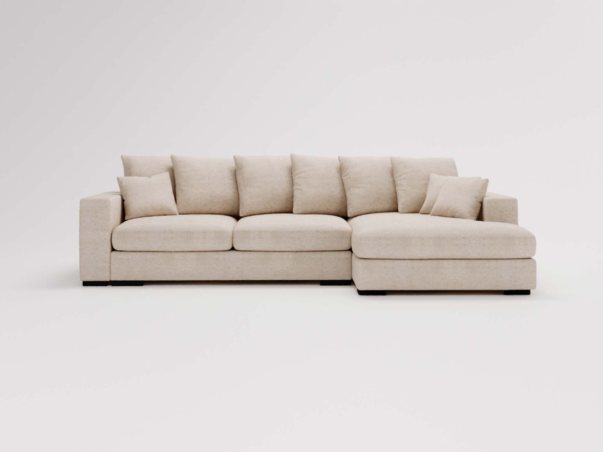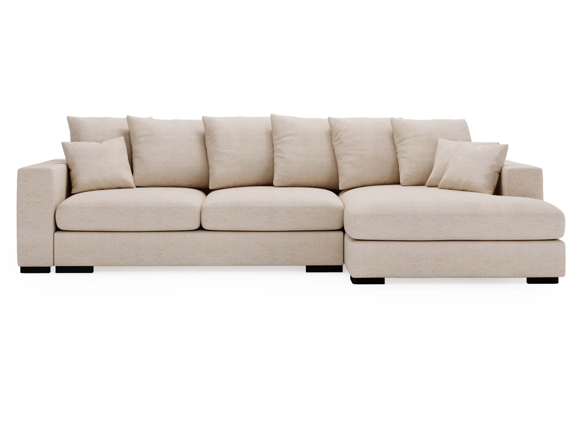 Beżowa sofa narożna z dużymi poduszkami i klasycznym stylem