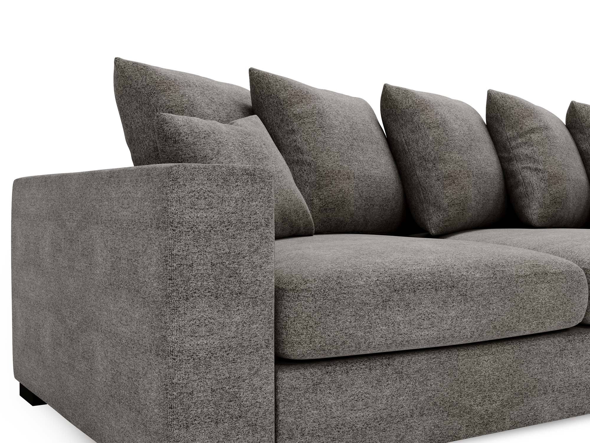 Narożnik szary z głębokim siedziskiem i miękkimi poduszkami w salonie