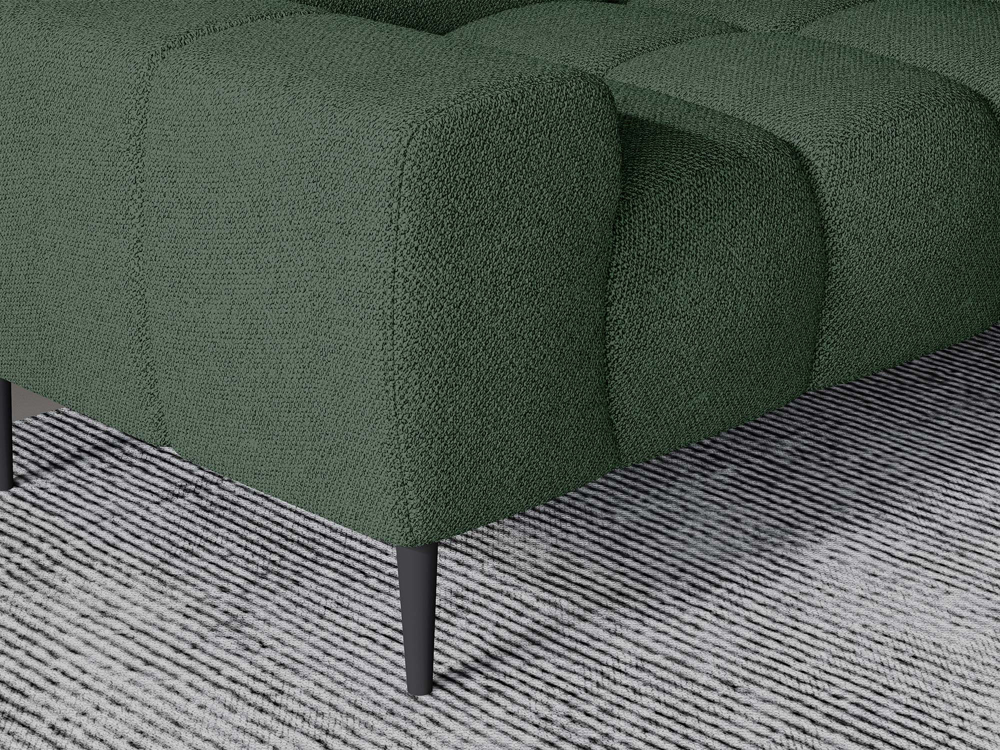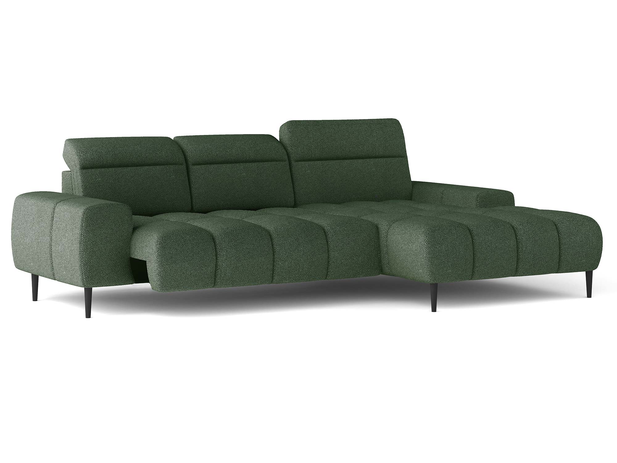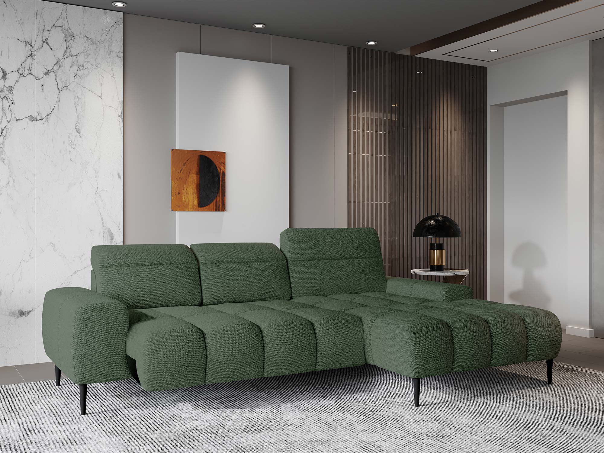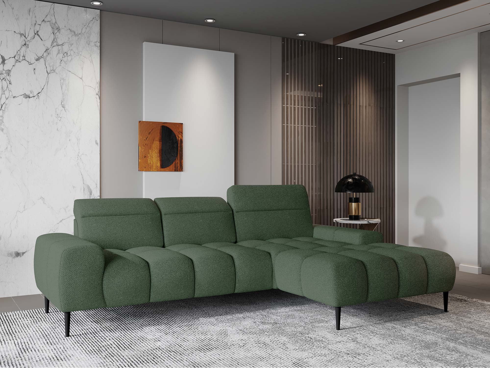 Swoboda aranżacji. Tapicerowany tył umożliwia ekspozycję wyspową, a wybór układu prawy/lewy pozwala dopasować narożnik do planu pomieszczenia. Metalowe, czarne nogi (ok. 15 cm) ułatwiają sprzątanie i nadają bryle lekkości.
