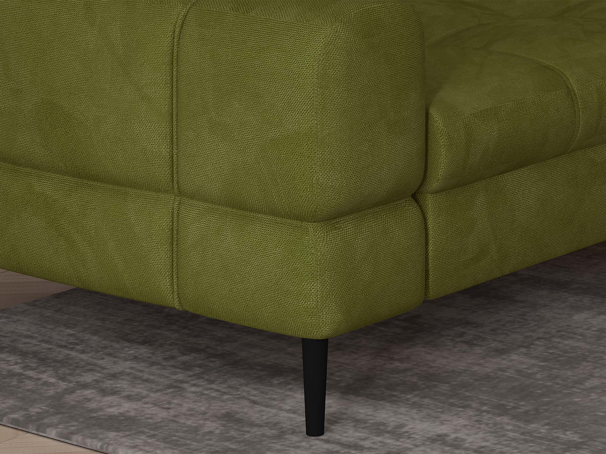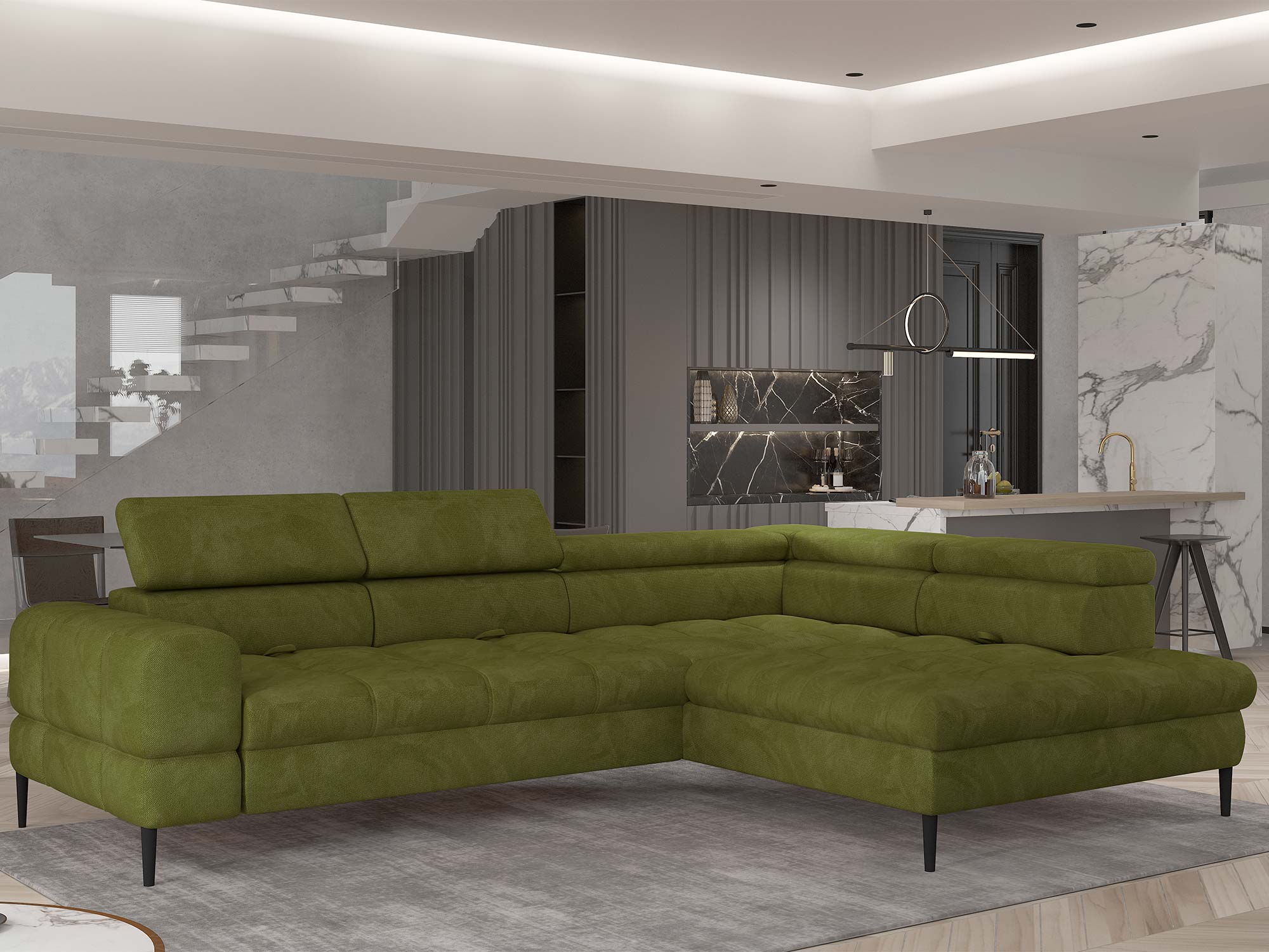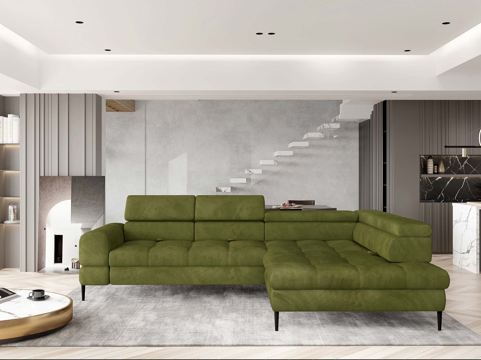 Architektura bryły. Proporcje modelu VOSS (ok. 285 × 218 cm) porządkują przestrzeń i sprzyjają integracji domowników. Subtelne przeszycia i geometryczne linie podkreślają nowoczesny charakter, a niska linia oparć zapewnia lekkość wizualną także w mniejszych przestrzeniach otwartych.