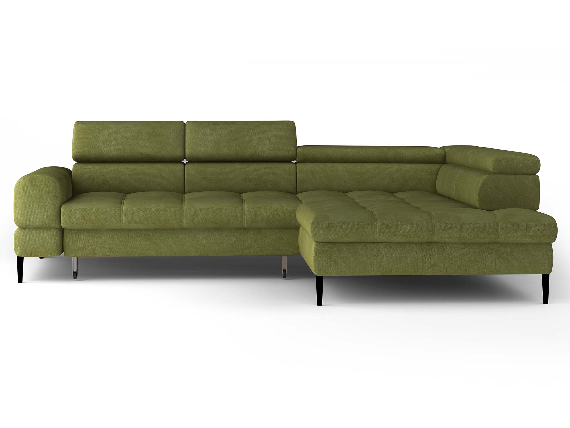 Detale użytkowe. Tapicerowany tył i moduł „Kubuś” pozwalają wyeksponować narożnik wyspowo. Metalowe nogi 14 cm dodają elegancji i ułatwiają sprzątanie (wjedzie większość robotów). Model dostępny w układzie prawym/lewym i dostarczany jako mebel do montażu – zorganizujesz wniesienie i ustawienie bez zbędnych utrudnień.