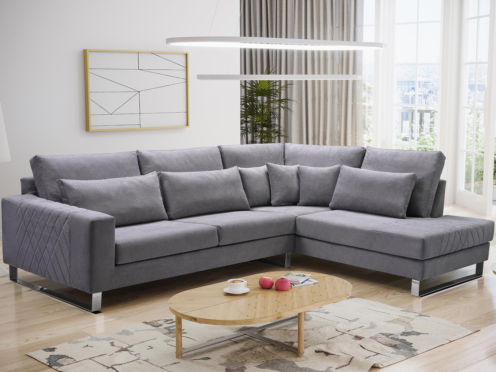 Przede wszystkim narożnik z zagłówkami nóżkami chrom CHARLES to modernistyczny model, który można zakupić w wersji prawostronnej lub lewostronnej do wyboru. Co więcej pozwoli to idealnie dopasować go do układu oraz metrażu wnętrza. Ponadto narożnik przyciąga uwagę swoim niepowtarzalnym designem, posiada dekoracyjne poduszki oraz przeszycia na bokach, które dodają mu stylowego charakteru. Dodatkowo całość dopełniają eleganckie metalowe nóżki w kolorze chromu. Zobacz również dostępne w naszym sklepie inne modele narożników, które na pewno świetnie zaprezentują się w Twoim salonie.
