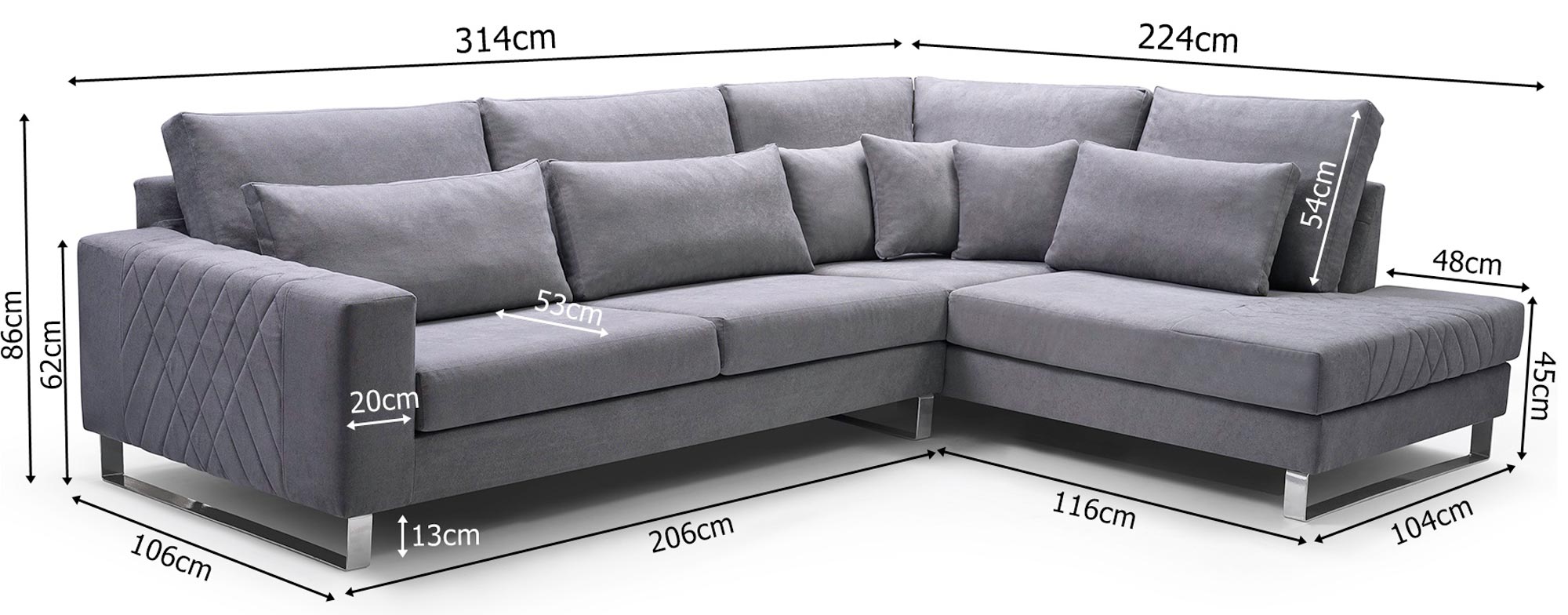 Narożnik z Zagłówkami Nóżkami Chrom szary wymiary CHARLES