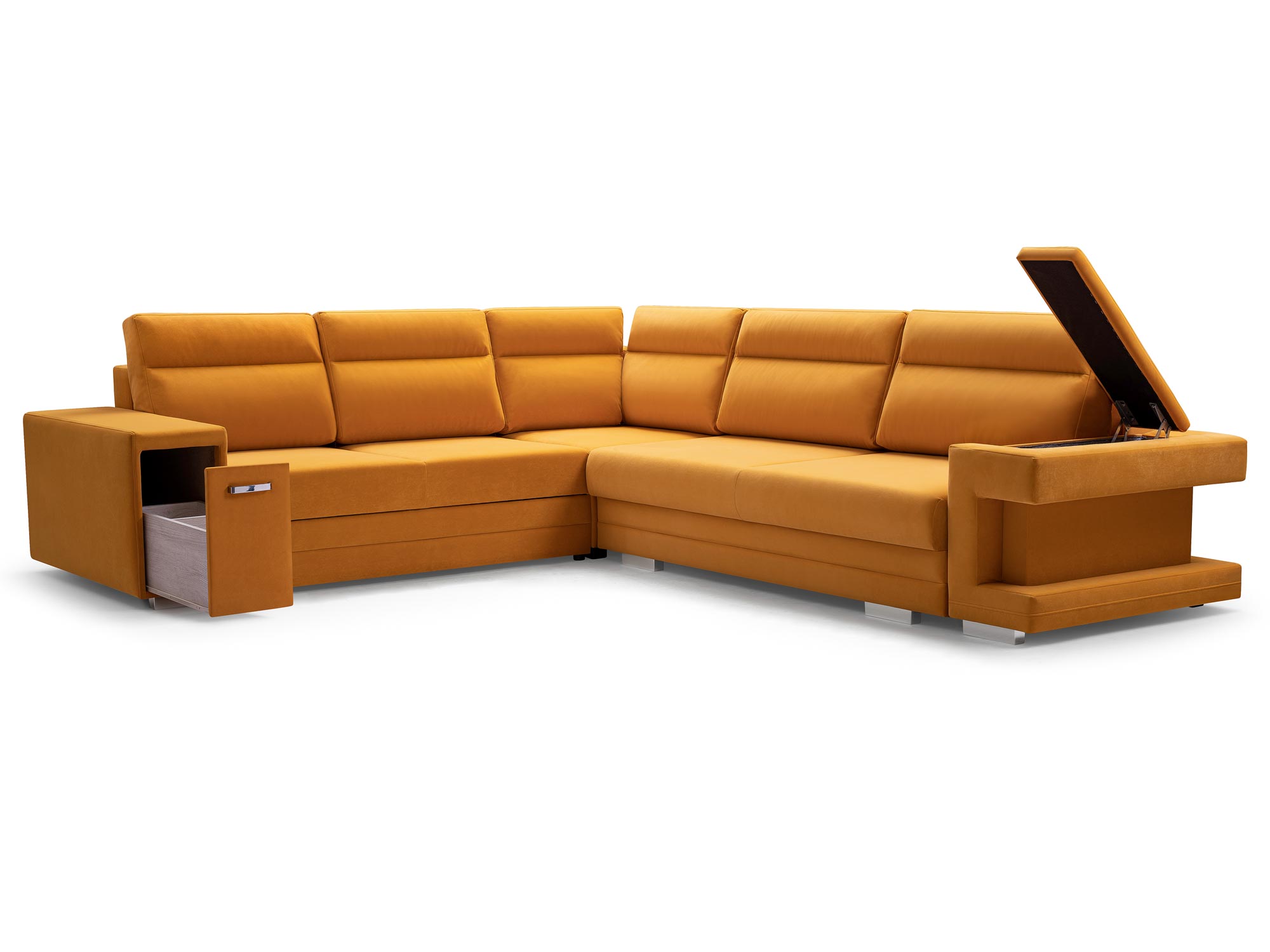 Przede wszystkim narożnik z funkcją spania codziennego ZENO można zakupić w wersji prawo- lub lewostronnej do wyboru. Pozwoli to idealnie dostosować go do kształtu i wymiarów aranżowanego pomieszczenia. Co więcej model ZENO posiada funkcją spania, wyposażono go także w automat MOS ułatwiający rozkładanie. Dodatkowo pod siedziskiem znajdują się dwa pakowne pojemniki na pościel, koce, poduszki itp. Warto też zwrócić uwagę na to że model ten został wyposażony w praktyczne wbudowane schowki – jeden w formie wysuwanej szuflady, a drugi umieszczony w jednym z podłokietników. Sprawdź dostępne w naszej ofercie inne modele narożników do salonu.