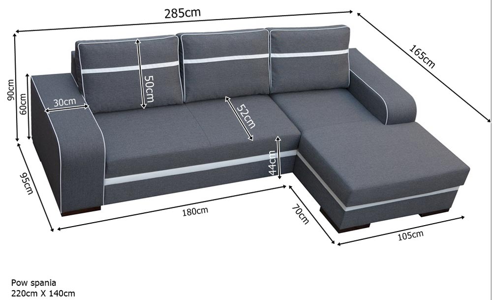 - Szerokość: 285 cm – Wysokość: 90 cm – Głębokość: 165 cm