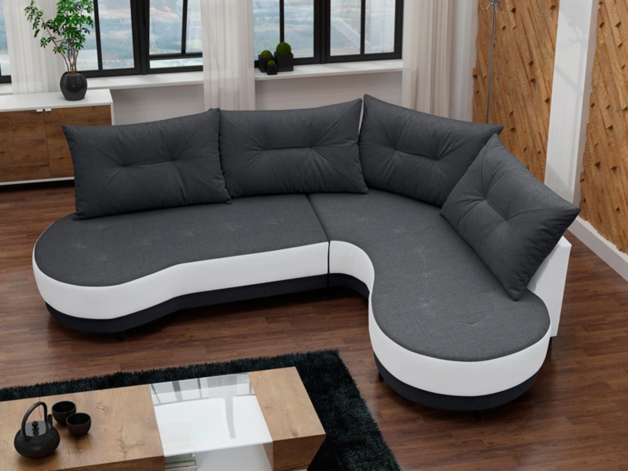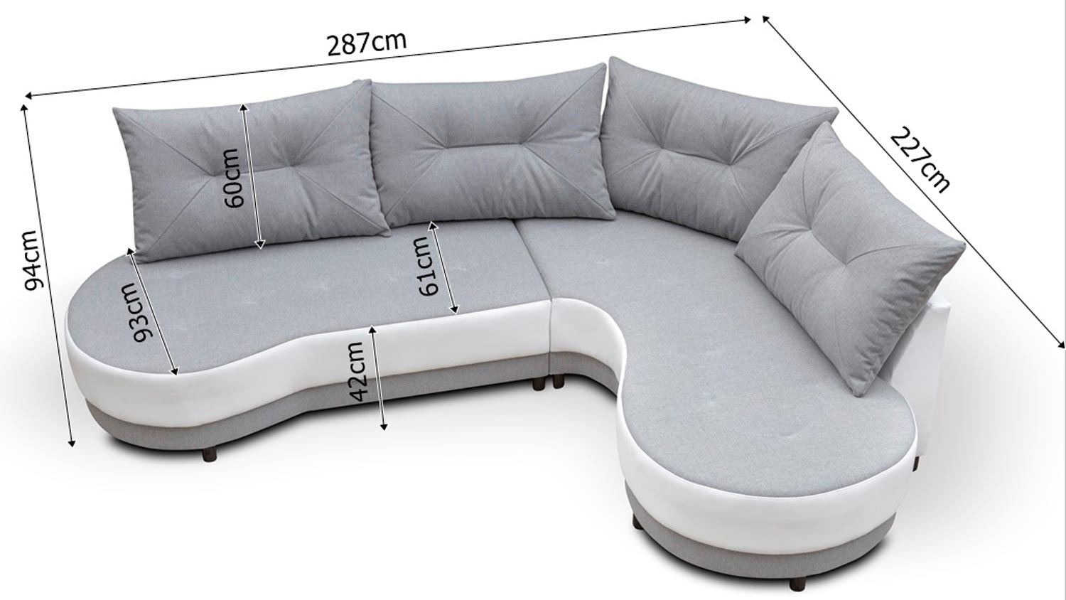 Po pierwsze półokrągły narożnik MELANIE posiada w zestawie 4 ozdobne poduszki z dekoracyjnym pikowaniem. Co więcej odkreślają one dodatkowo nowoczesną estetykę mebla i zapewniają komfort użytkowania. Ponadto ten stylowy model wypełniony jest sprężyną falistą i pianką tapicerską T-30, dzięki czemu ma odpowiednią elastyczność i jest odporny na zniekształcenia.