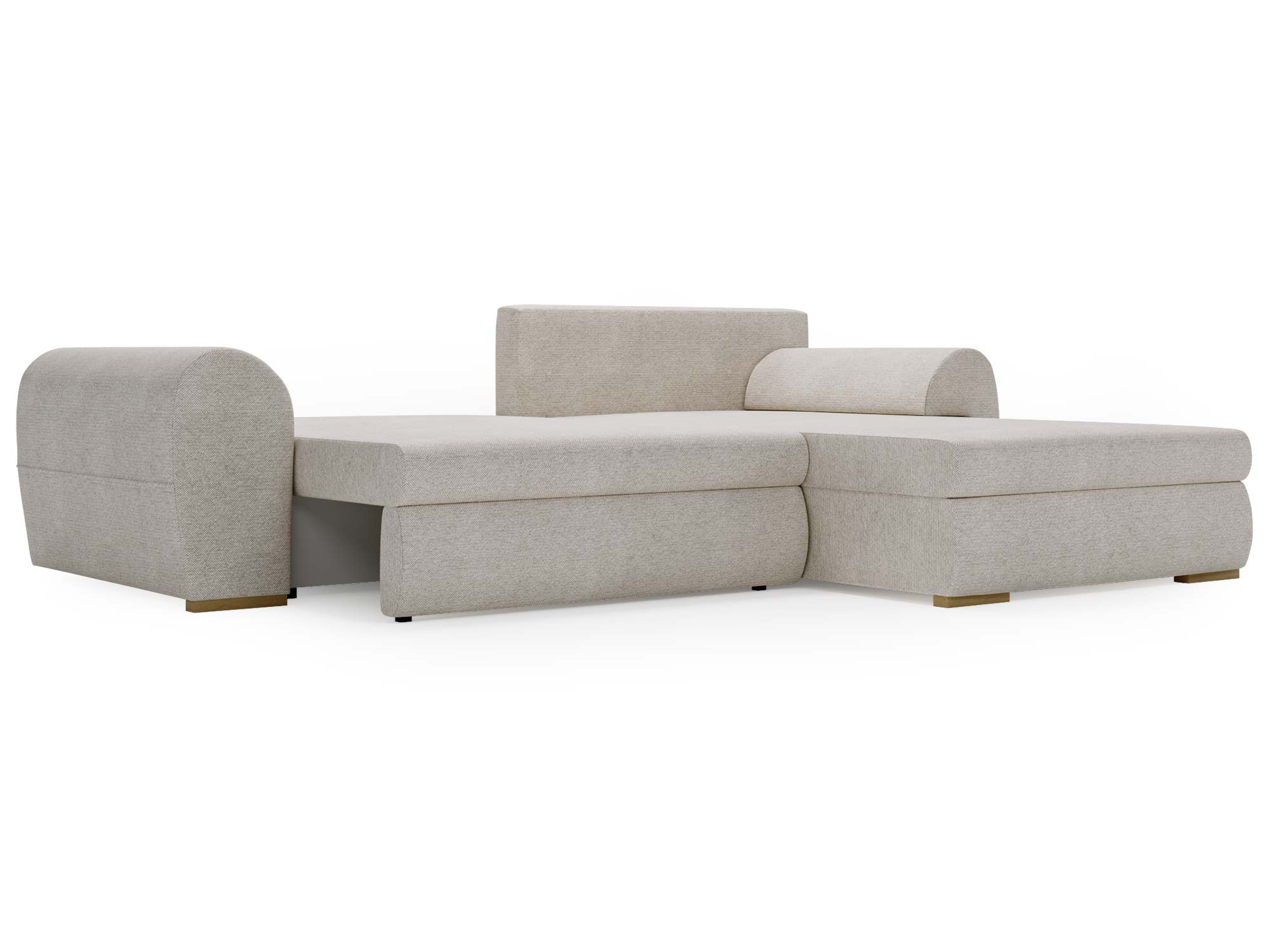 Nowoczesny narożnik beżowy z funkcją spania i wysokimi poduszkami