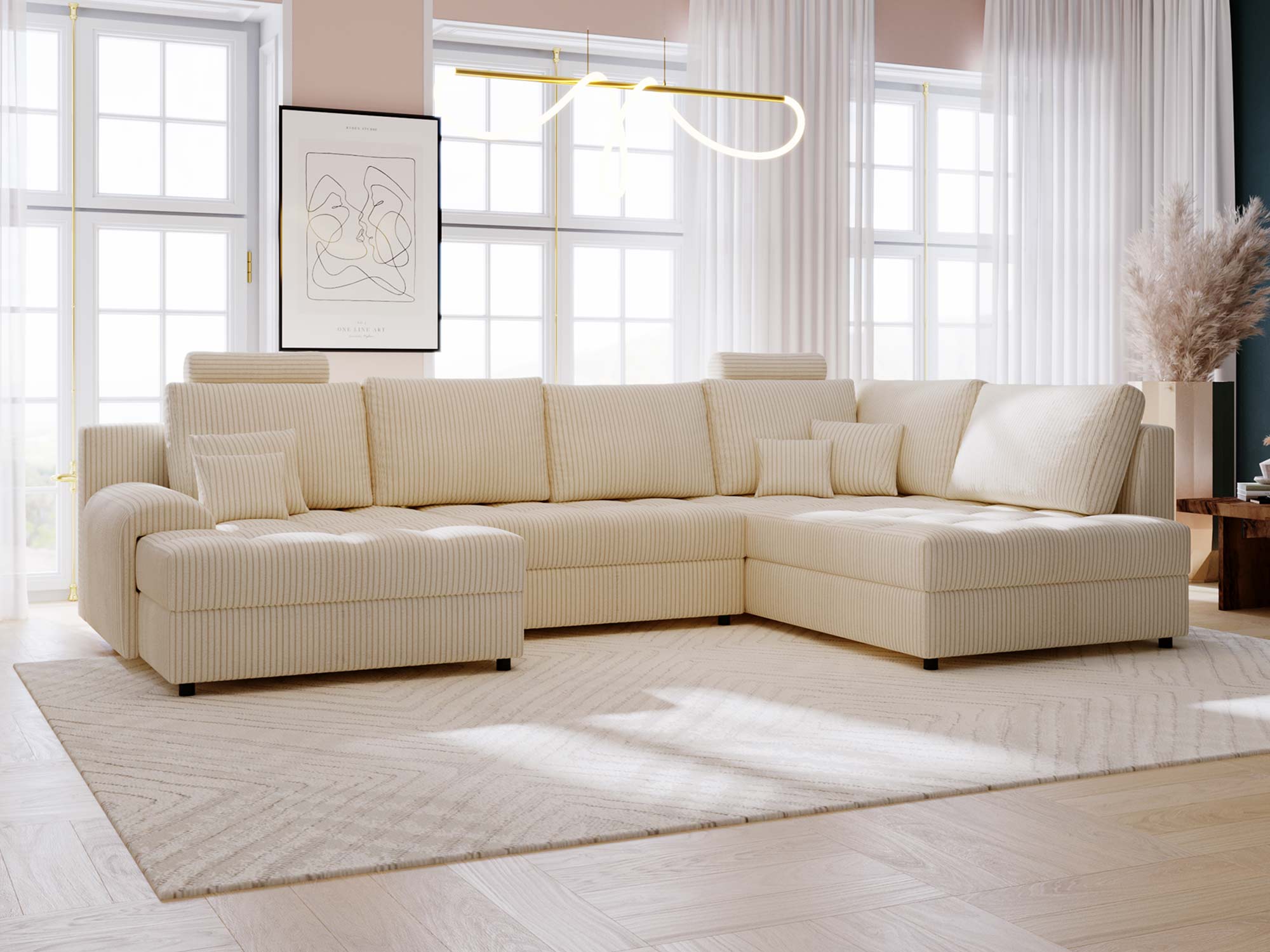 Piaskowy narożnik sztruksowy w nowoczesnym wnętrzu z jasnym dywanem