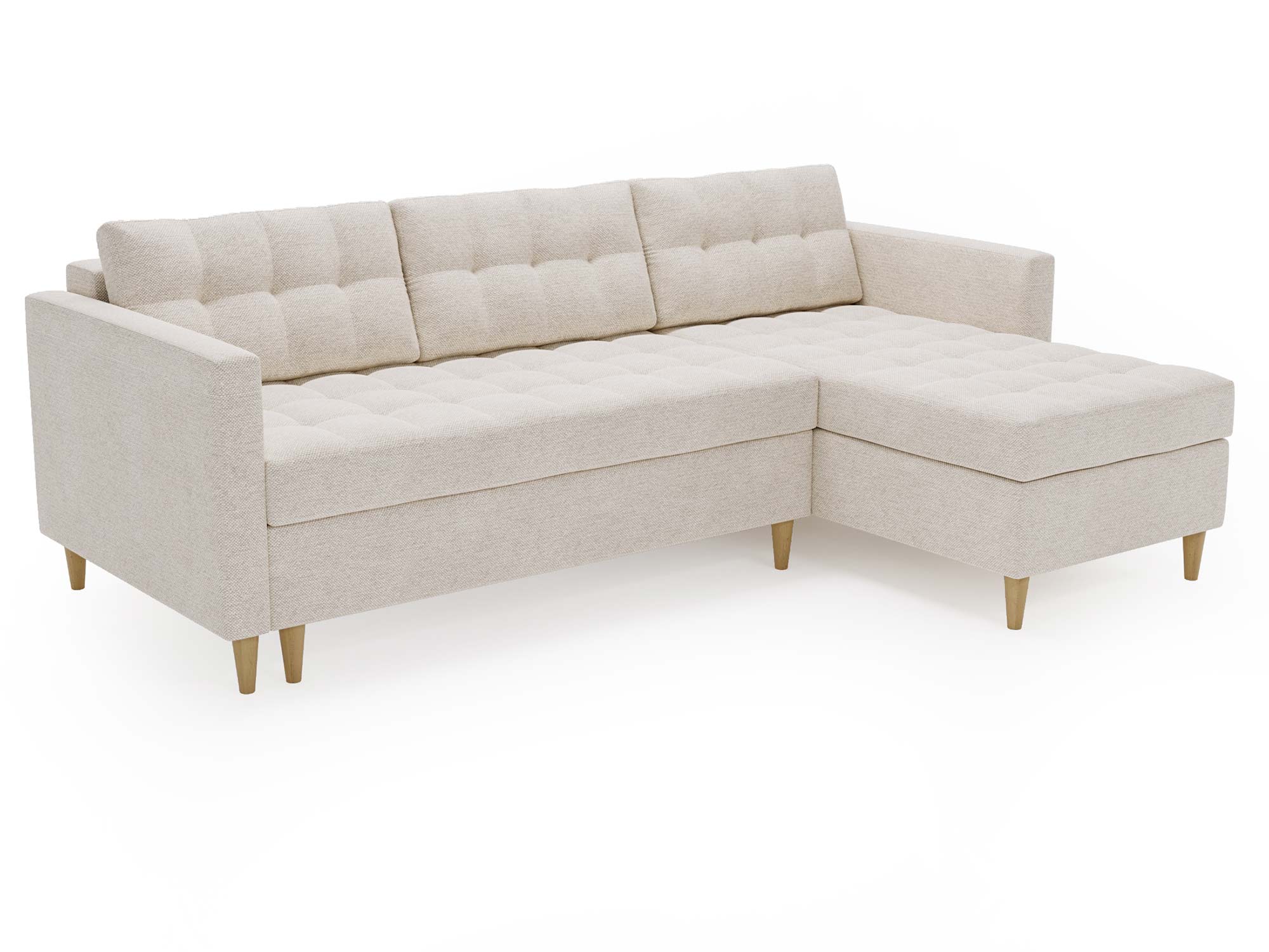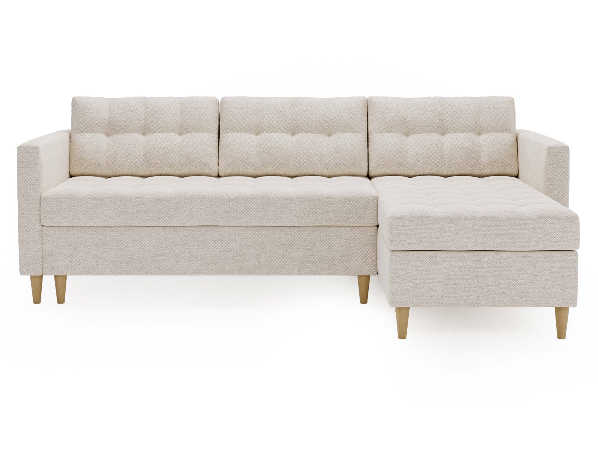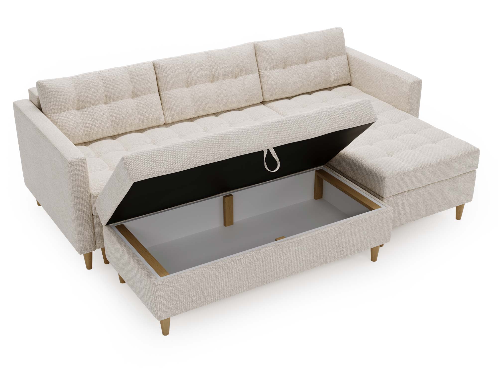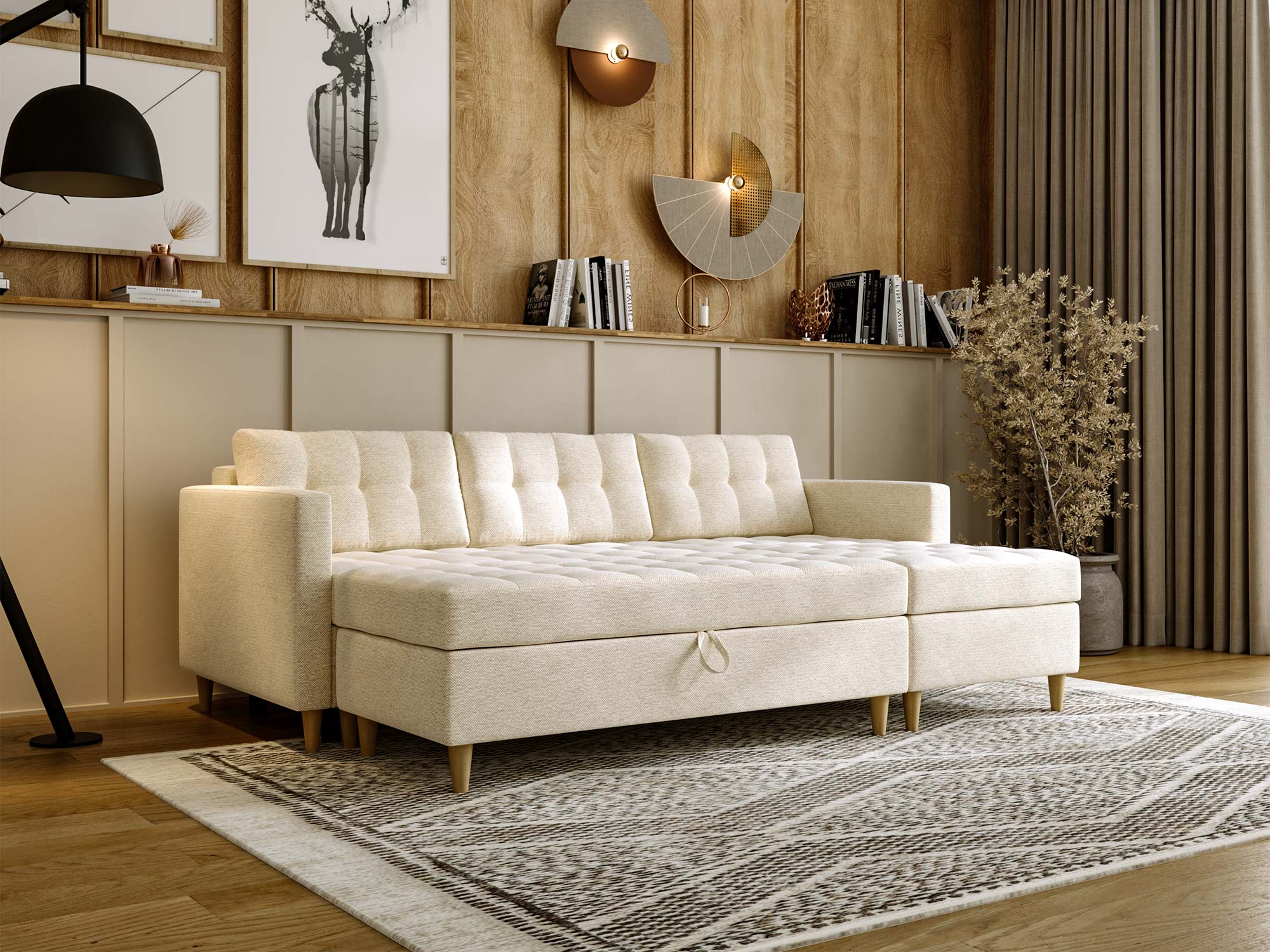 Narożnik kremowy glamour z funkcją spania i drewnianymi nogami w jasnym salonie