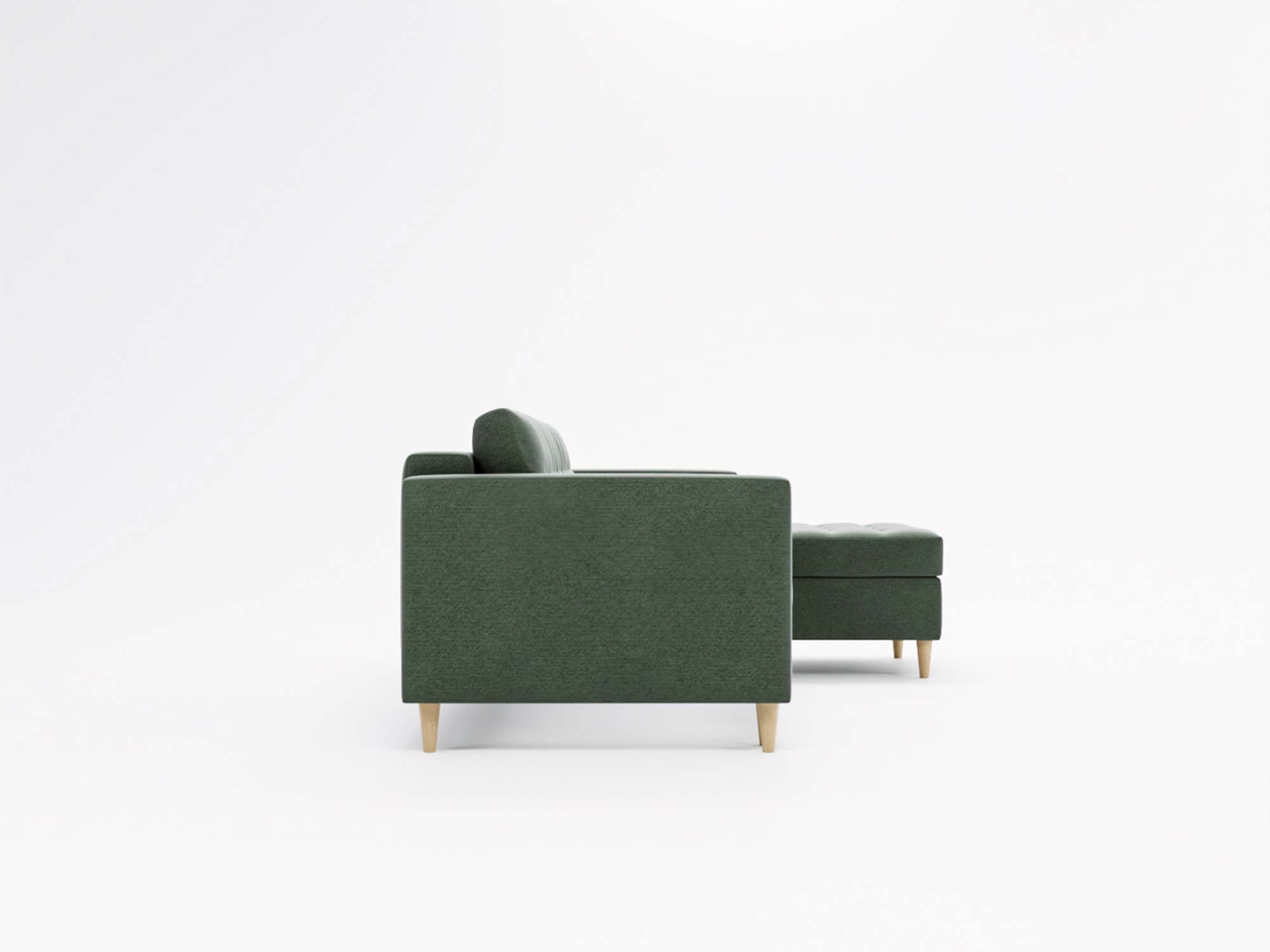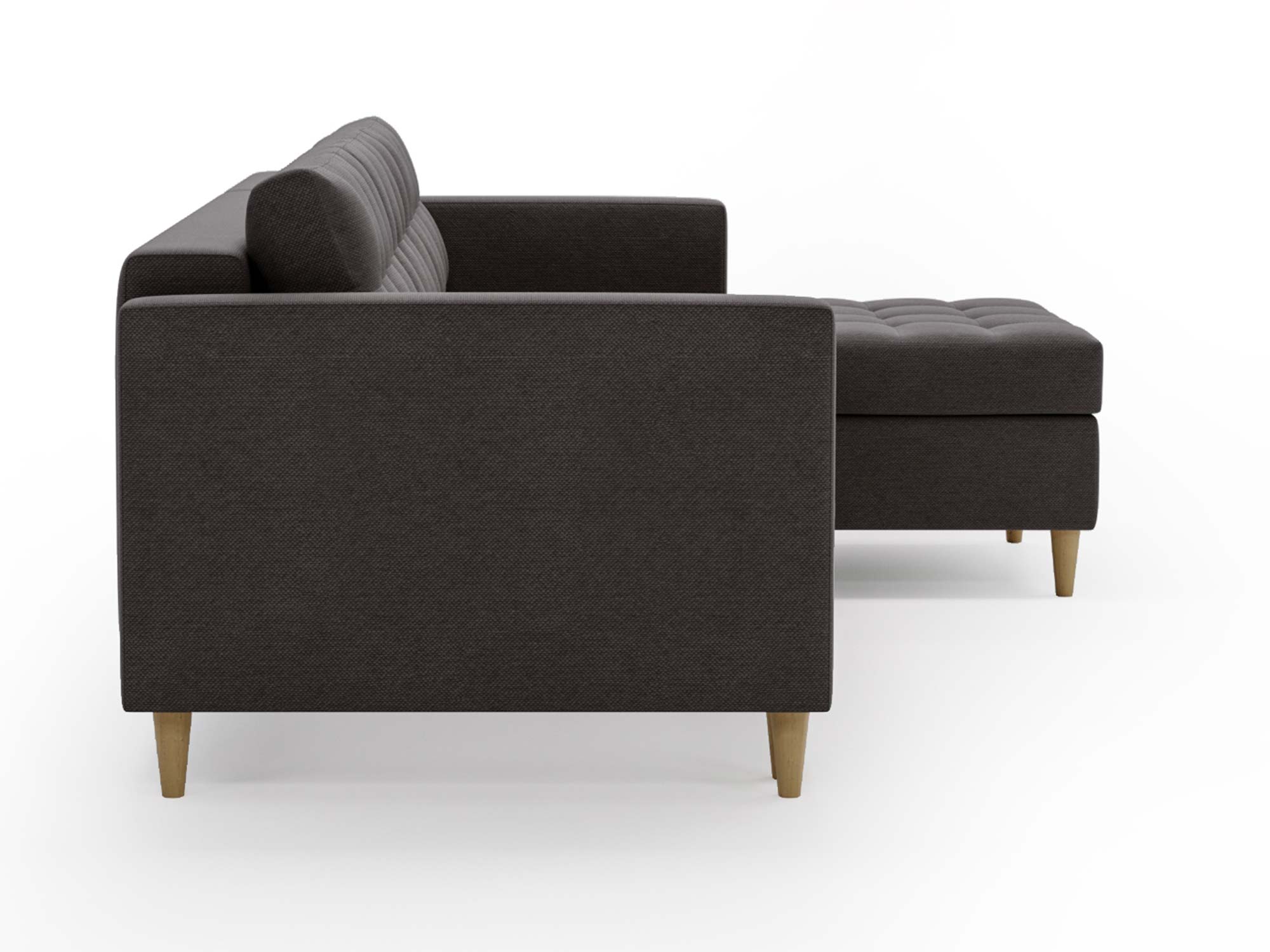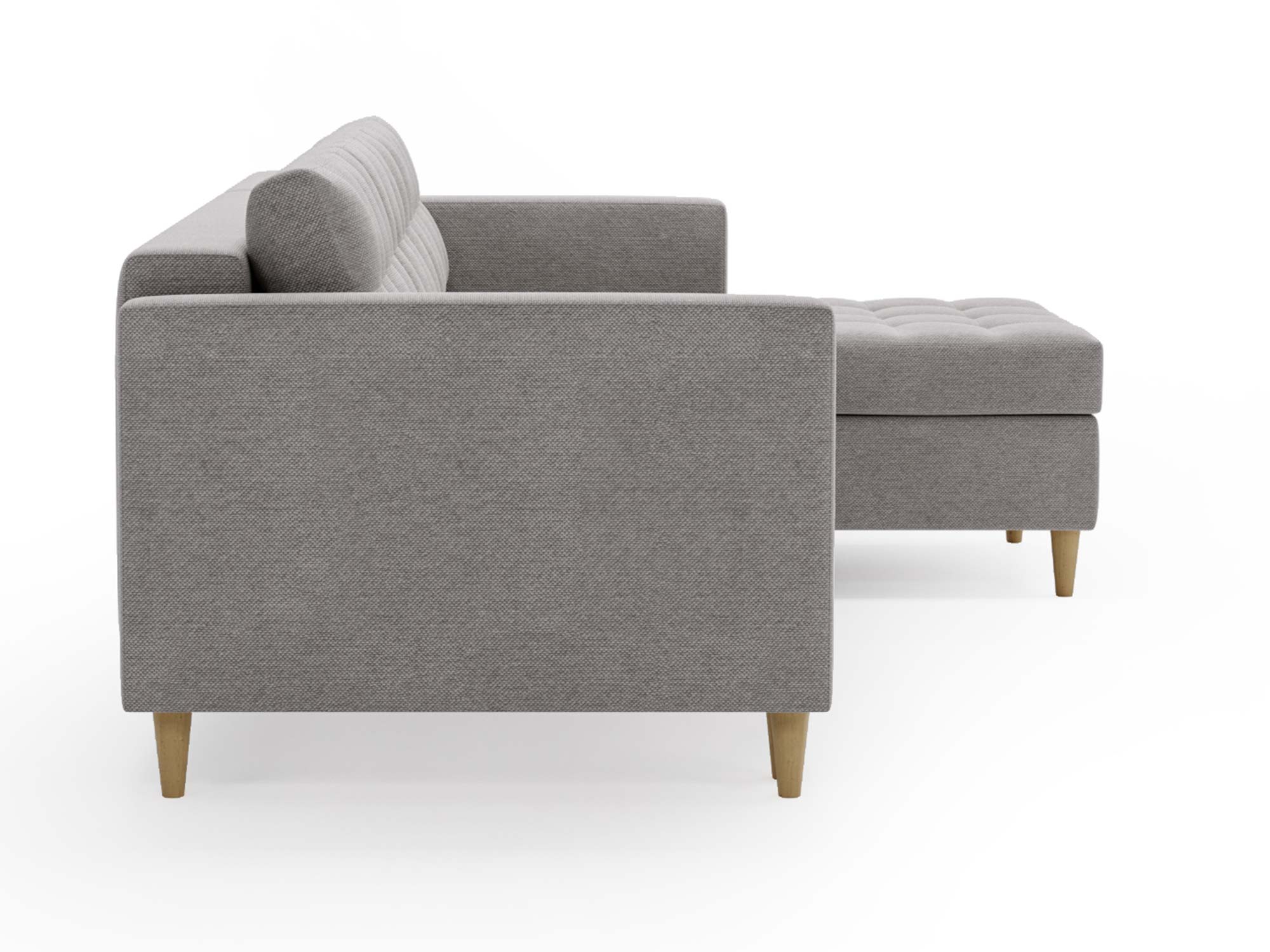 Narożnik MONO II zachwyca prostotą formy oraz starannie dobranymi materiałami. Szara tapicerka harmonizuje z naturalnym drewnem nóżek, tworząc niepowtarzalny efekt wizualny. Jego ponadczasowy design sprawia, że będzie pasować zarówno do nowoczesnych, jak i klasycznych wnętrz.
