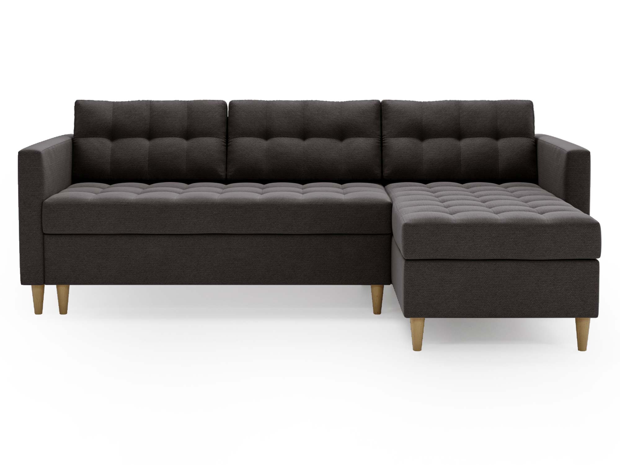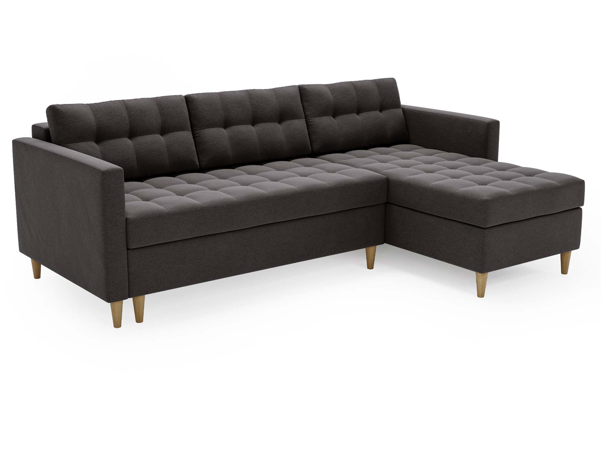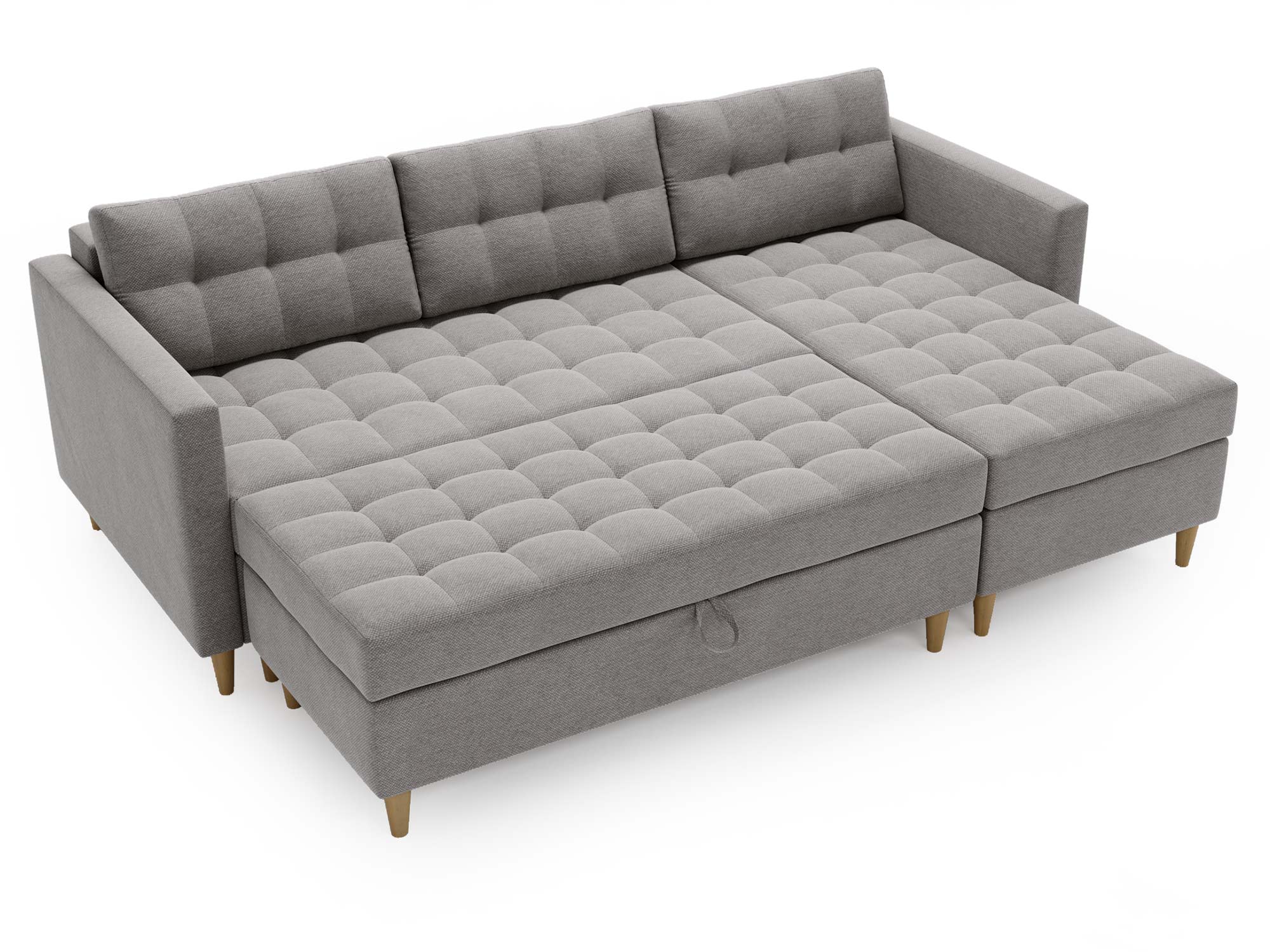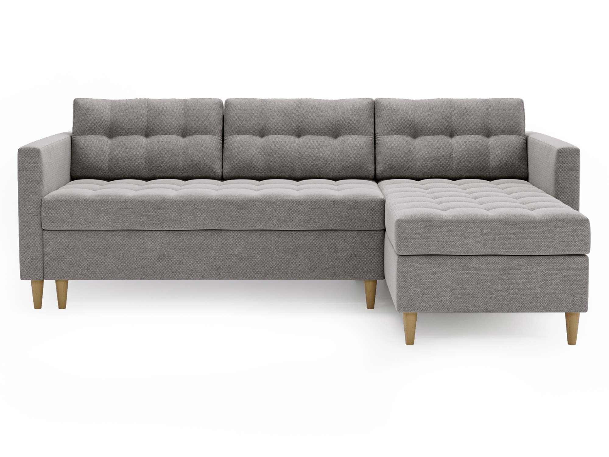 Tapicerowany szary narożnik z prostym designem i drewnianymi elementami
