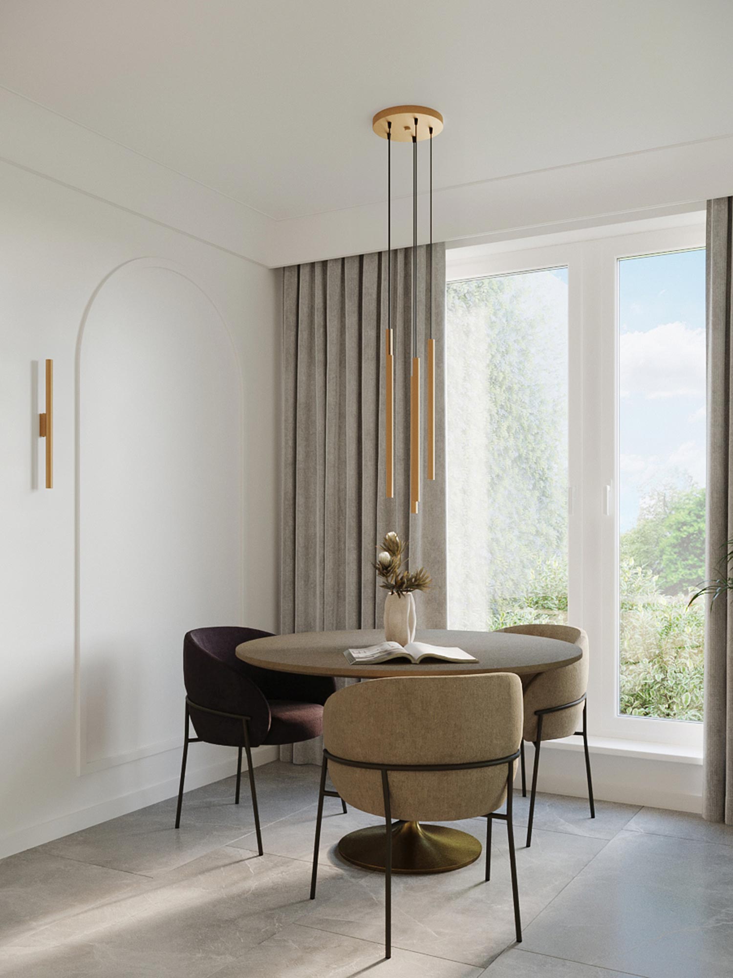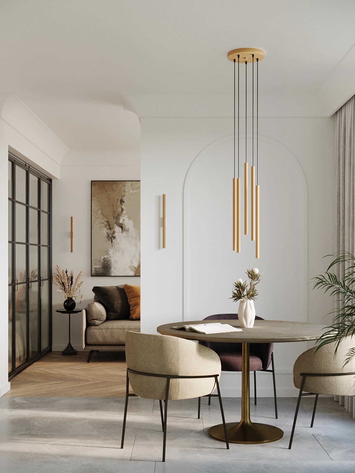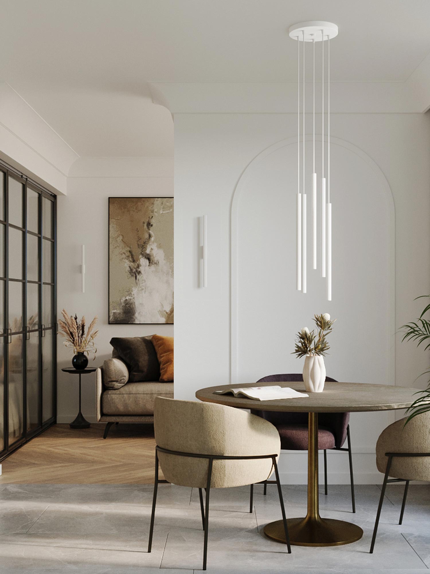 Jadalnia z czarnymi lampami wiszącymi w układzie wertykalnym
