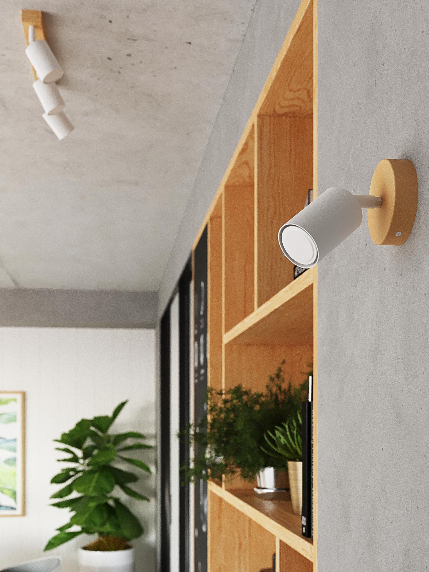 Biały reflektor LED na drewnianej bazie w stylu japandi