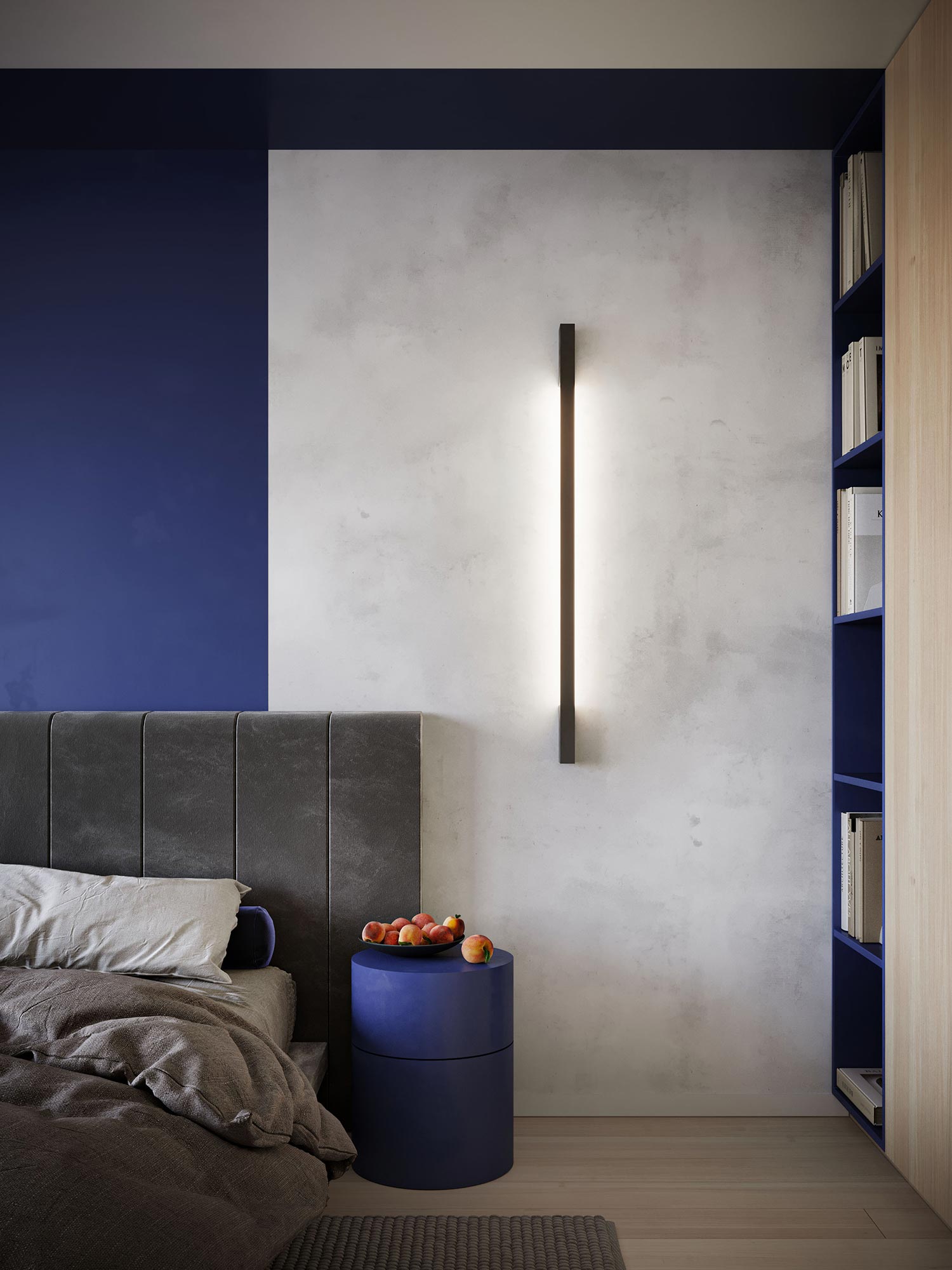 Nowoczesna sypialnia z ciemną lampą pionową LED