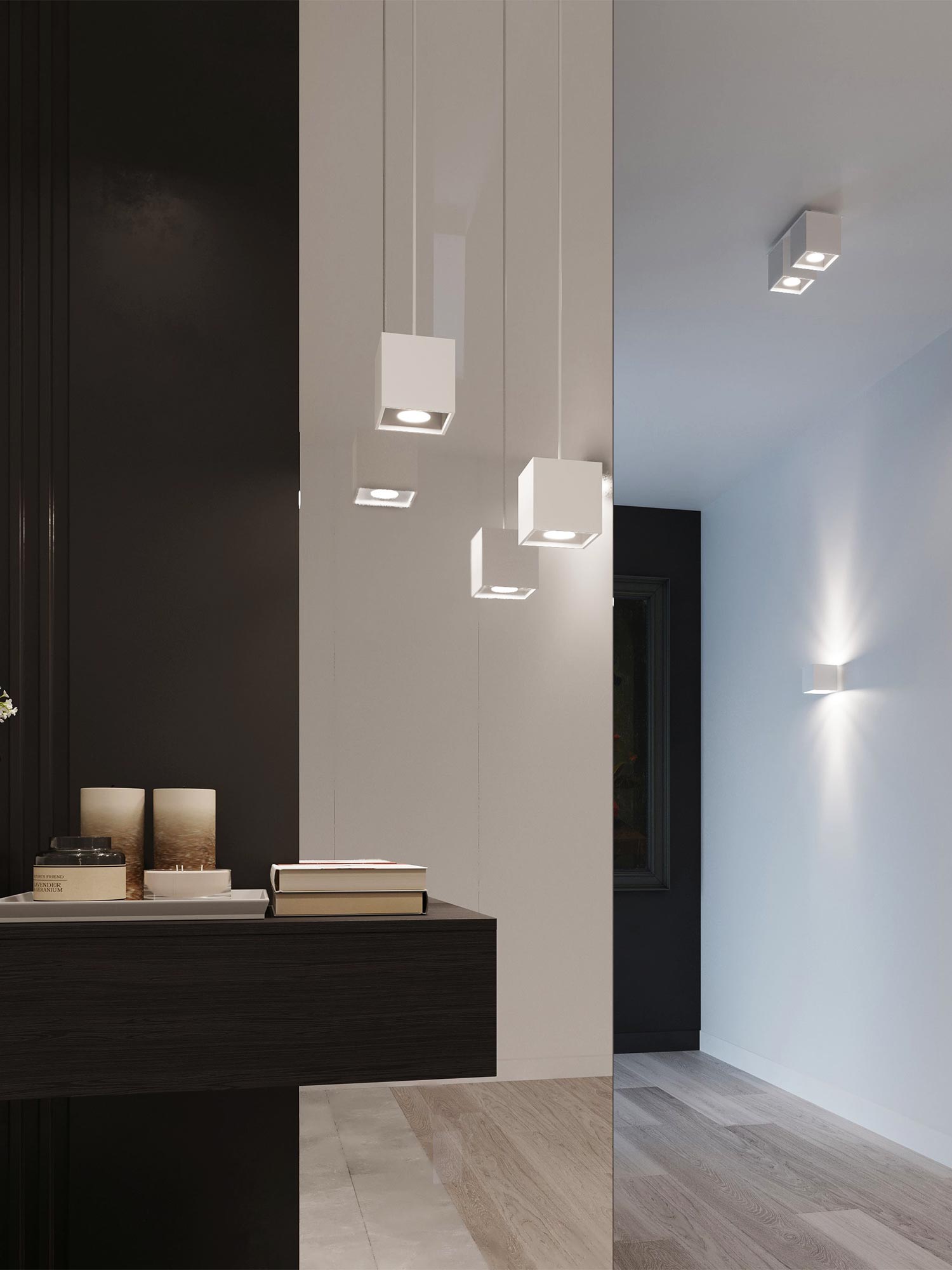 Dekoracyjne oświetlenie LED z wiszącymi sześciennymi kloszami