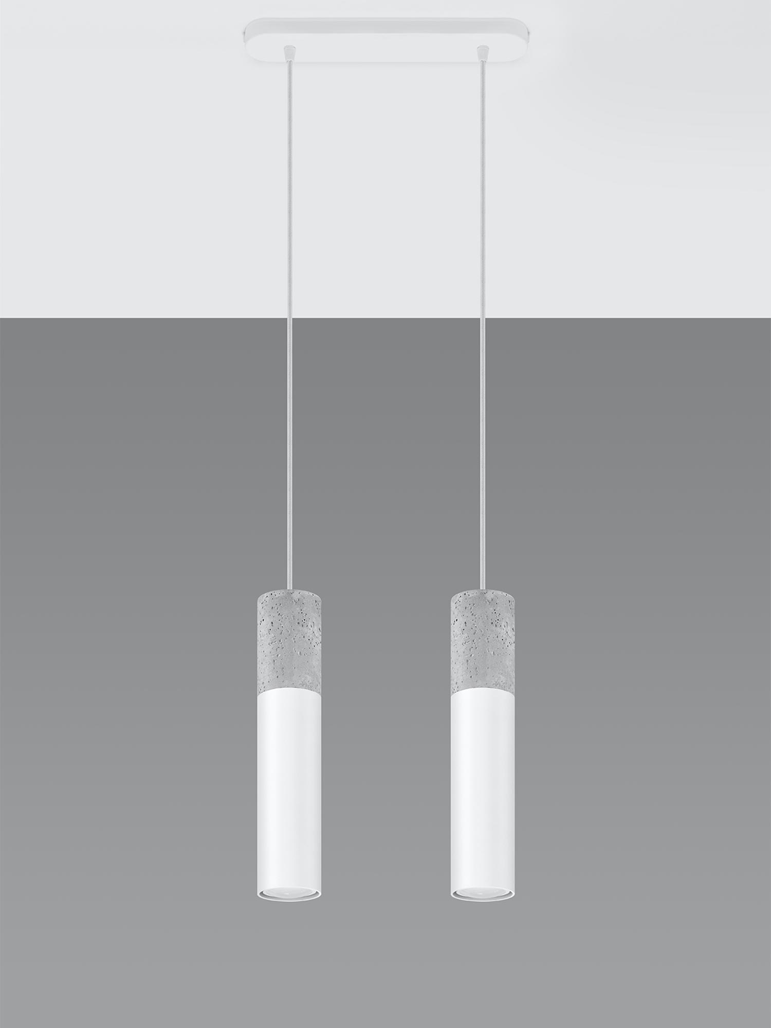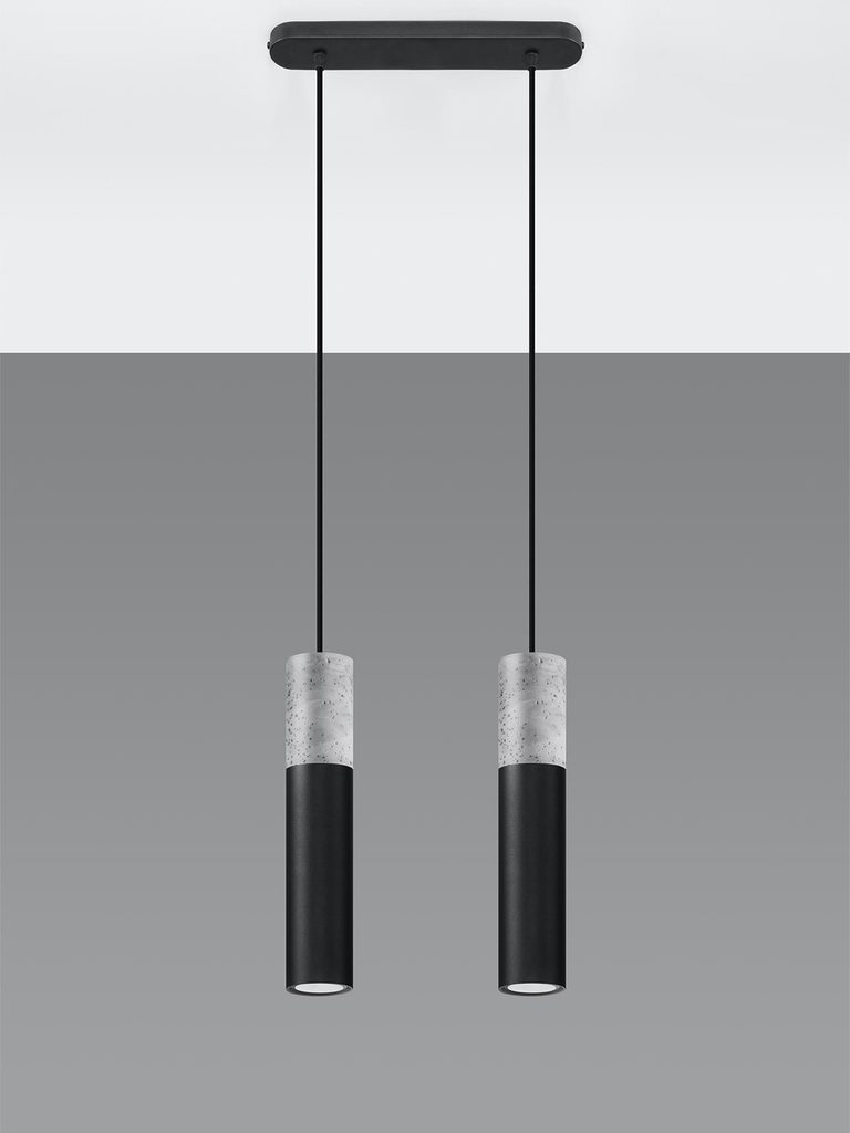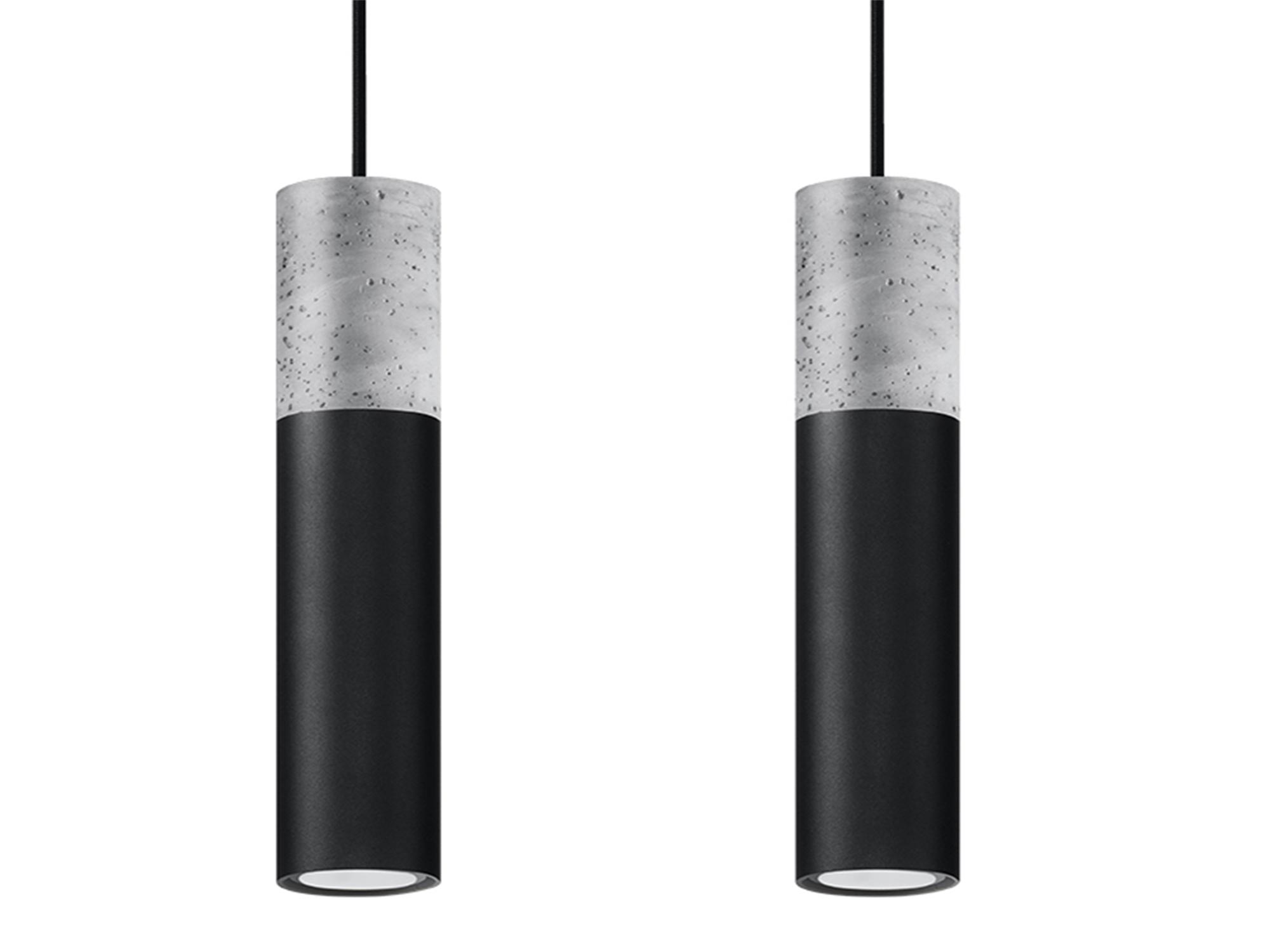 Dwie lampy wiszące: beton i czarny mat na tle białej ściany