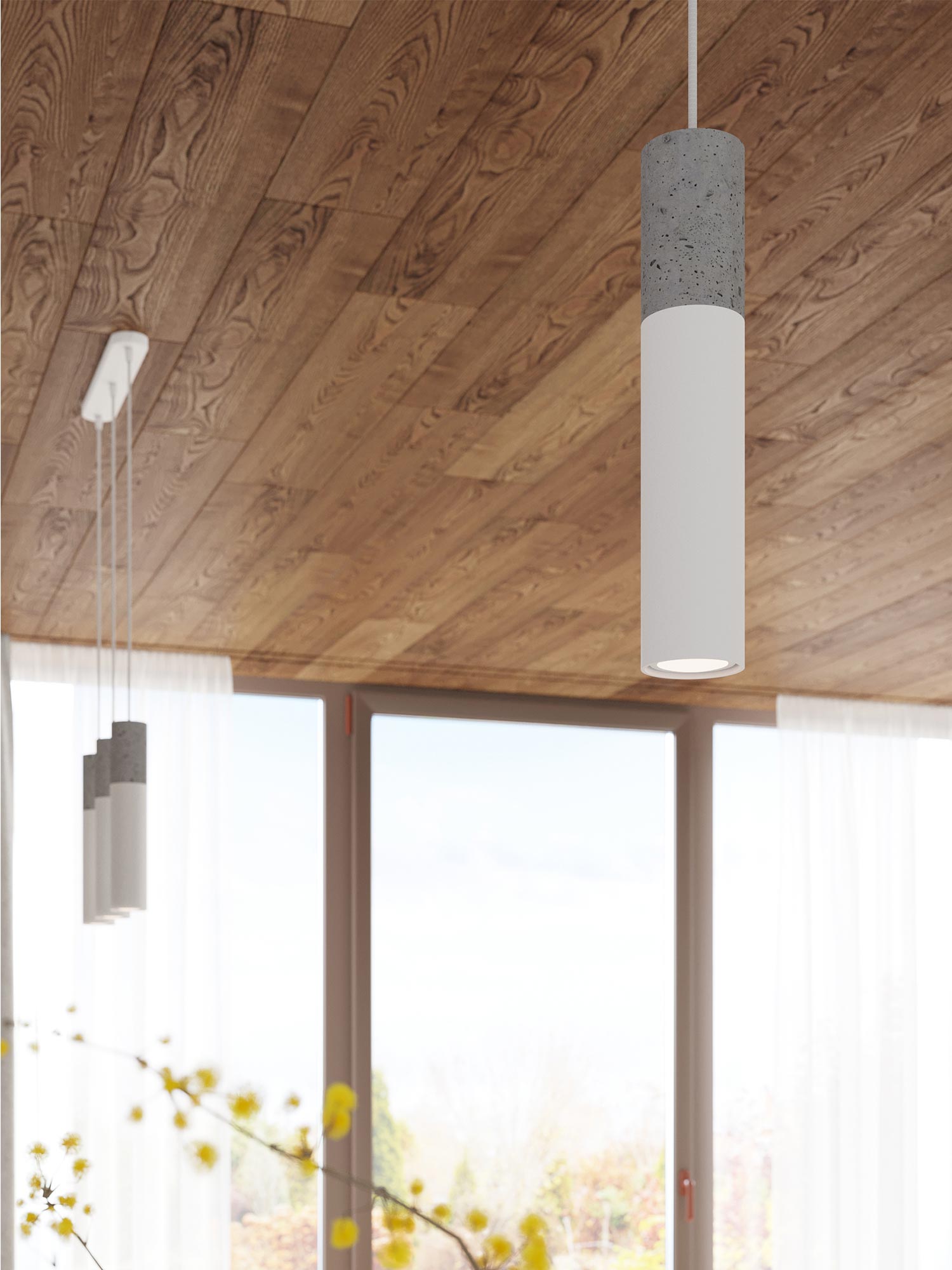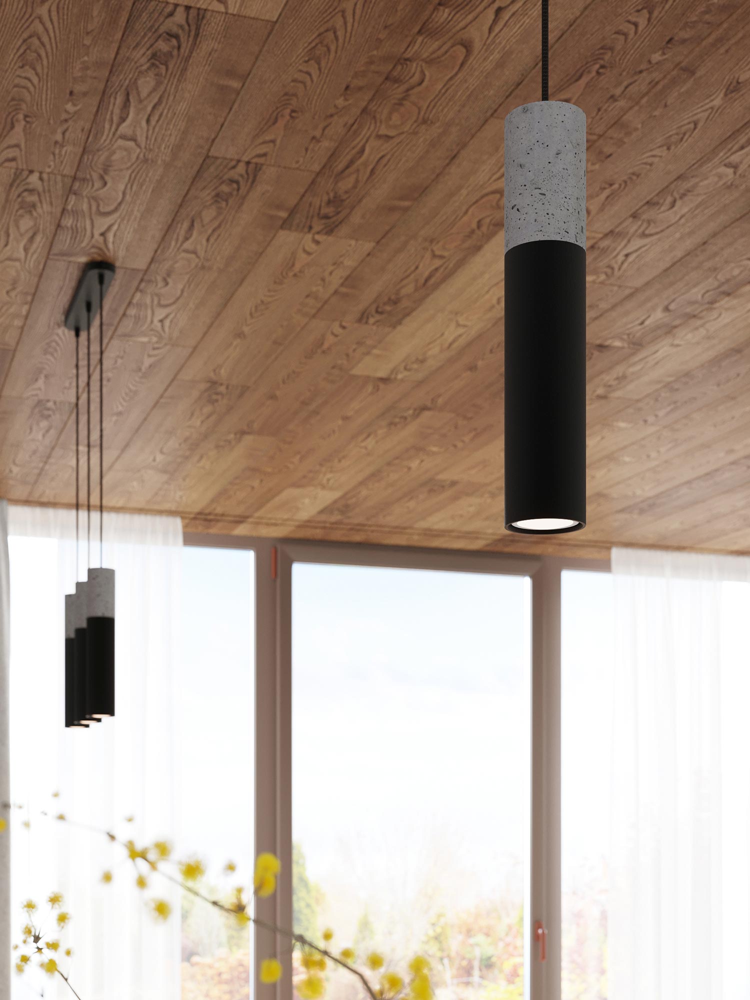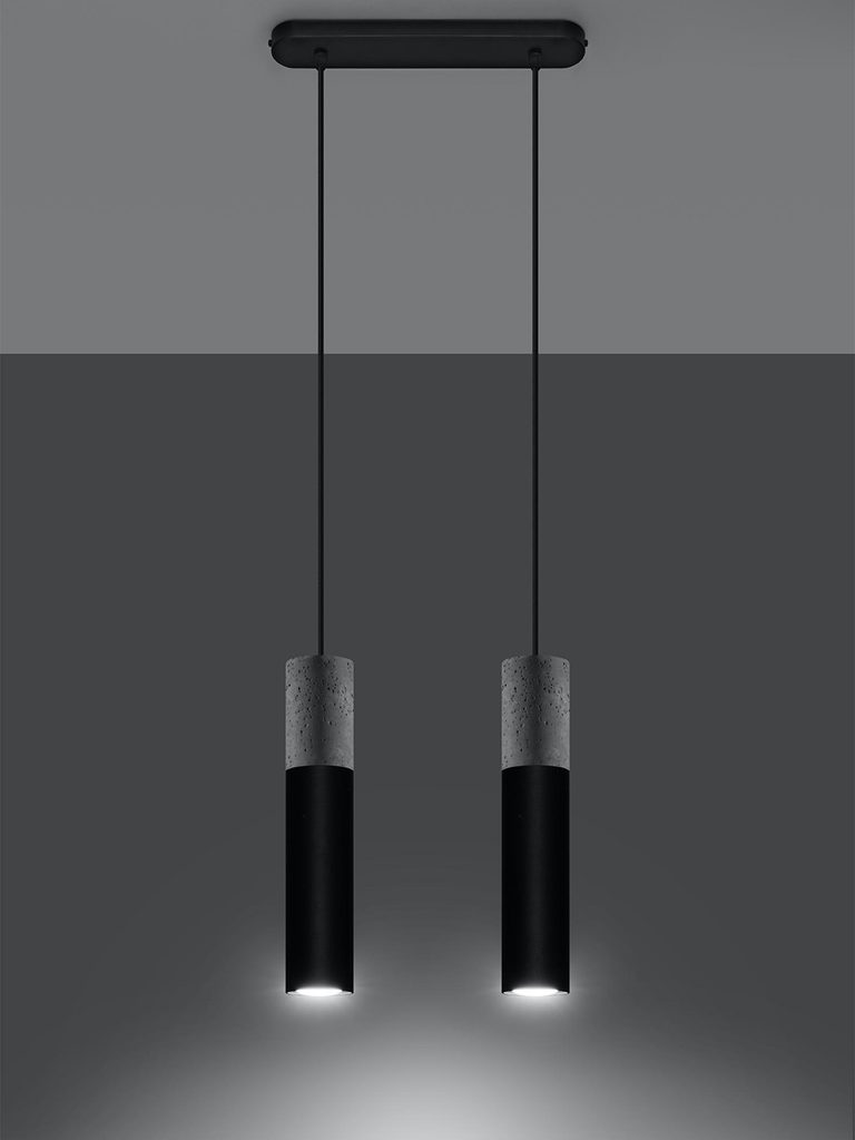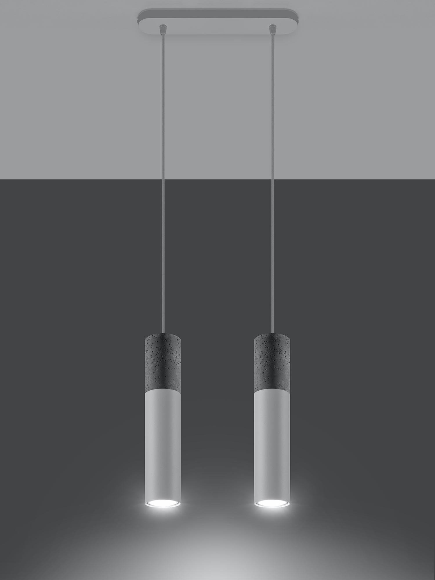 Dwie lampy wiszące: beton i czarny mat na tle białej ściany
