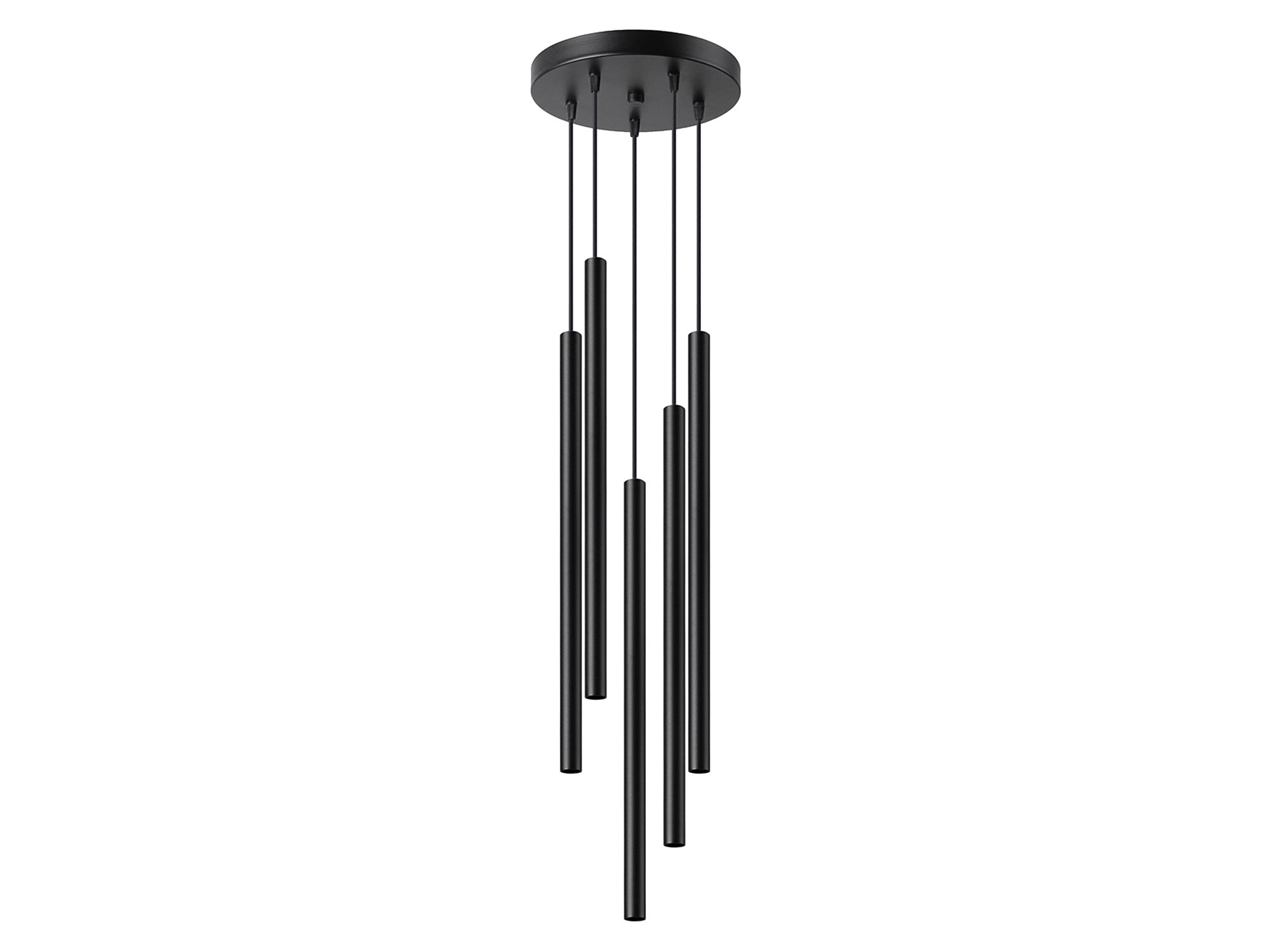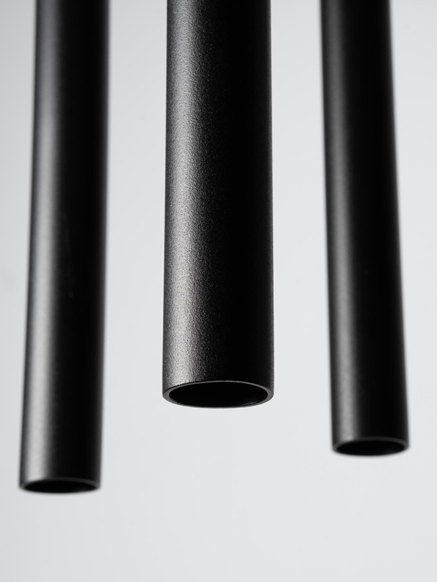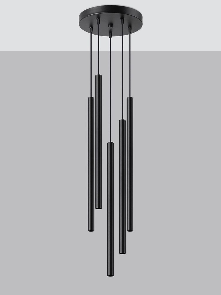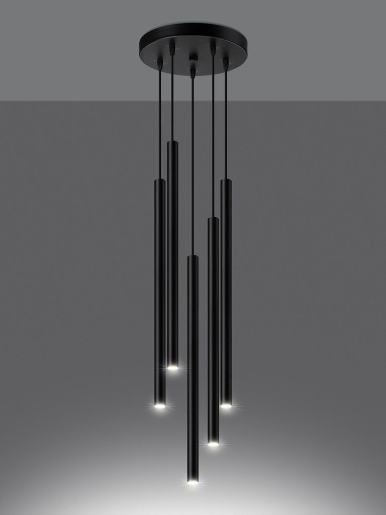 Pięć czarnych tub LED zawieszonych na różnych wysokościach