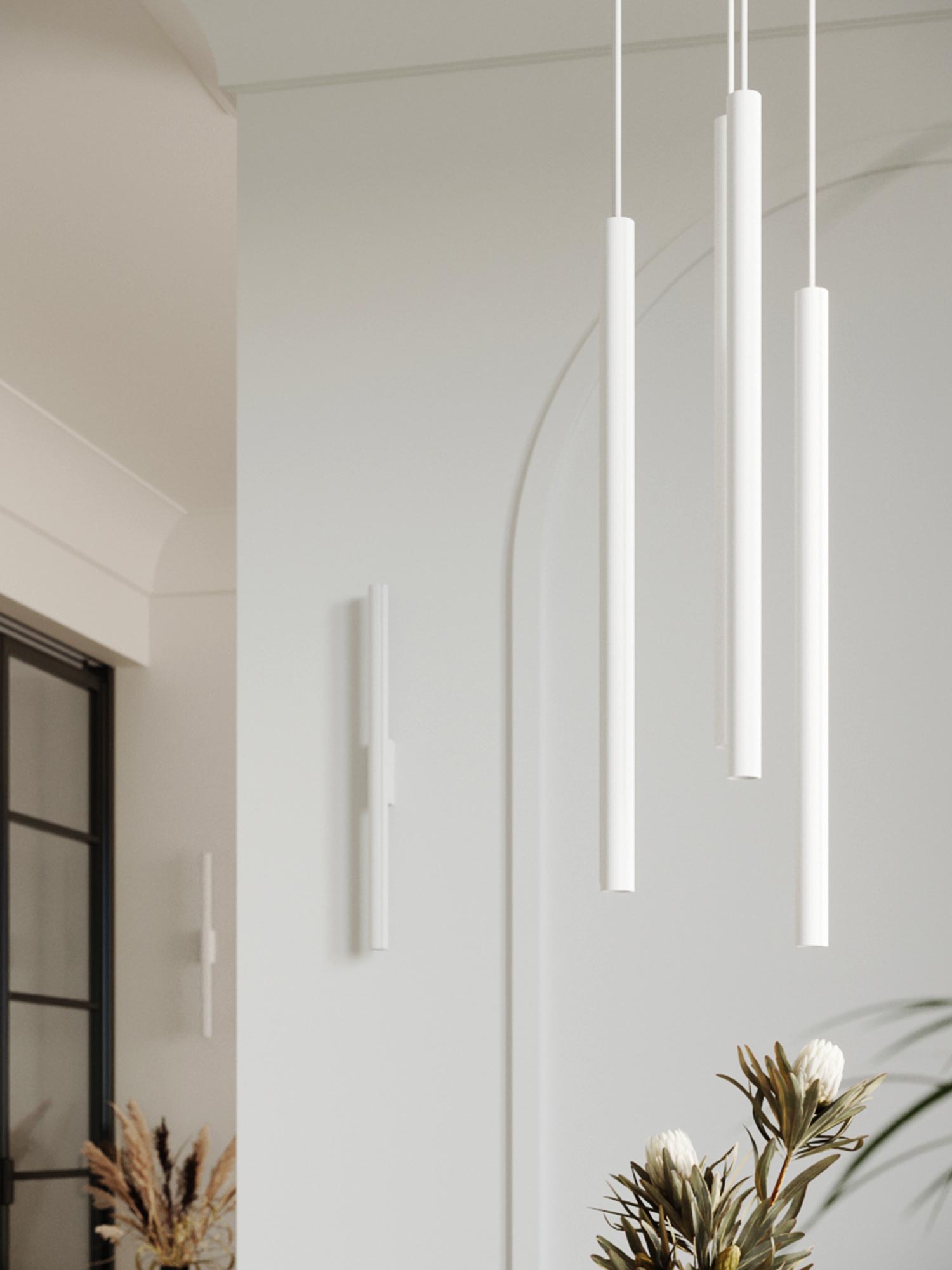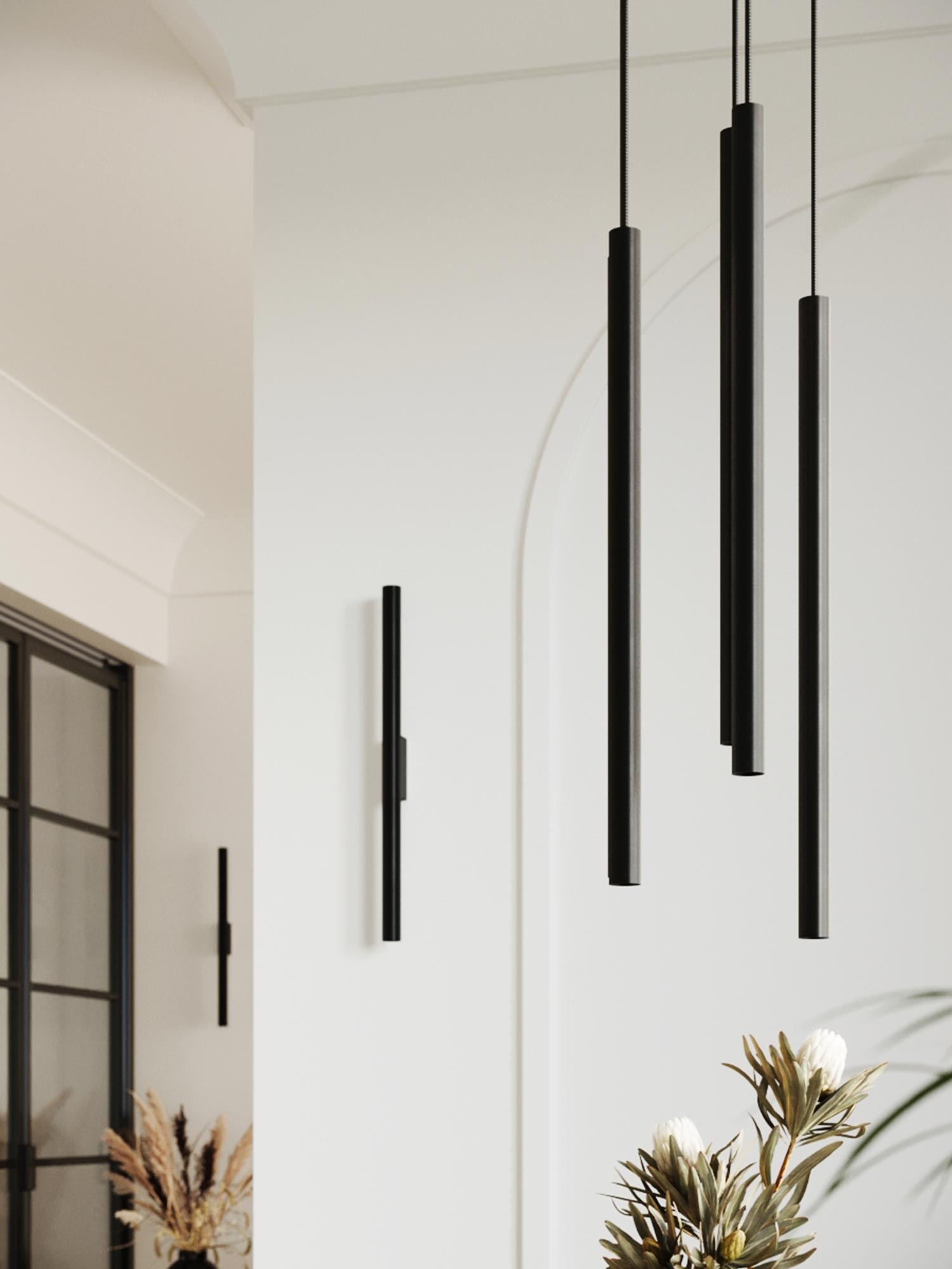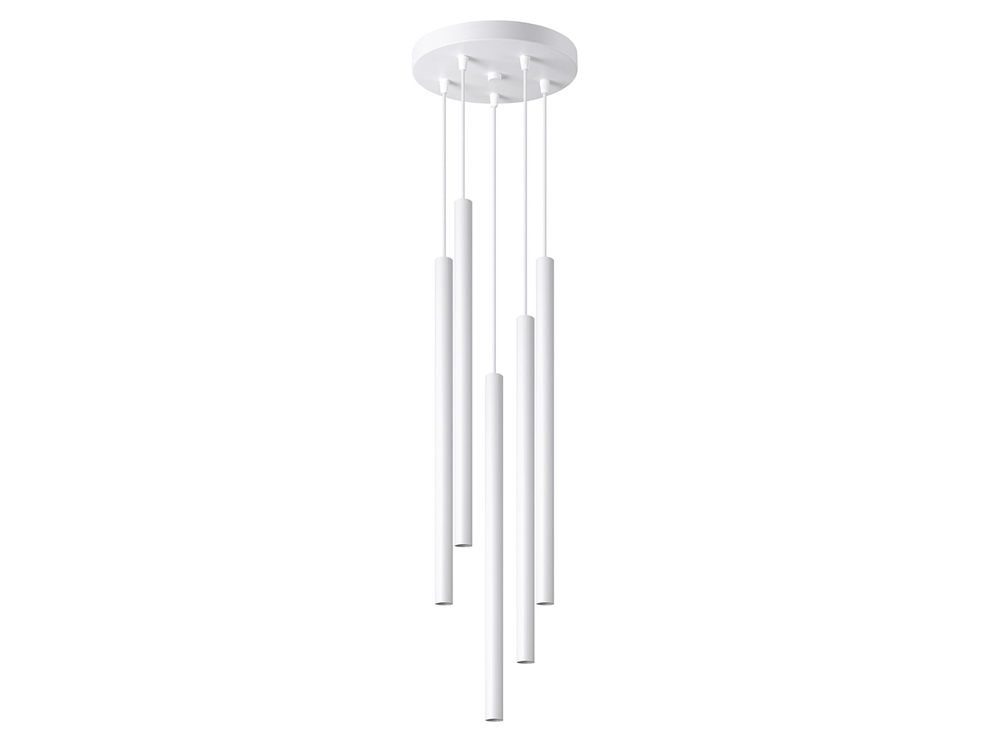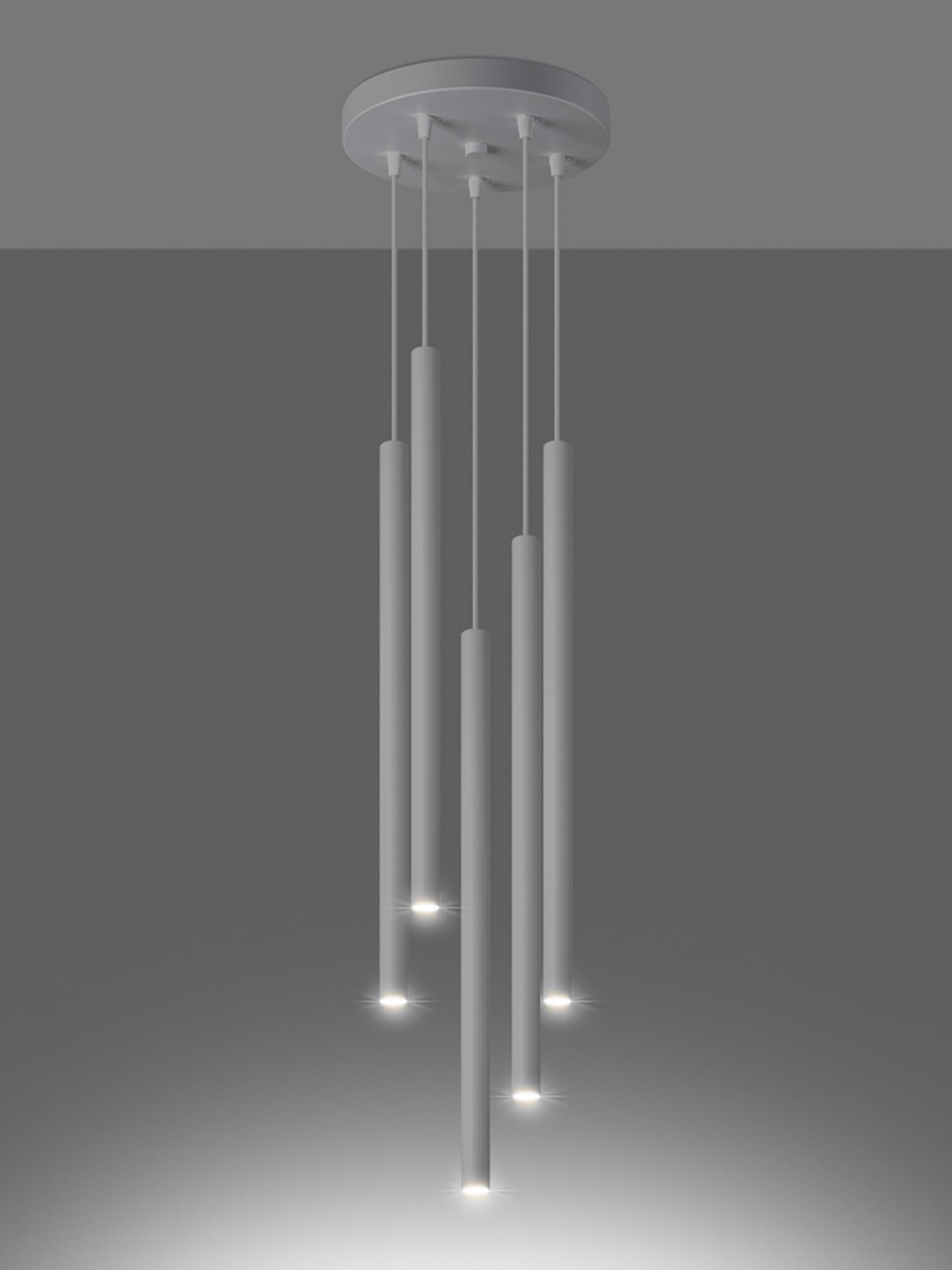 Pięć czarnych tub LED zawieszonych na różnych wysokościach