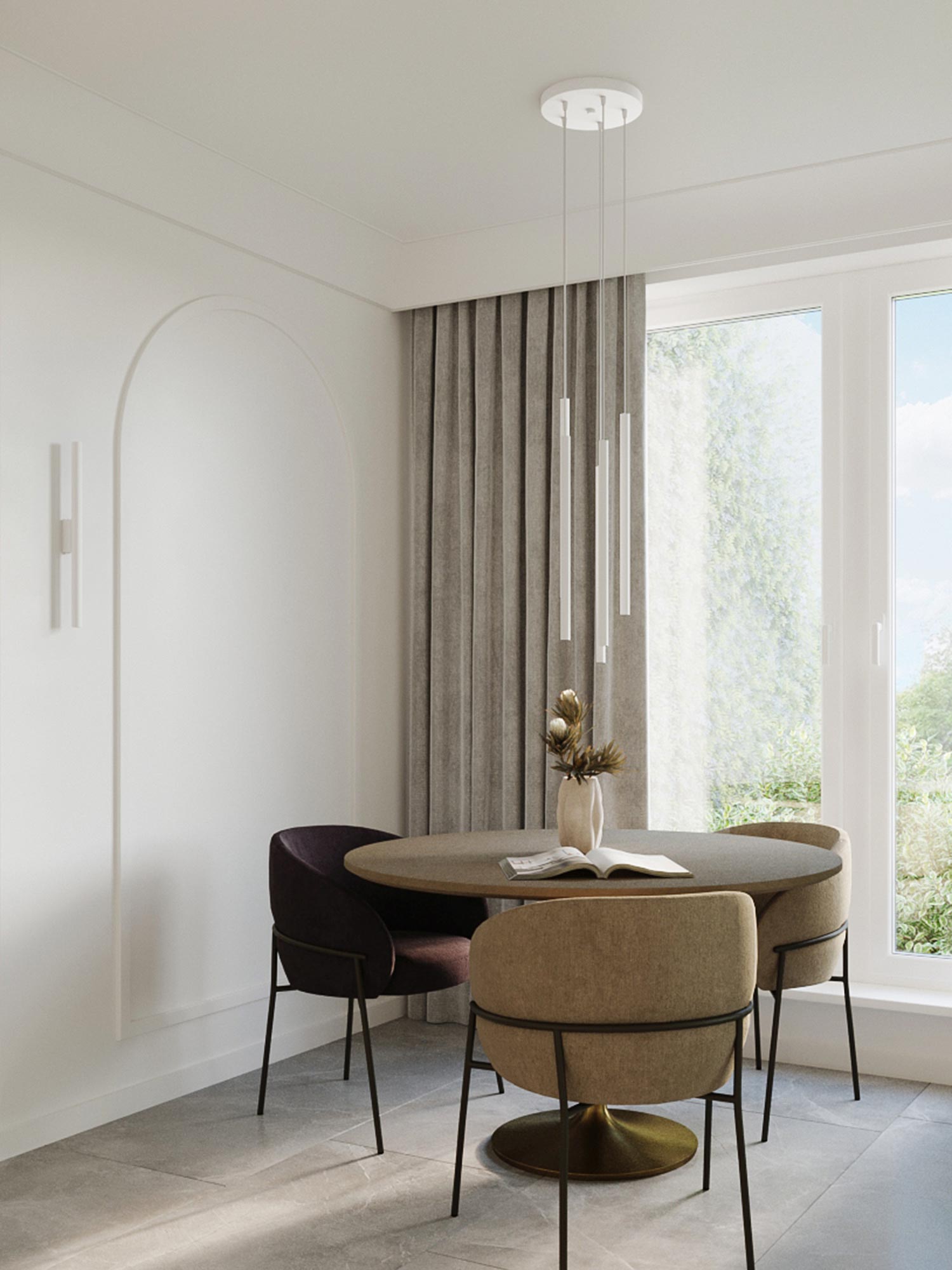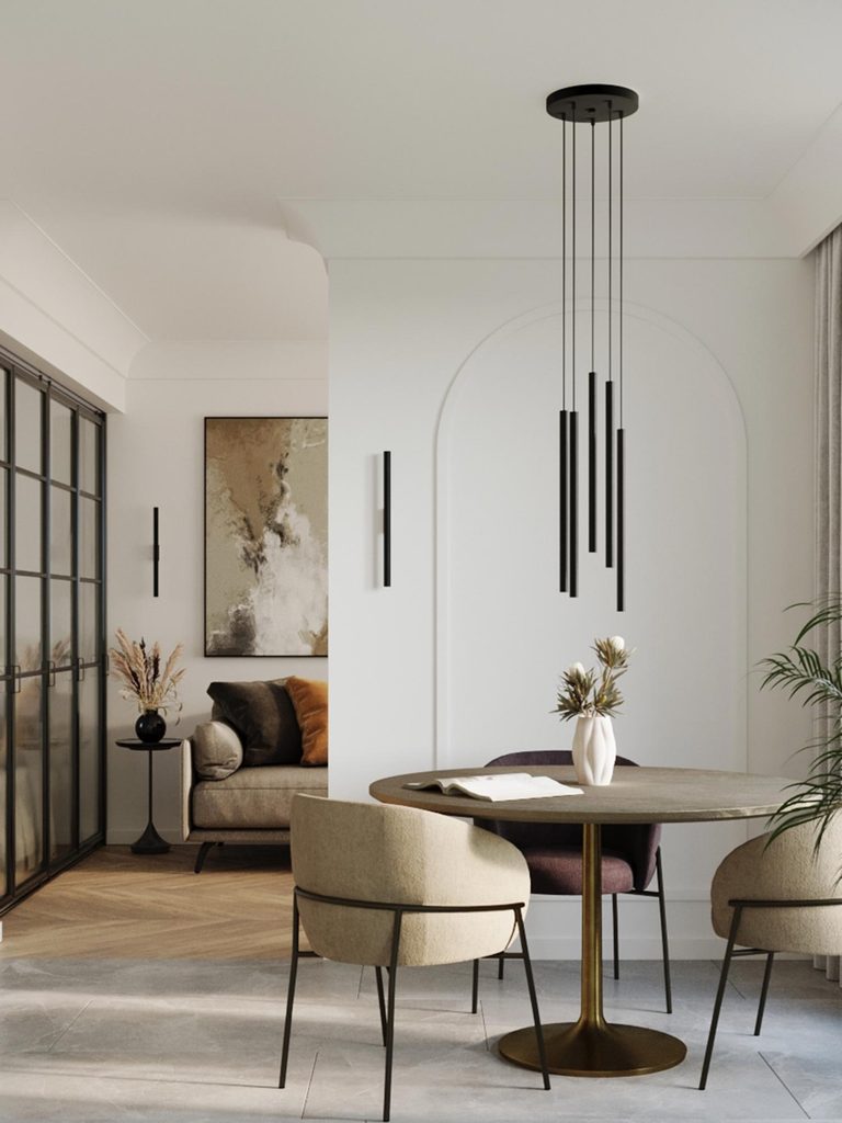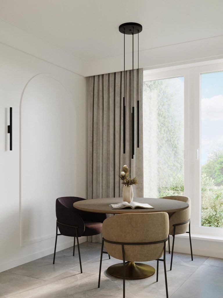 Jadalnia z czarnymi lampami LED typu tuba, styl minimalistyczny