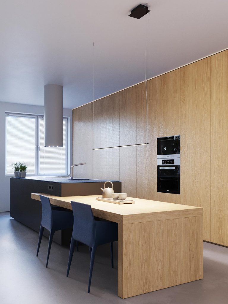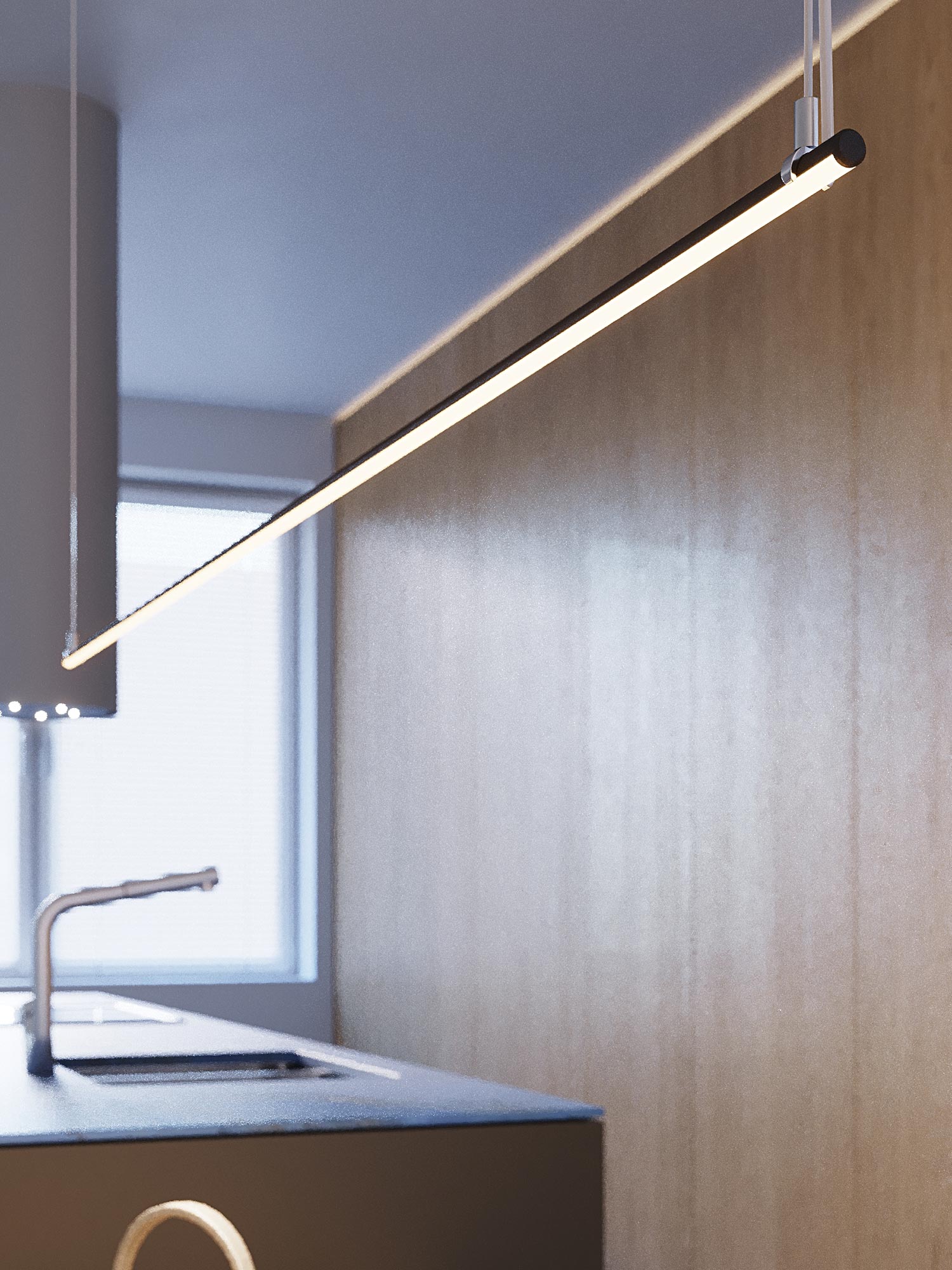 Drewniana kuchnia z minimalistyczną liniową lampą LED nad blatem