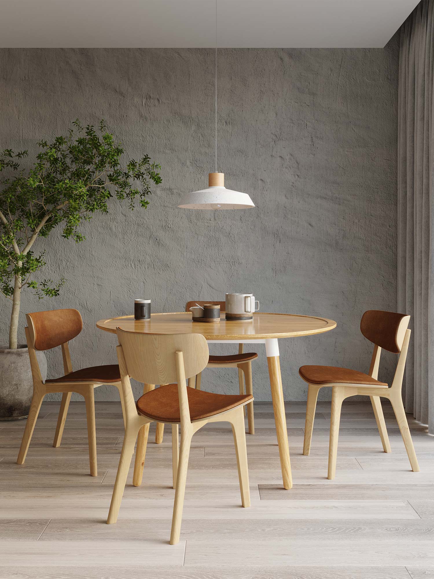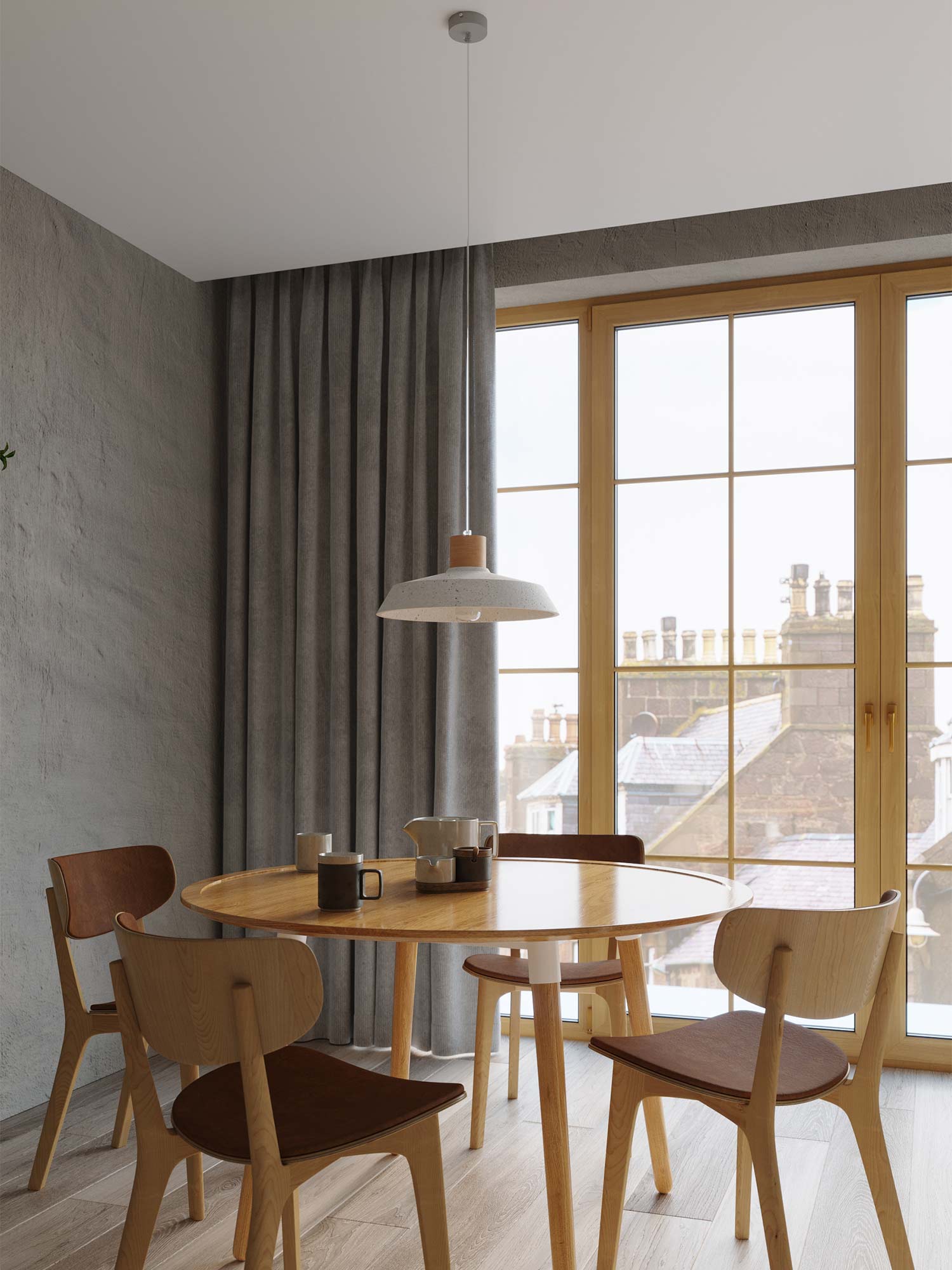 Jadalnia z drewnianym stołem i betonową lampą – styl skandynawski