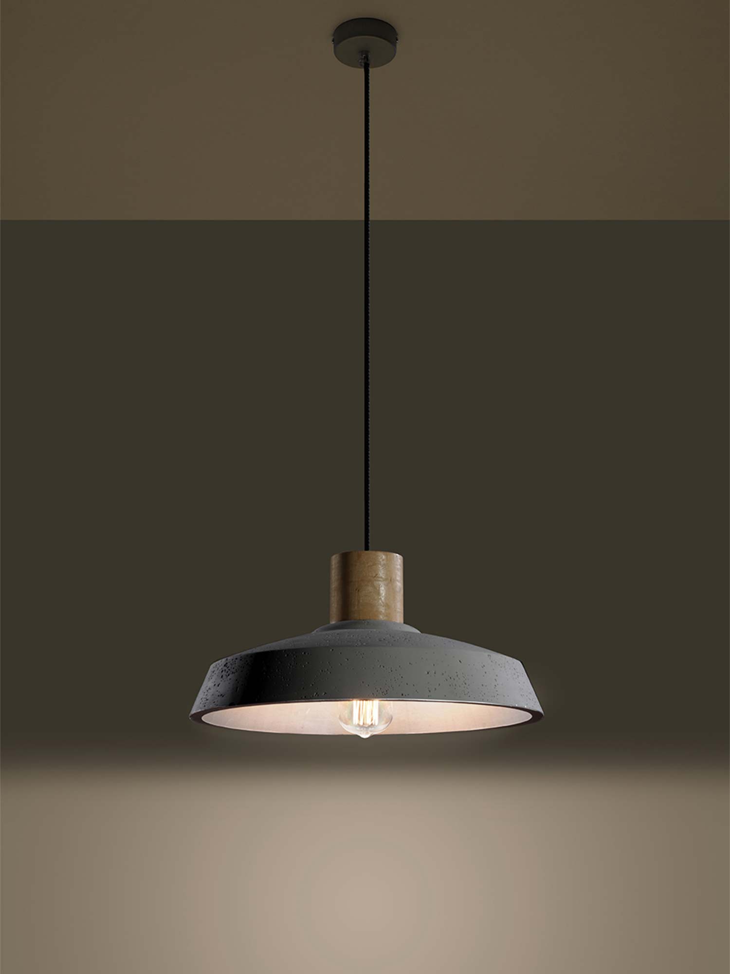 Designerska lampa wisząca z betonowym kloszem i drewnianym wykończeniem