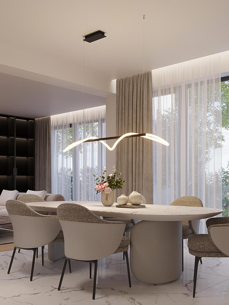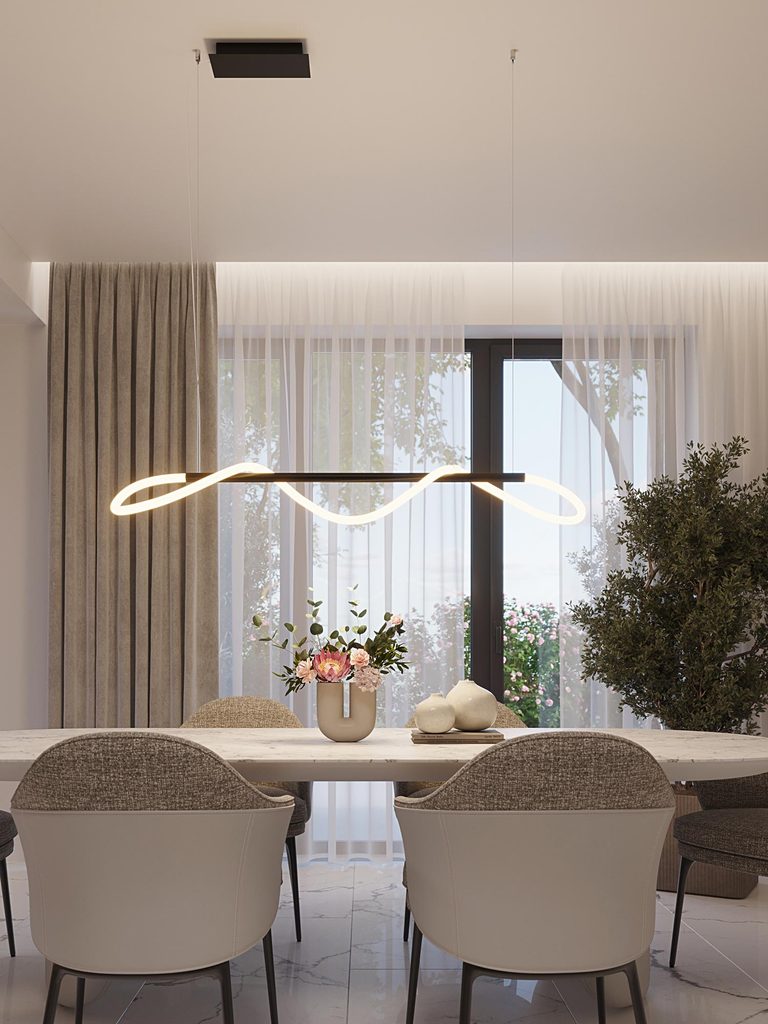 Stylowa lampa LED nad stół w nowoczesnym salonie z dużymi oknami