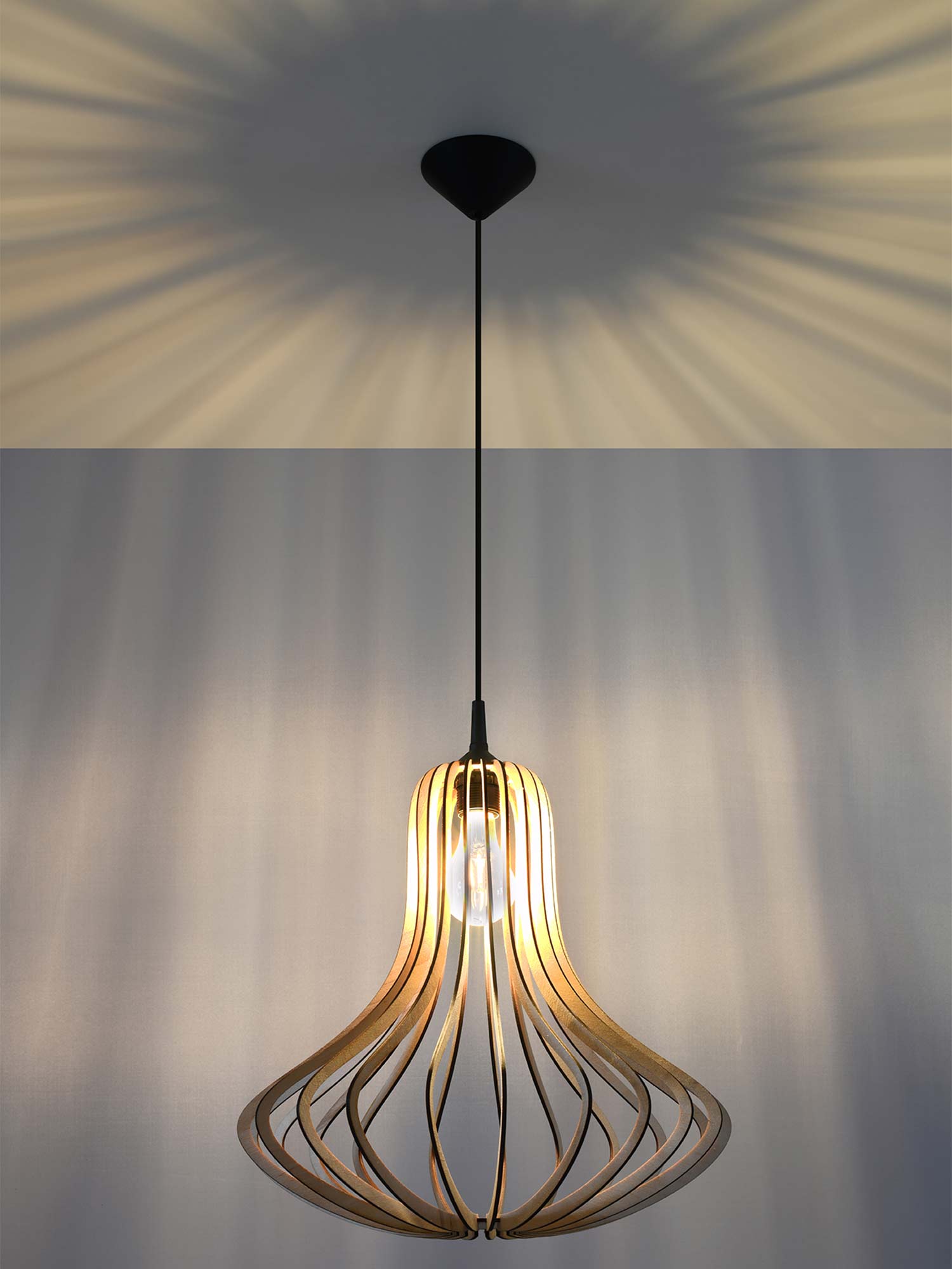 PULSAR to lampa wisząca, która łączy w sobie nowoczesne i tradycyjne elementy. Naturalna drewniana struktura dodaje oryginalności, a jednocześnie wpasowuje się w różne aranżacje wnętrz – od minimalistycznych, po te z wyraźnie rustykalnym charakterem.