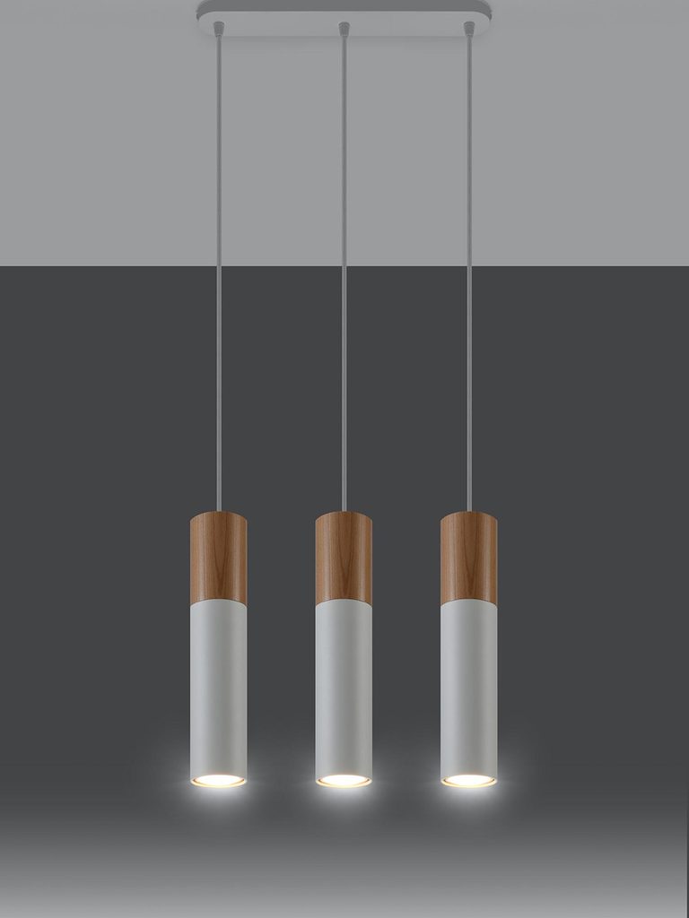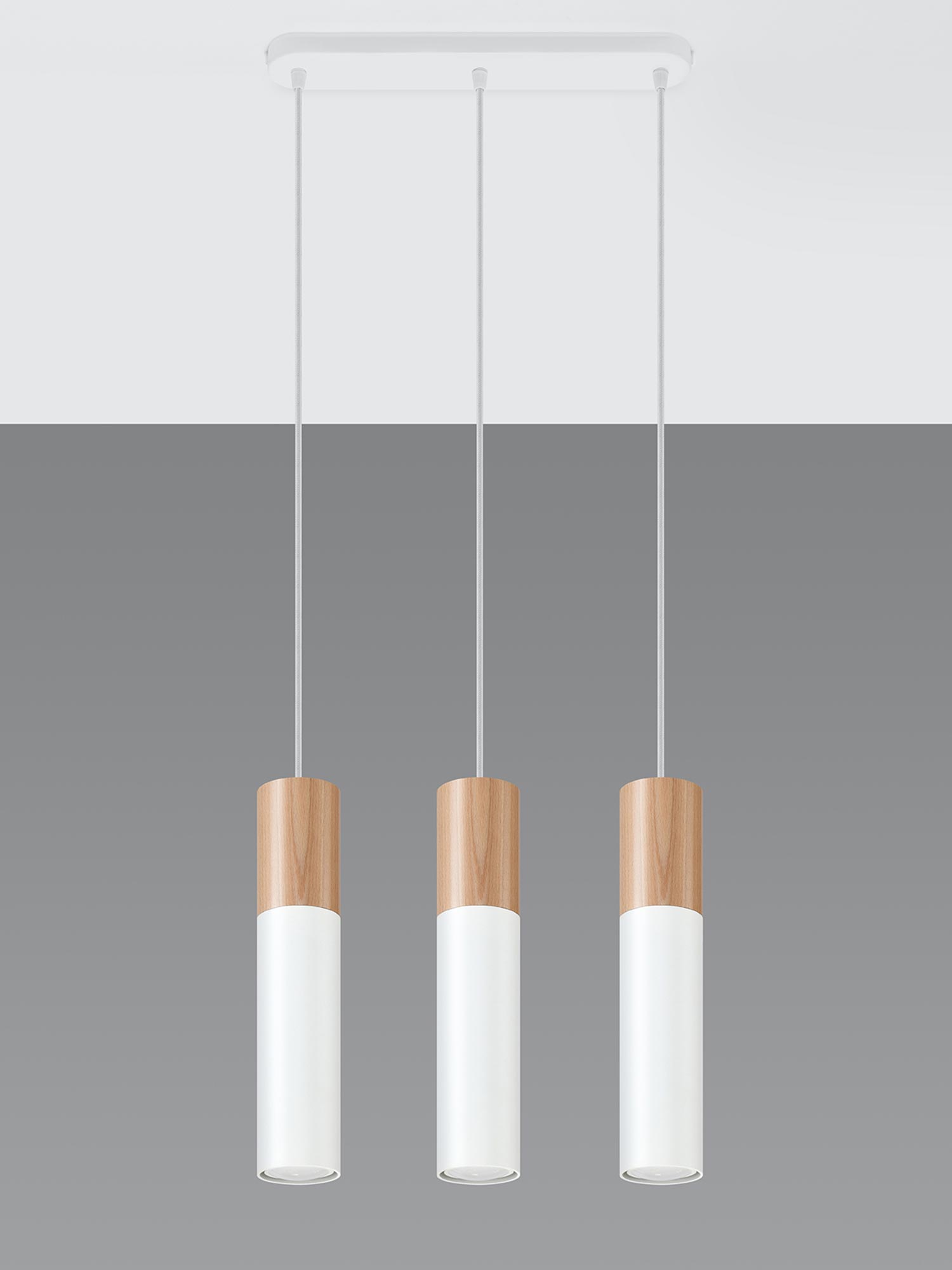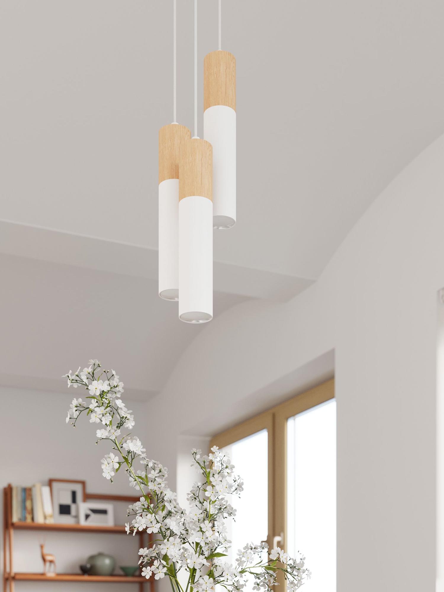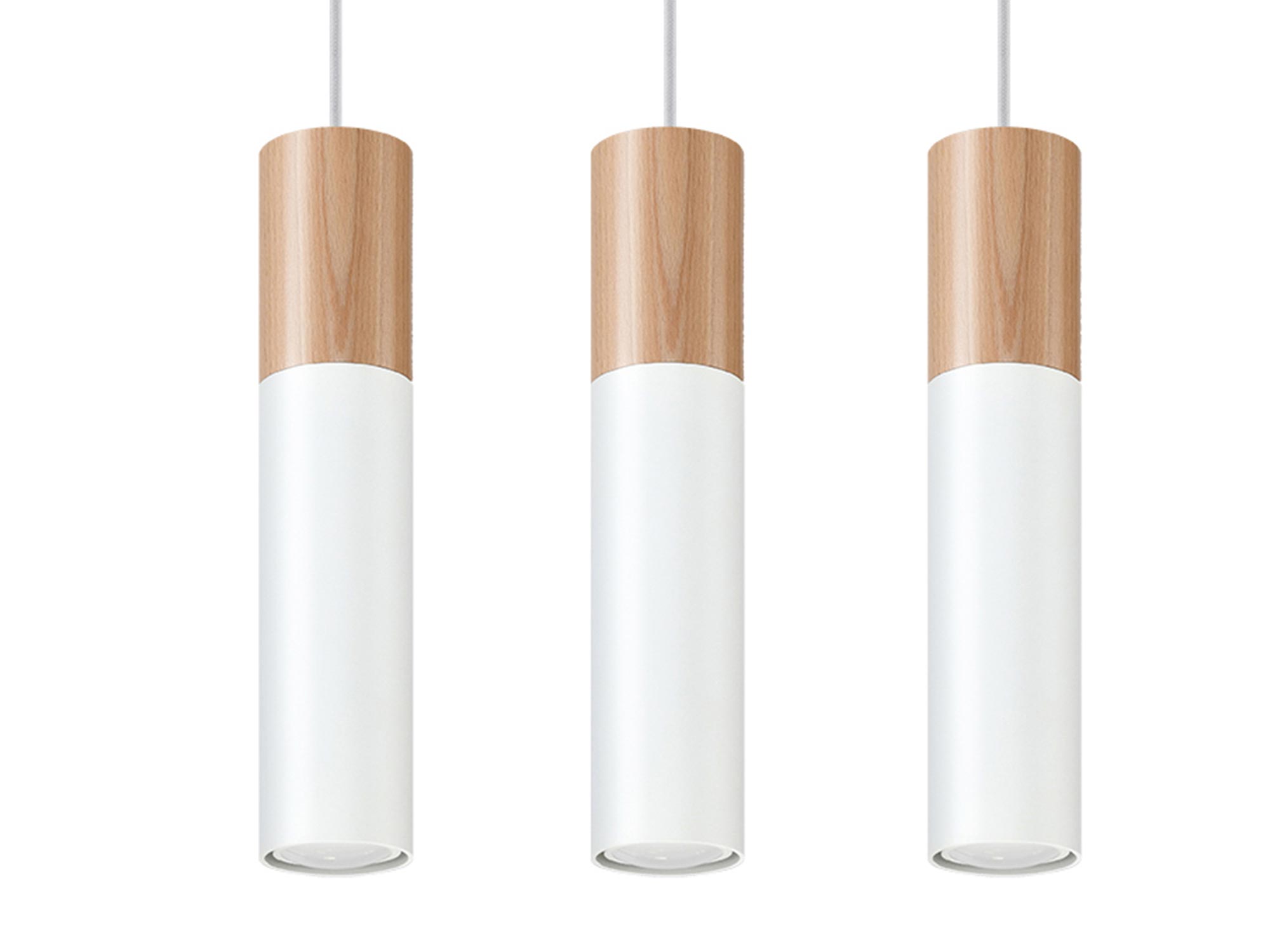 Potrójna lampa wisząca z białym kloszem i drewnianą bazą