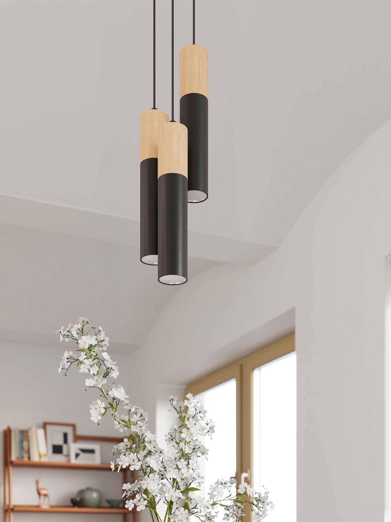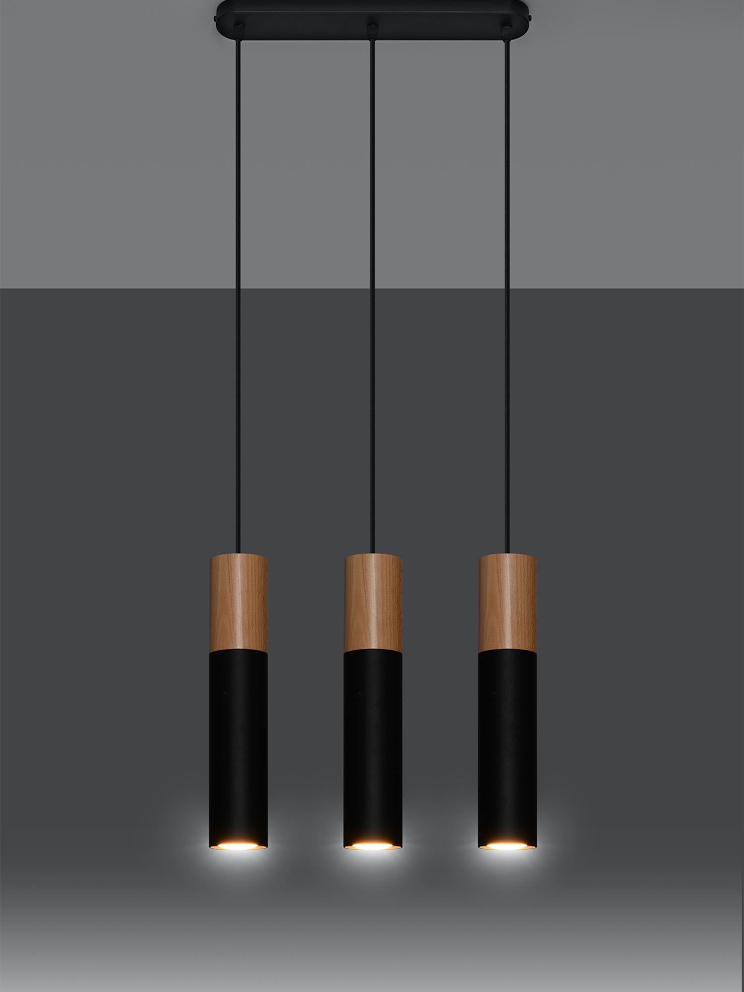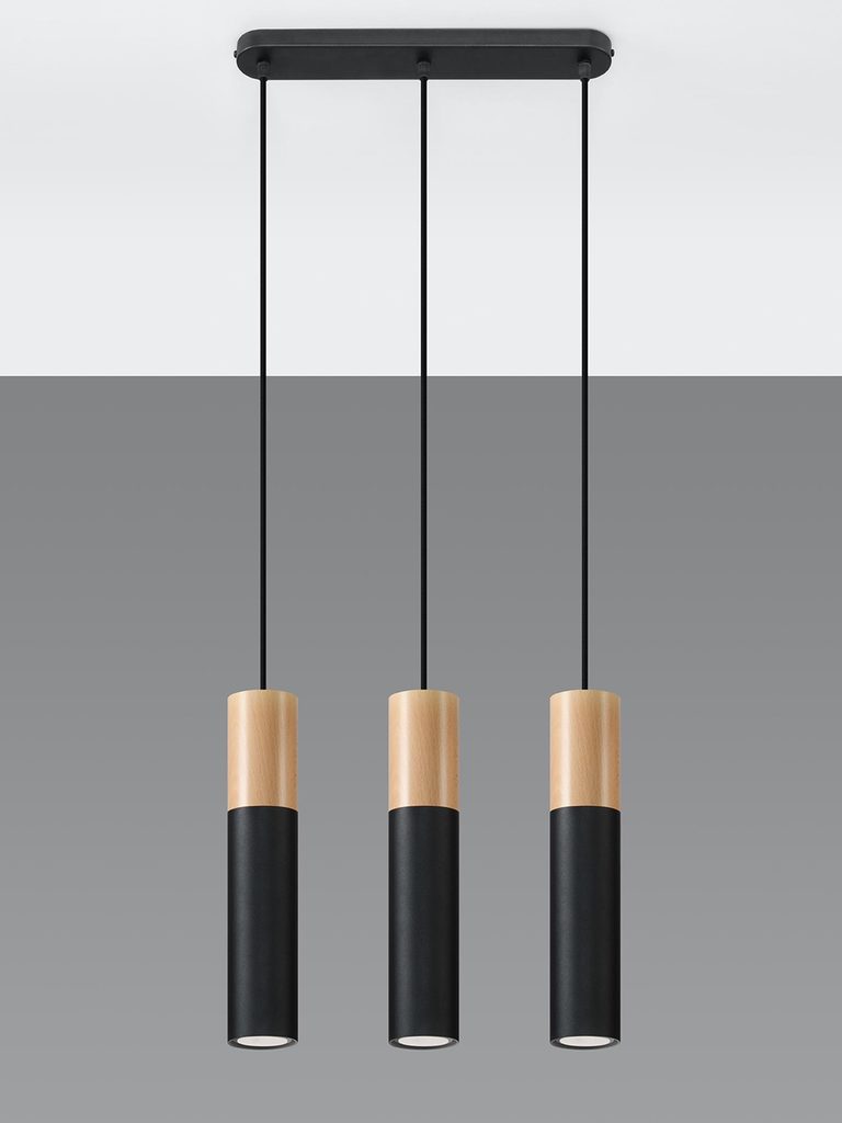 Trzy lampy wiszące czarne z drewnianą oprawą i LED