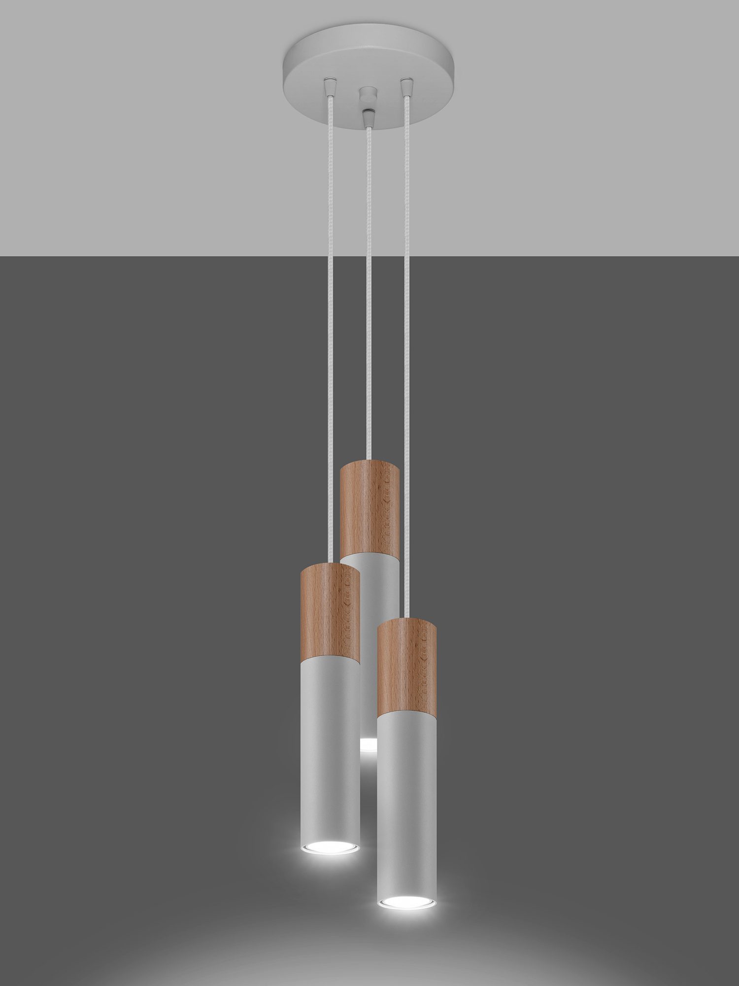 Wisząca lampa LED z trzema białymi tubami i drewnianym wykończeniem
