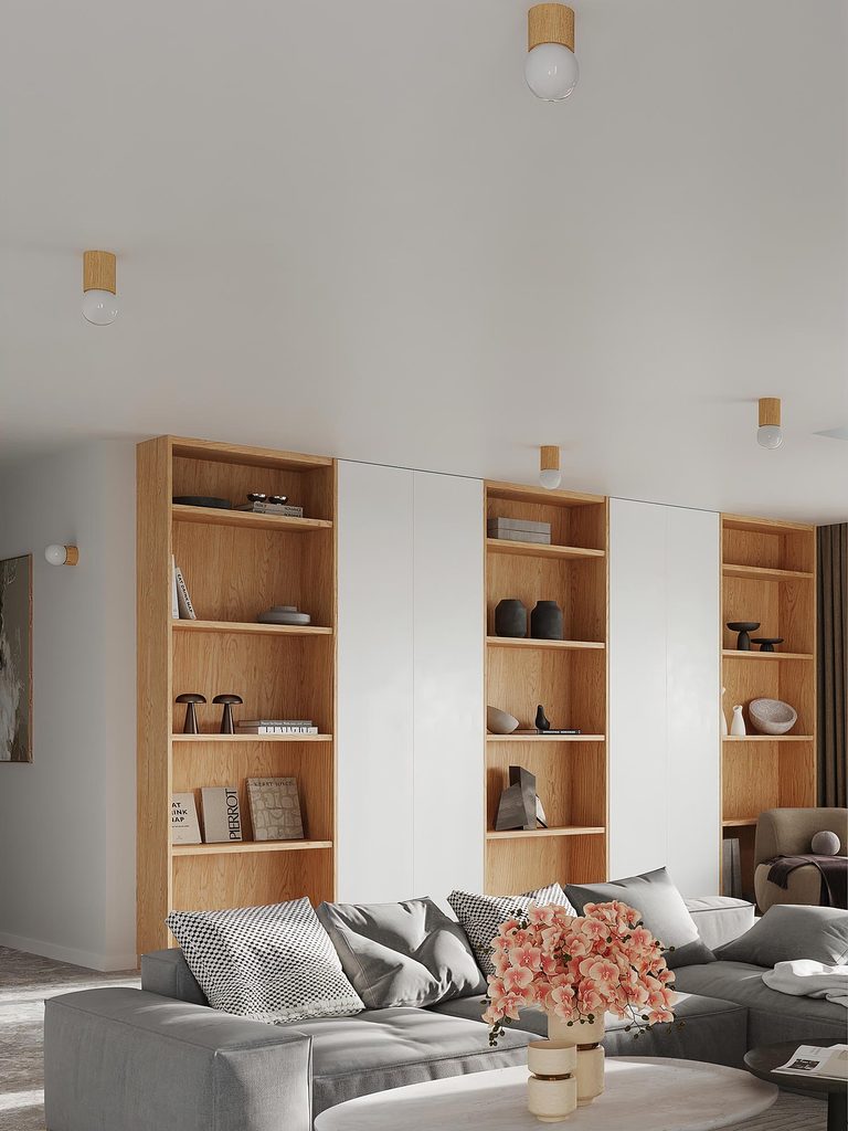 Salon z regałami i lampą dekoracyjną w stylu skandynawskim