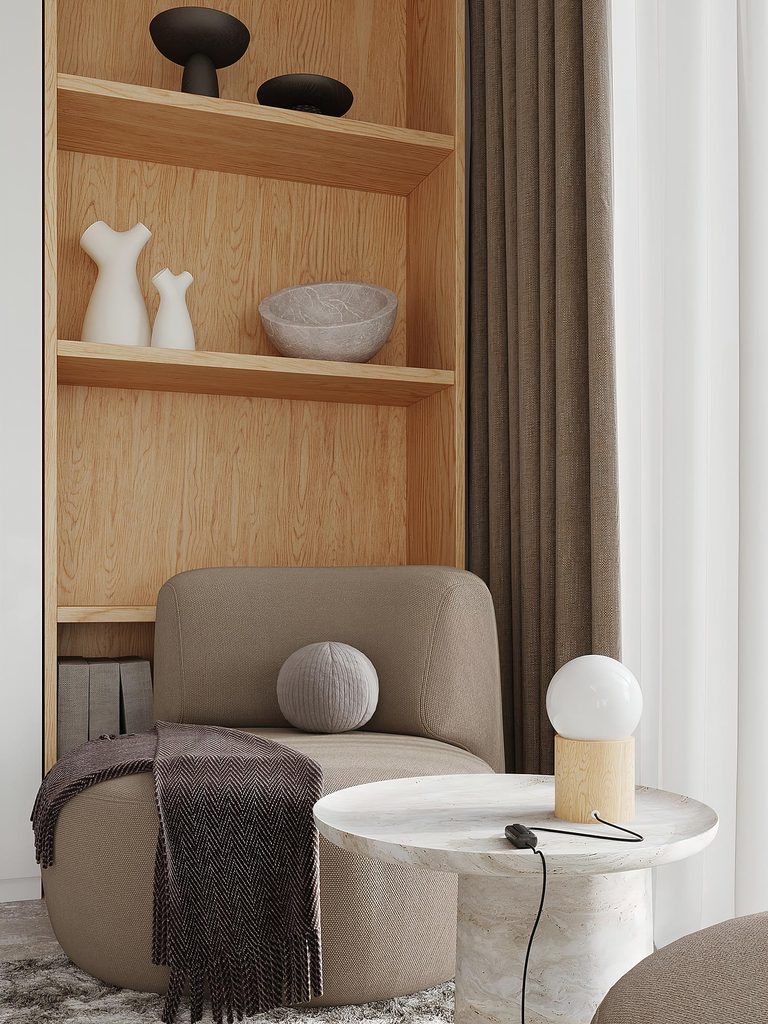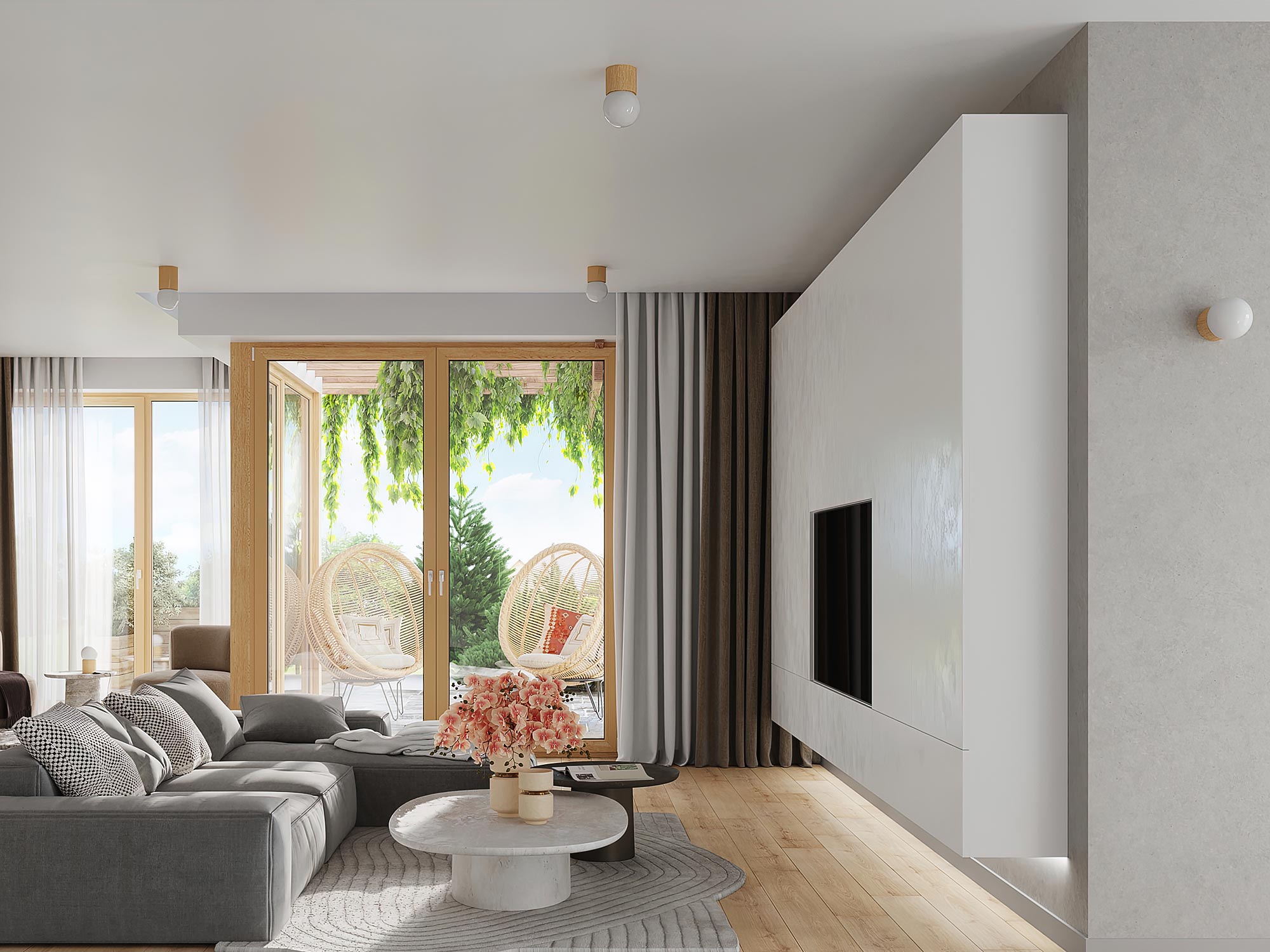 Nowoczesny salon z białymi ścianami i lampą drewnianą