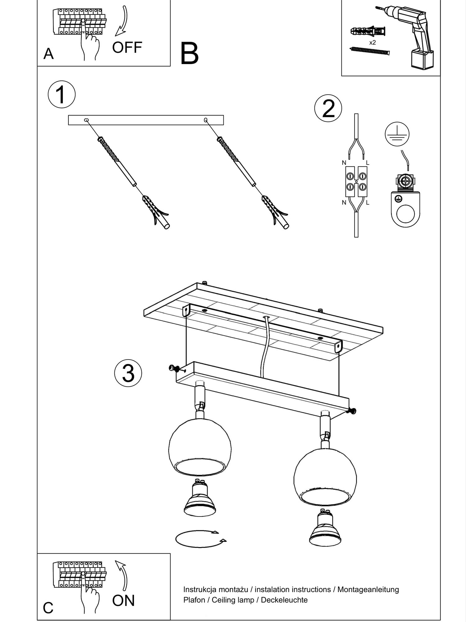 • Źródło światła: GU10, 2x40W, 2x12W LED, 50-60Hz, ~220-230V