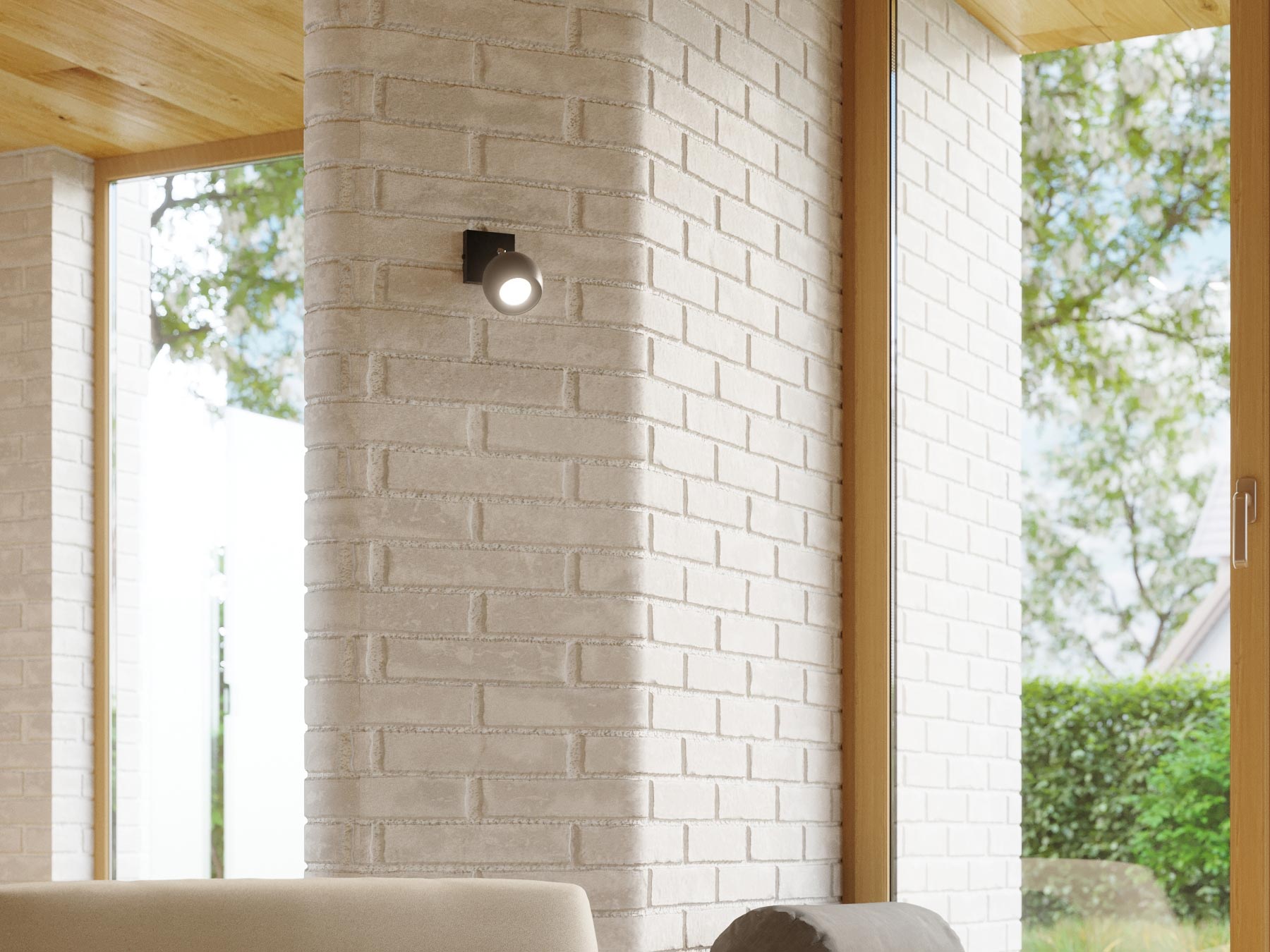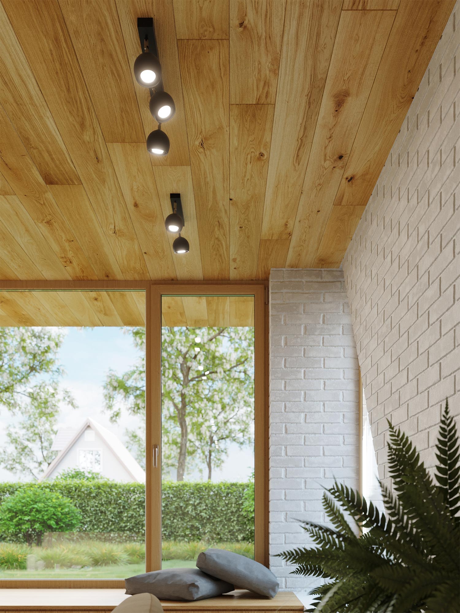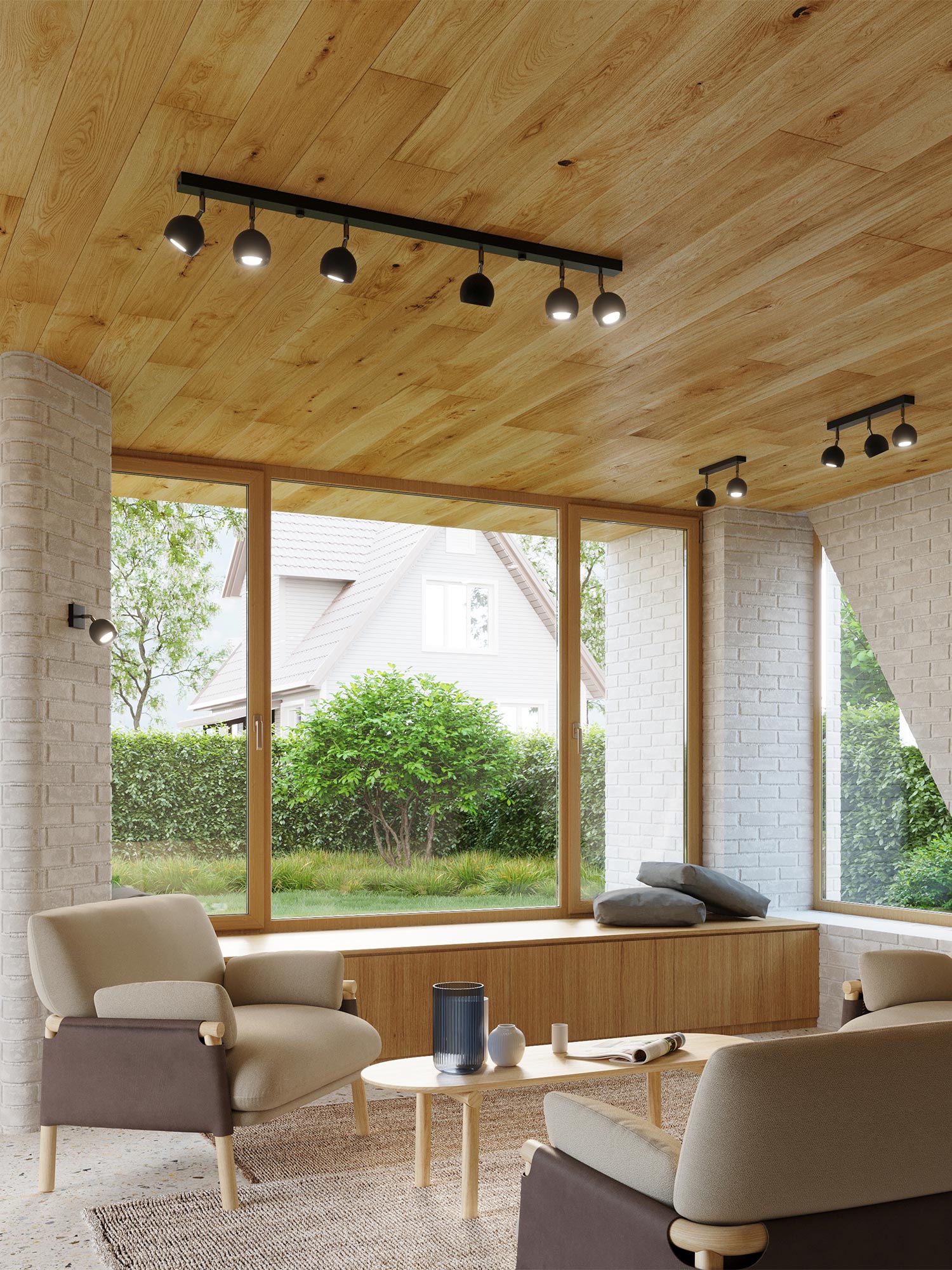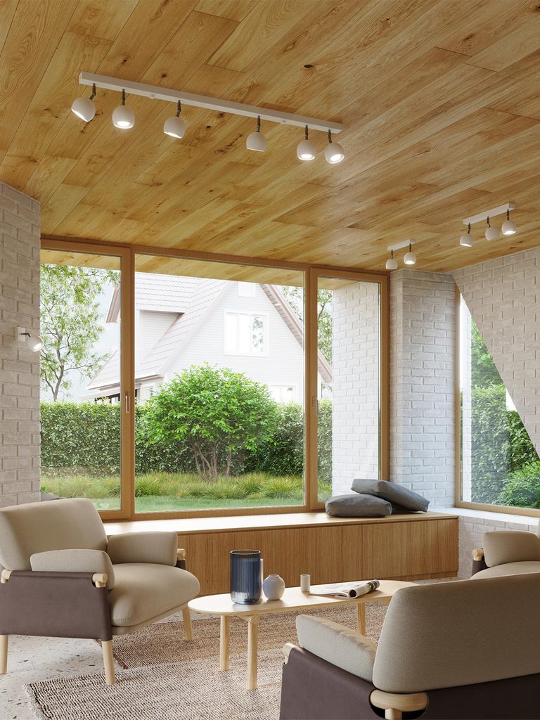 Nowoczesny salon z reflektorami LED i dużym przeszkleniem