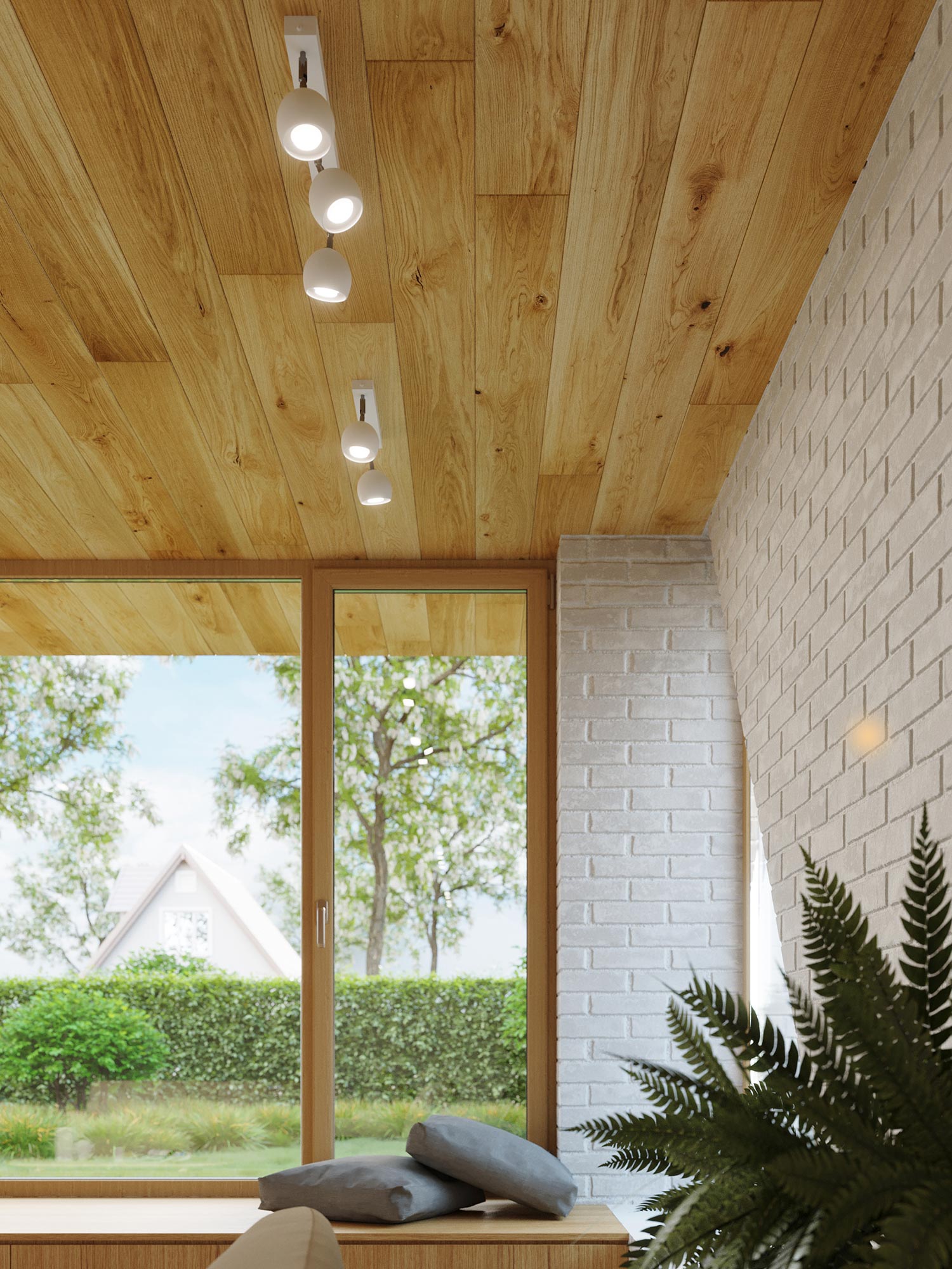 Salon z drewnianym sufitem i reflektorami LED w stylu skandynawskim