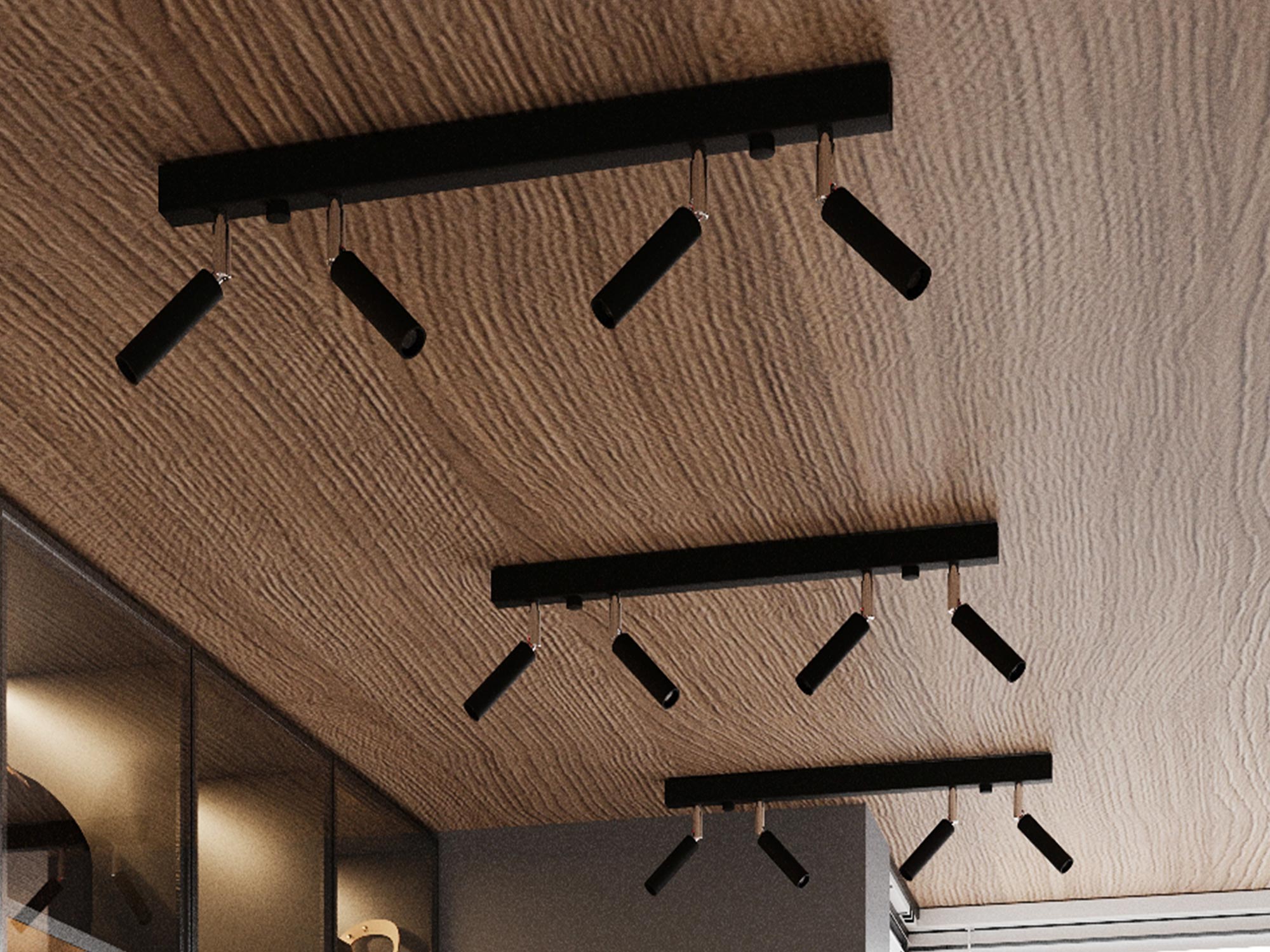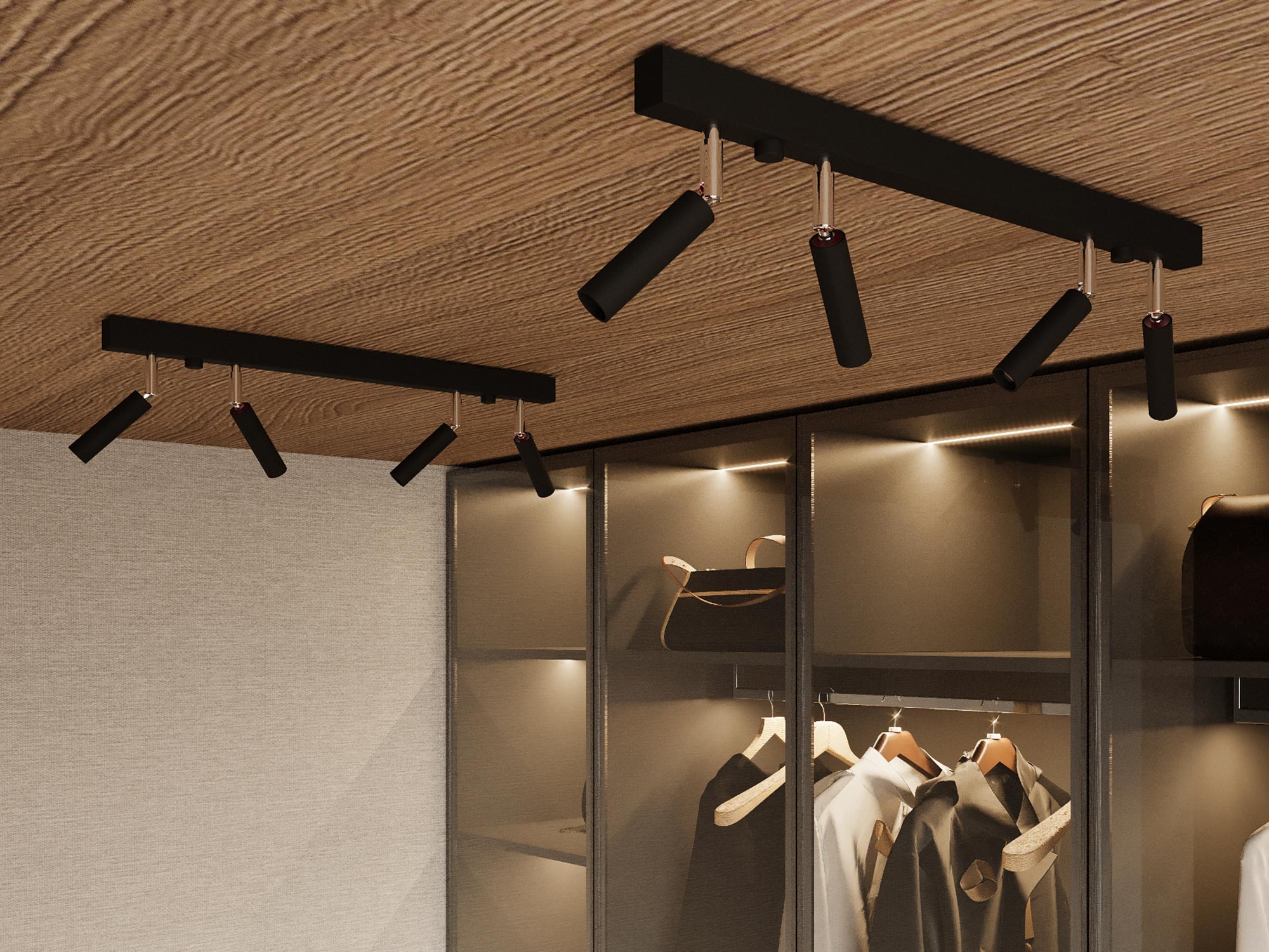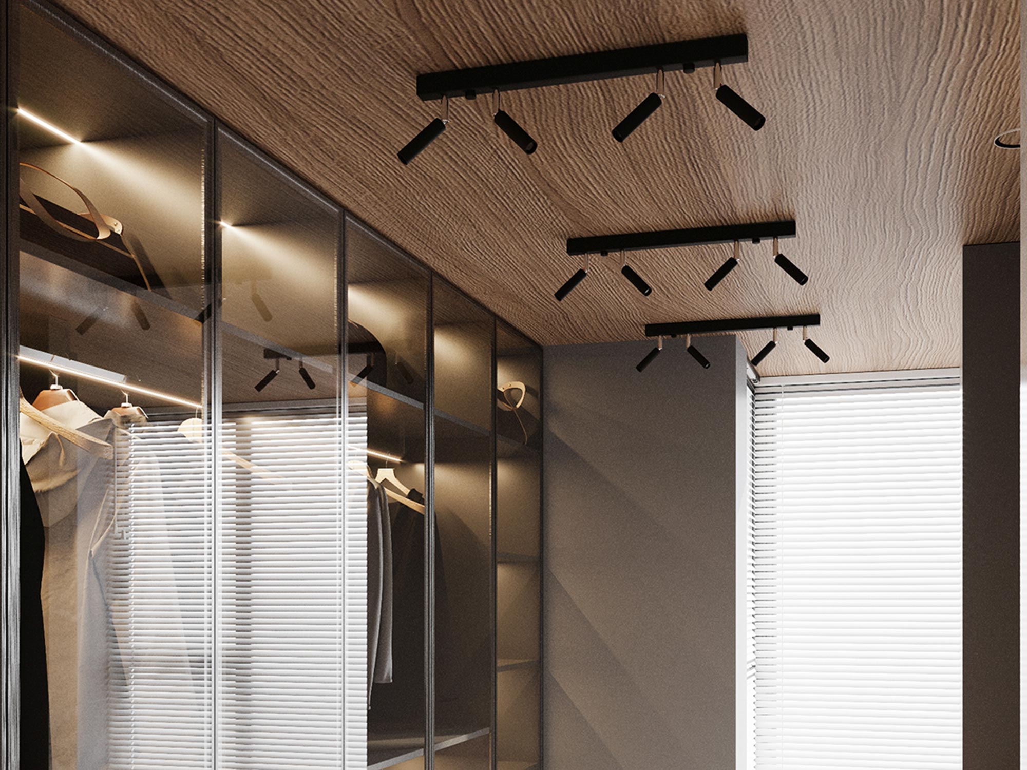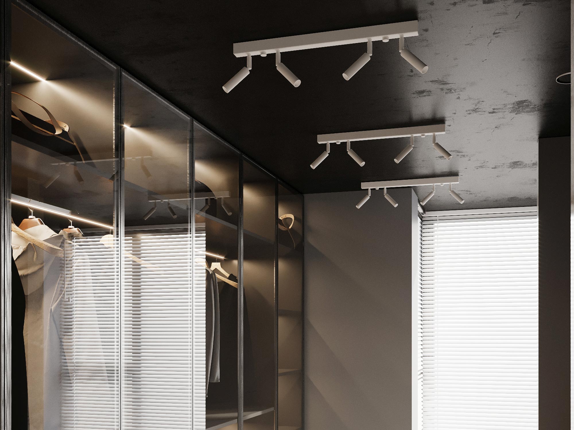 Szynowe oświetlenie LED w garderobie z białymi reflektorami