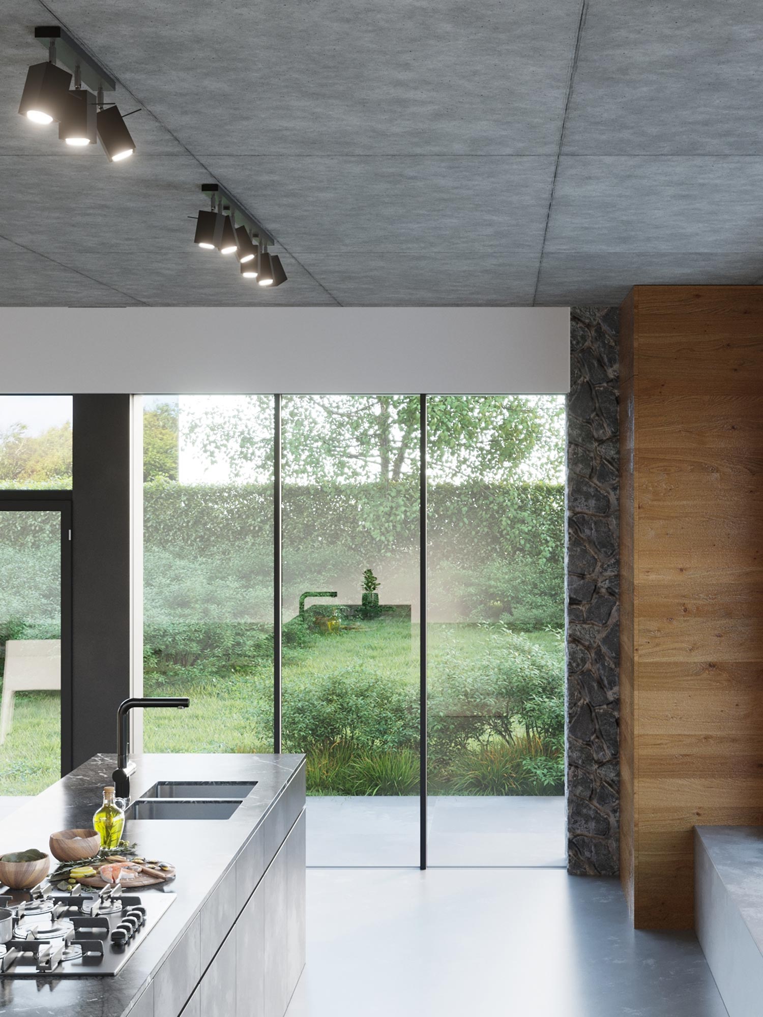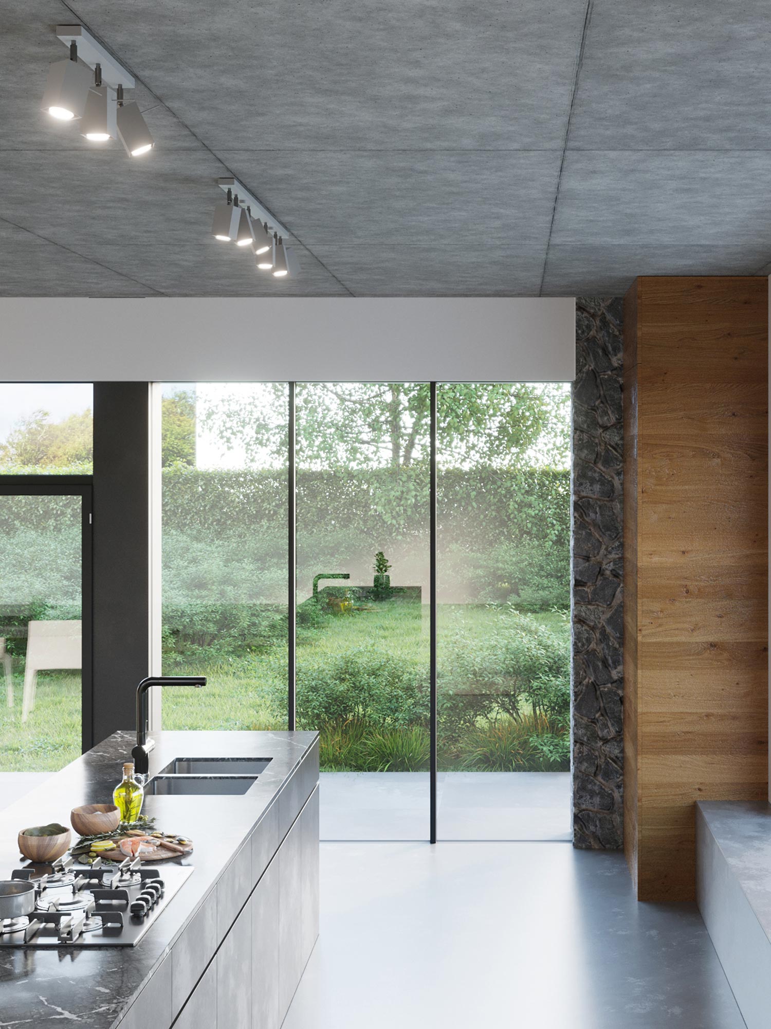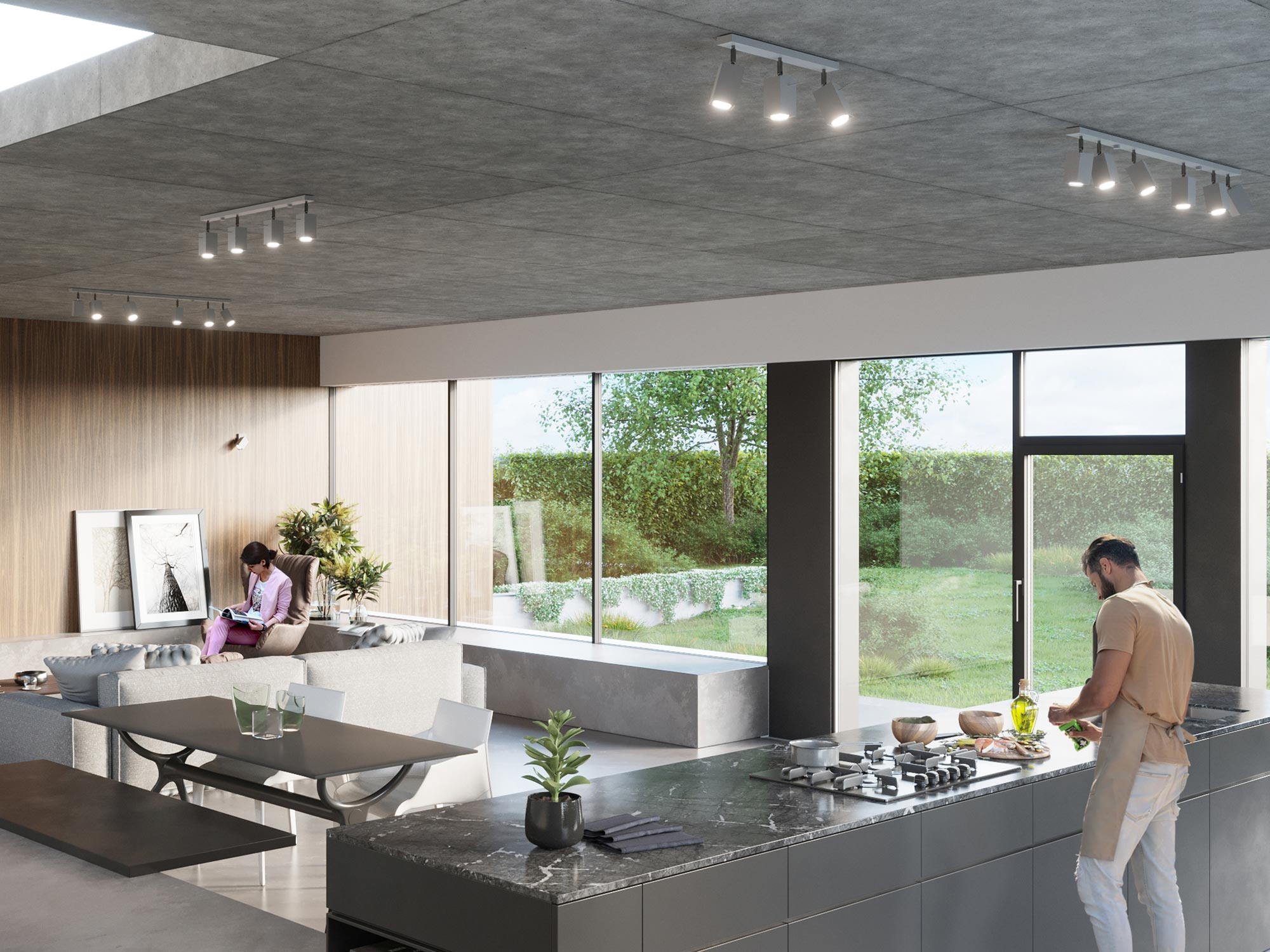 Otwarta przestrzeń z reflektorami LED nad wyspą kuchenną