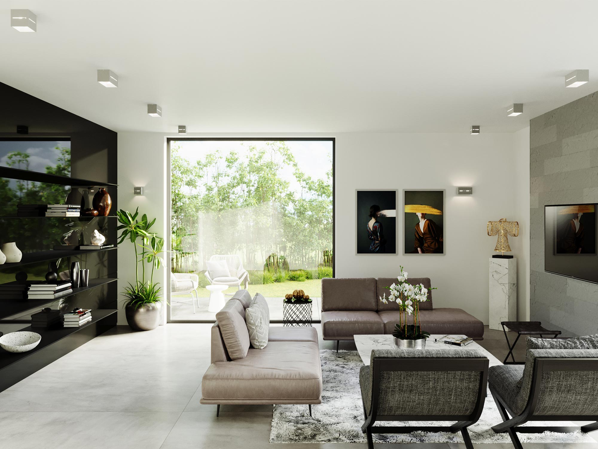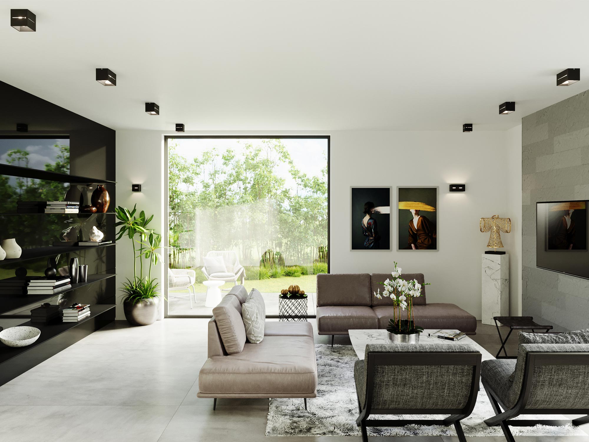 Salon z dużym oknem i czarnym oświetleniem sufitowym LED