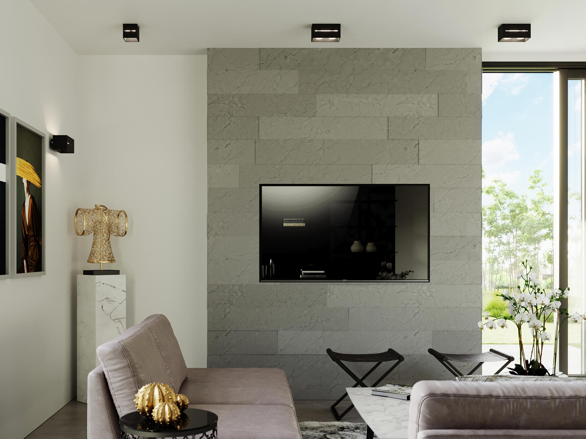 Salon z betonową ścianą i kinkietem LED w industrialnym stylu