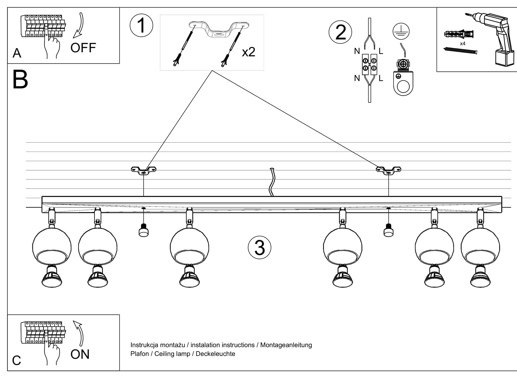 - Źródło światła: GU10, 6x40W, 6x12W LED, 50-60Hz, ~220-230V