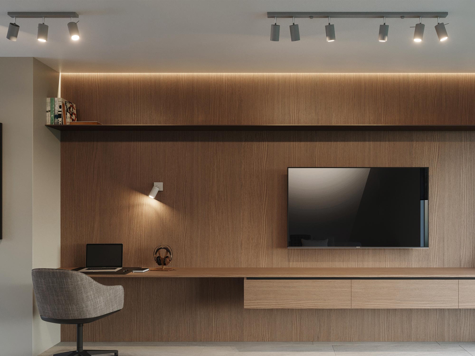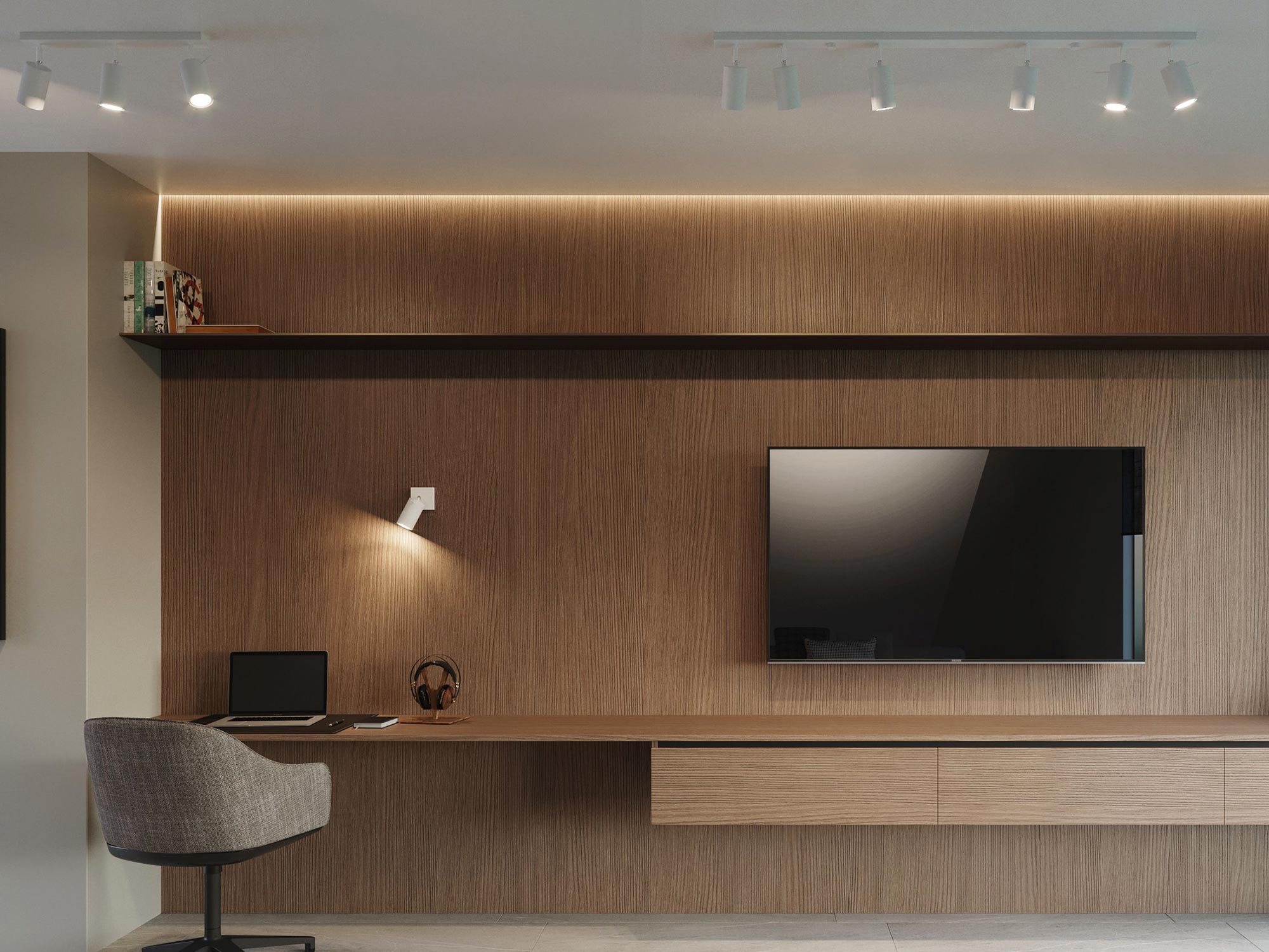 Salon z listwą oświetleniową LED i dekoracyjnym wykończeniem ściany