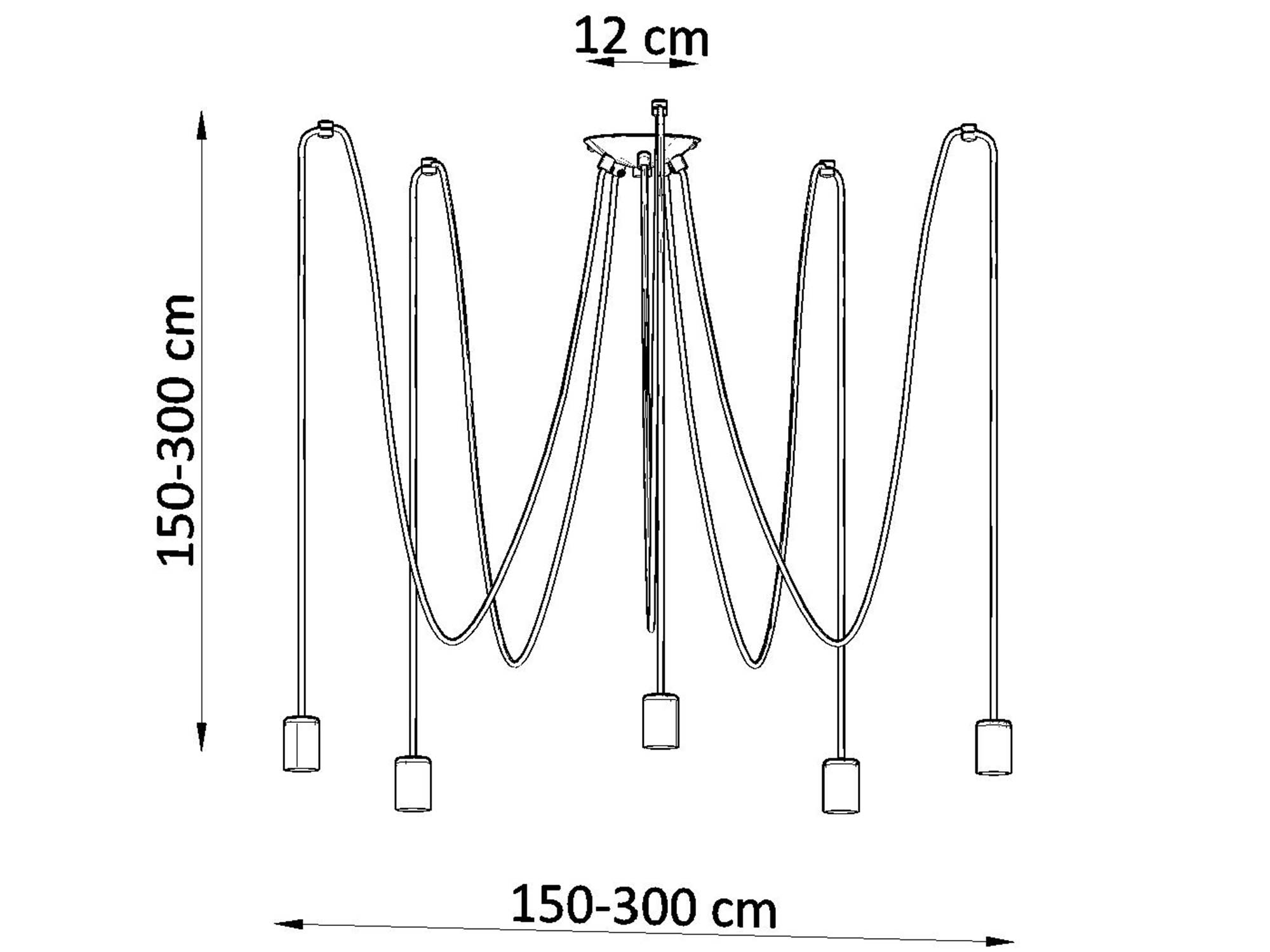 - Wymiary: 300/300/150 cm [max. długość zawiesia 3 m]. Rozmiar żyrandolu pozwala na jego zastosowanie zarówno w dużych, jak i mniejszych pomieszczeniach.