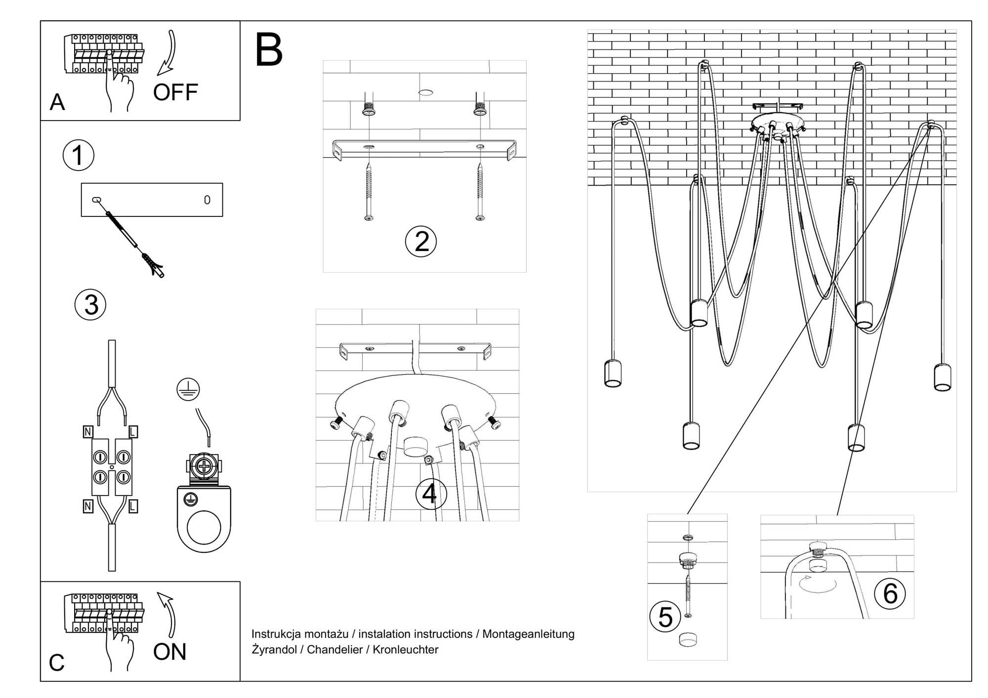 - Waga brutto: 2 kg. Pomimo solidnej konstrukcji, żyrandol jest lekki i łatwy w montażu.