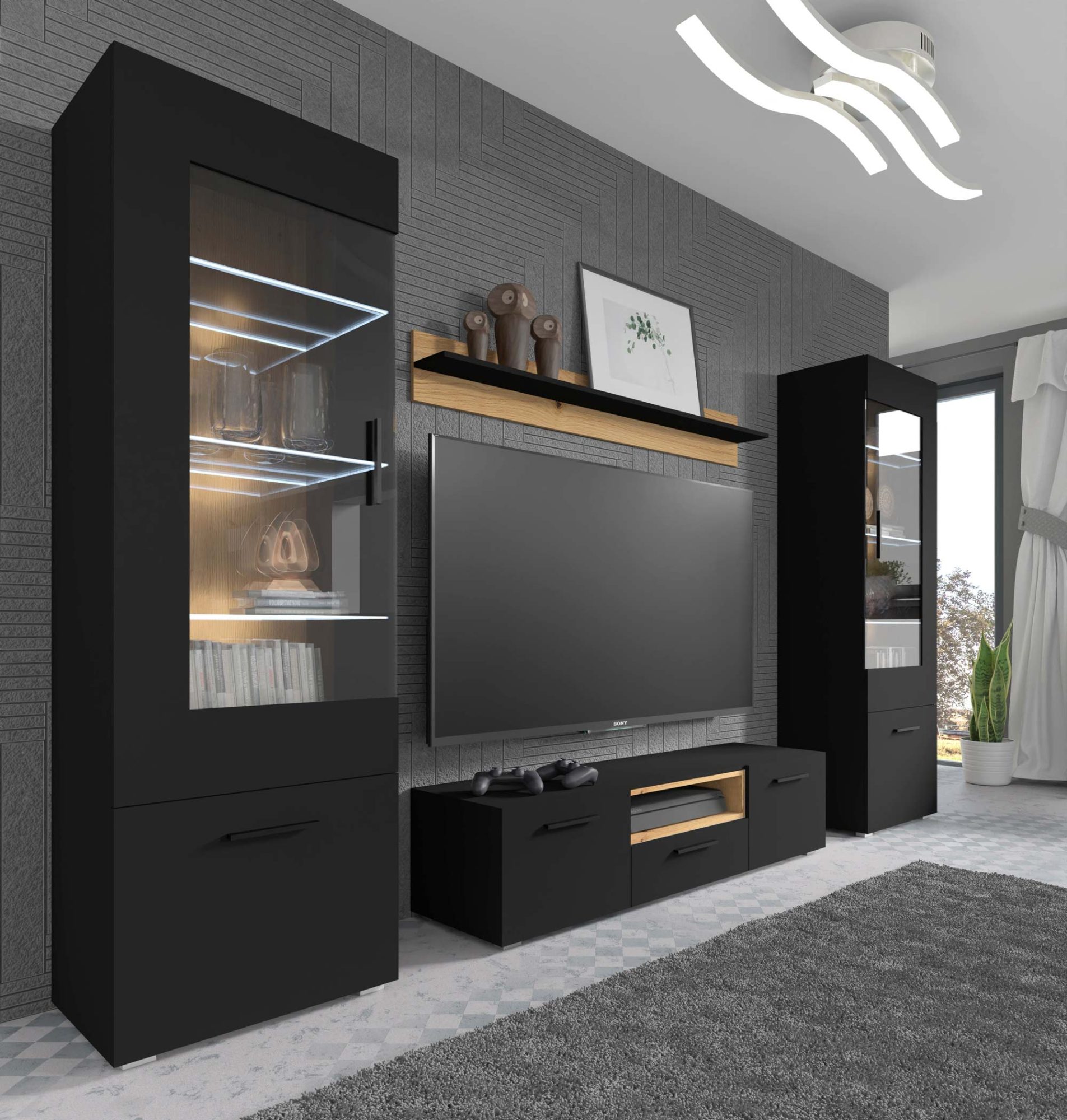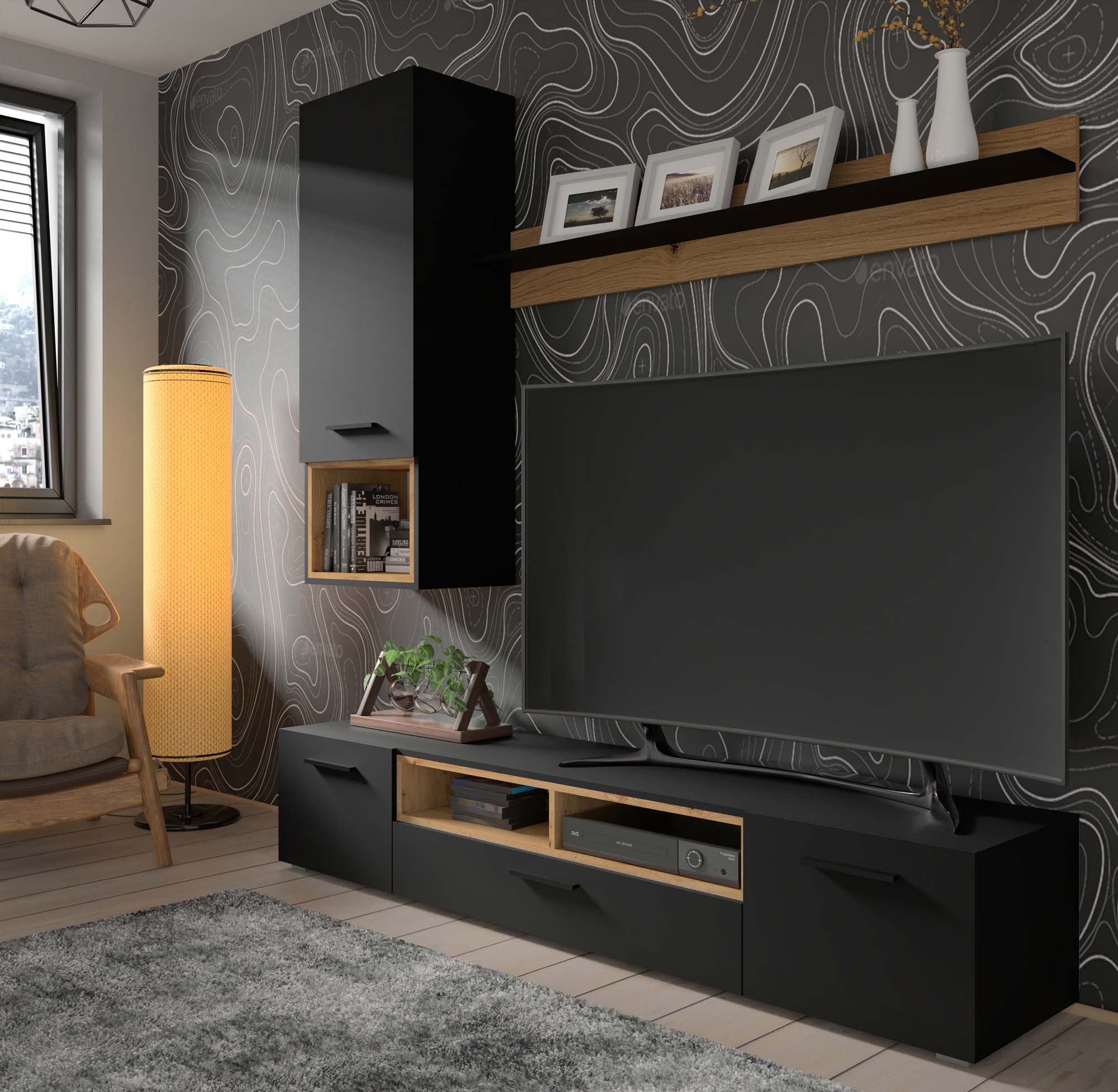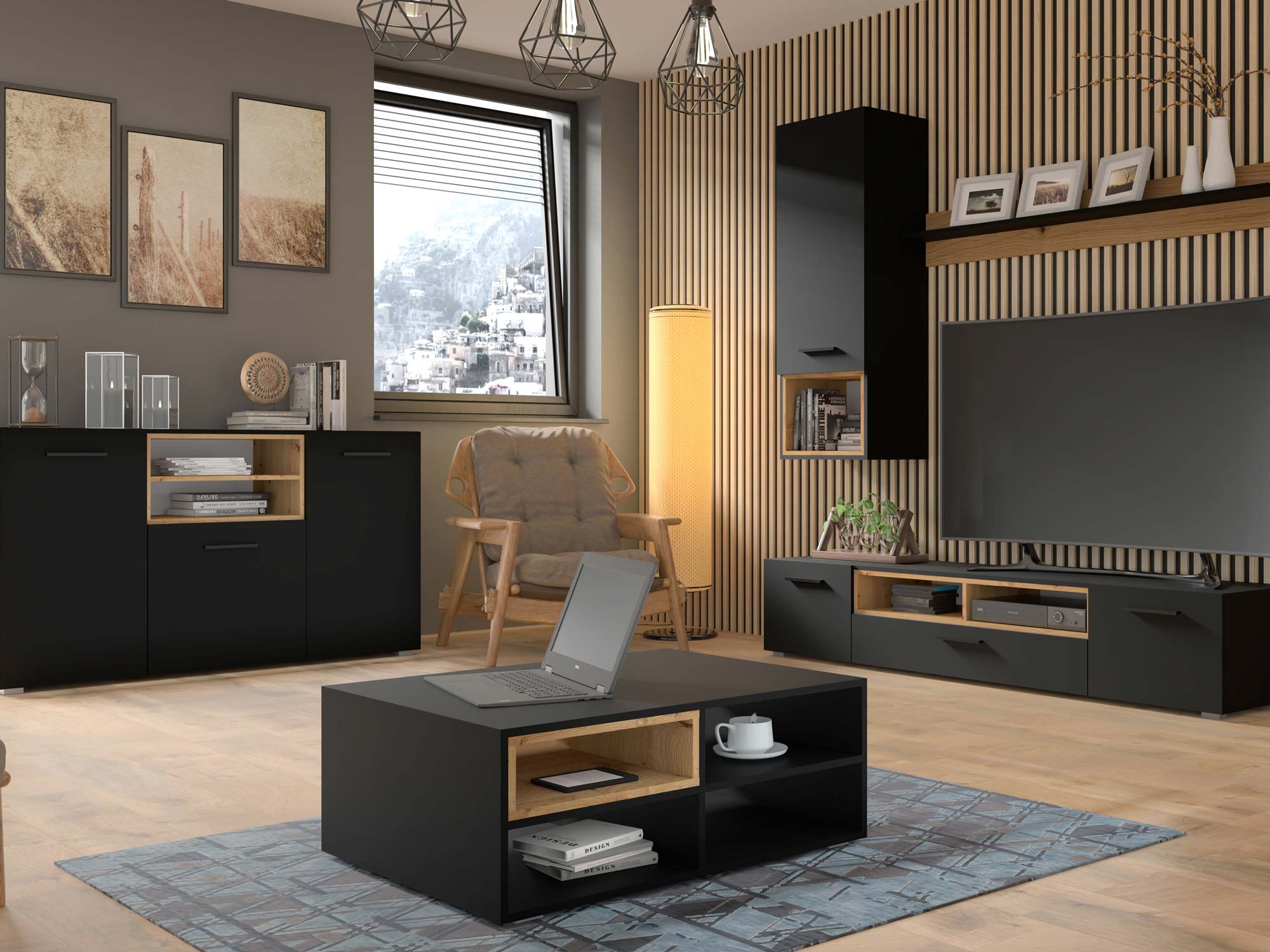 Prezentowana półka wchodzi w skład kolekcji NIMET. Jest to połączenie głębokiej, matowej czerni z odcieniem dąb artisan. Bez wątpienia to wyjątkowe połączenie prezentuje się we wnętrzu niezwykle elegancko i szykownie, co zadowoli nawet najbardziej wymagający gust. Klasyczne bryły, wygodne uchwyty oraz wykończenie z dbałością o każdy szczegół tworzy unikalne meble, które perfekcyjnie sprawdzą się w nowoczesnym wnętrzu. Dodatkowo, meble wykonane są z wysokiej jakości materiałów meblarskich, m.in. płyta laminowana czy płyta HDF. Co więcej zastosowane zostały obrzeża ABS, które dodatkowo chronią produkty przed uszkodzeniami.