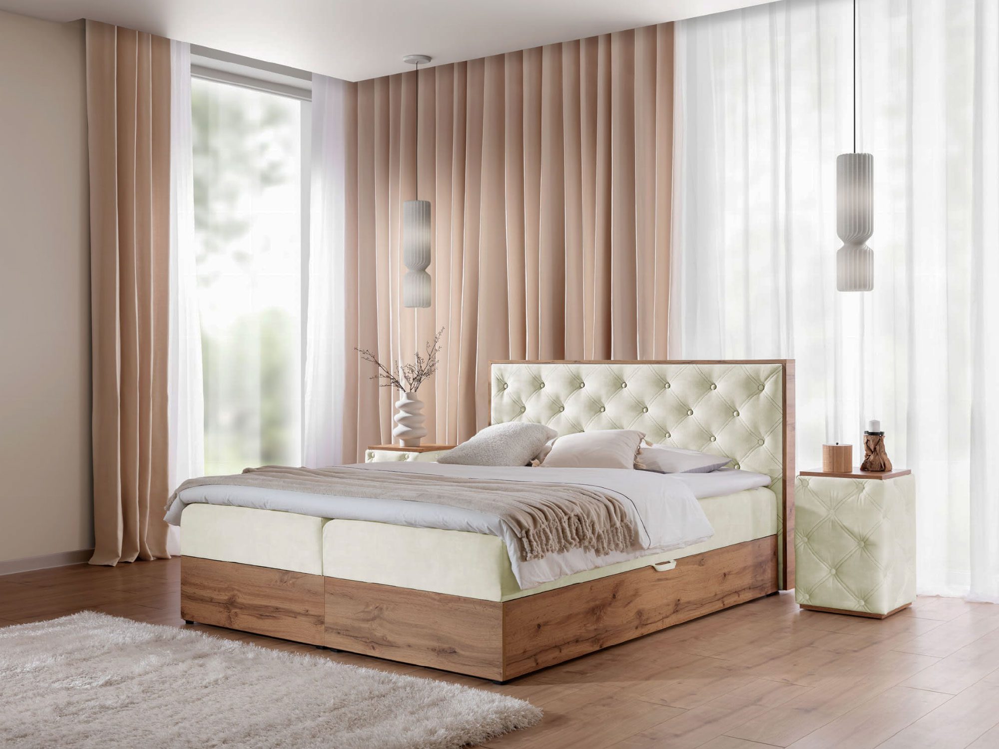 - Materiał: Laminowana płyta w kolorze dąb wotan, pikowanie z guzikami.